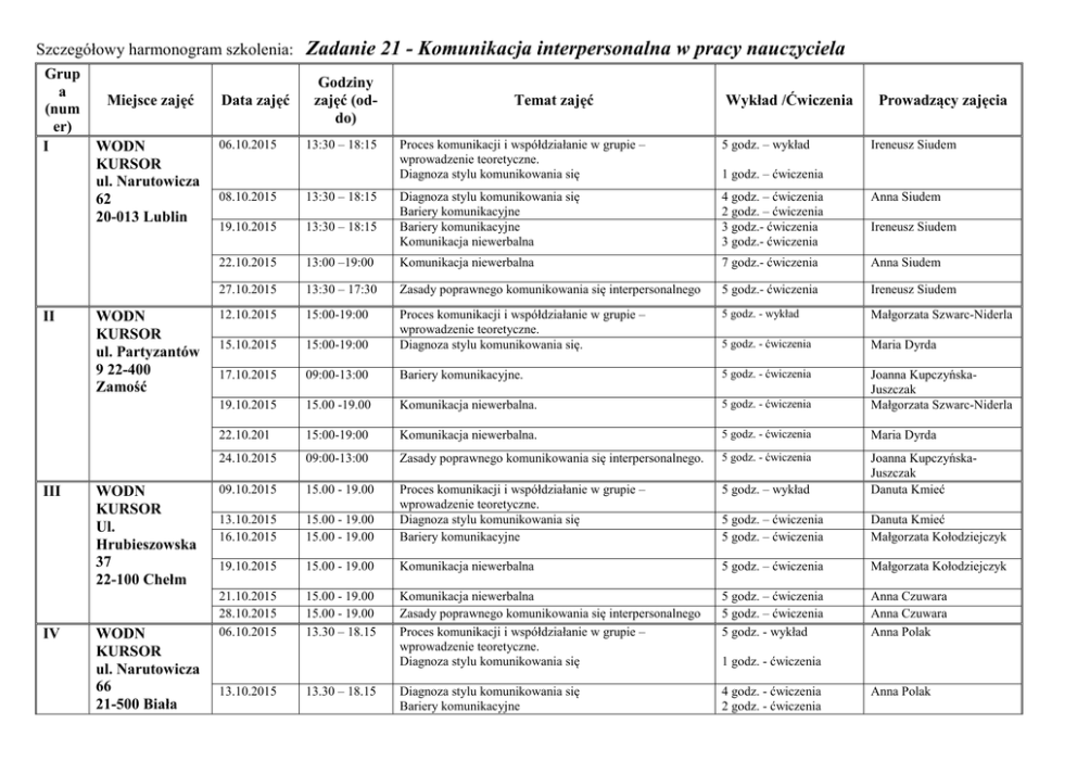 Szczegółowy harmonogram szkolenia: Grup a (num er) I II III IV Miejsce zajęć WODN KURSOR ul. Narutowicza 62 20-013 Lublin WODN KURSOR ul. Partyzantów 9 22-400 Zamość WODN KURSOR Ul. Hrubieszowska 37 22-100 Chełm WODN KURSOR ul. Narutowicza 66 21-500 Biała Data zajęć 06.10.2015 Zadanie 21 - Komunikacja interpersonalna w pracy nauczyciela Godziny zajęć (oddo) 13:30 – 18:15 Temat zajęć Wykład /Ćwiczenia Prowadzący zajęcia Proces komunikacji i współdziałanie w grupie – wprowadzenie teoretyczne. Diagnoza stylu komunikowania się 5 godz. – wykład Ireneusz Siudem Diagnoza stylu komunikowania się Bariery komunikacyjne Bariery komunikacyjne Komunikacja niewerbalna 4 godz. – ćwiczenia 2 godz. – ćwiczenia 3 godz.- ćwiczenia 3 godz.- ćwiczenia Anna Siudem 1 godz. – ćwiczenia 08.10.2015 13:30 – 18:15 19.10.2015 13:30 – 18:15 22.10.2015 13:00 –19:00 Komunikacja niewerbalna 7 godz.- ćwiczenia Anna Siudem 27.10.2015 13:30 – 17:30 Zasady poprawnego komunikowania się interpersonalnego 5 godz.- ćwiczenia Ireneusz Siudem 12.10.2015 15:00-19:00 5 godz. - wykład Małgorzata Szwarc-Niderla 15.10.2015 15:00-19:00 Proces komunikacji i współdziałanie w grupie – wprowadzenie teoretyczne. Diagnoza stylu komunikowania się. 5 godz. - ćwiczenia Maria Dyrda 17.10.2015 09:00-13:00 Bariery komunikacyjne. 5 godz. - ćwiczenia 19.10.2015 15.00 -19.00 Komunikacja niewerbalna. 5 godz. - ćwiczenia Joanna KupczyńskaJuszczak Małgorzata Szwarc-Niderla 22.10.201 15:00-19:00 Komunikacja niewerbalna. 5 godz. - ćwiczenia Maria Dyrda 24.10.2015 09:00-13:00 Zasady poprawnego komunikowania się interpersonalnego. 5 godz. - ćwiczenia 09.10.2015 15.00 - 19.00 5 godz. – wykład 13.10.2015 16.10.2015 15.00 - 19.00 15.00 - 19.00 Proces komunikacji i współdziałanie w grupie – wprowadzenie teoretyczne. Diagnoza stylu komunikowania się Bariery komunikacyjne Joanna KupczyńskaJuszczak Danuta Kmieć 5 godz. – ćwiczenia 5 godz. – ćwiczenia Danuta Kmieć Małgorzata Kołodziejczyk 19.10.2015 15.00 - 19.00 Komunikacja niewerbalna 5 godz. – ćwiczenia Małgorzata Kołodziejczyk 21.10.2015 28.10.2015 06.10.2015 15.00 - 19.00 15.00 - 19.00 13.30 – 18.15 Komunikacja niewerbalna Zasady poprawnego komunikowania się interpersonalnego Proces komunikacji i współdziałanie w grupie – wprowadzenie teoretyczne. Diagnoza stylu komunikowania się 5 godz. – ćwiczenia 5 godz. – ćwiczenia 5 godz. - wykład Anna Czuwara Anna Czuwara Anna Polak Diagnoza stylu komunikowania się Bariery komunikacyjne 4 godz. - ćwiczenia 2 godz. - ćwiczenia 13.10.2015 13.30 – 18.15 Ireneusz Siudem 1 godz. - ćwiczenia Anna Polak Podlaska 20.10.2015 13.30 – 18.15 Bariery komunikacyjne Komunikacja niewerbalna 3 godz. - ćwiczenia 3 godz. - ćwiczeni Anna Polak 27.10.2015 13.30 – 18.15 Komunikacja niewerbalna 6 godz. - ćwiczenia Anna Polak 03.11.2015 13.30 – 18.15 Komunikacja niewerbalna Zasady poprawnego komunikowania się interpersonalnego 1 godz. - ćwiczenia 5 godz. - ćwiczenia Anna Polak