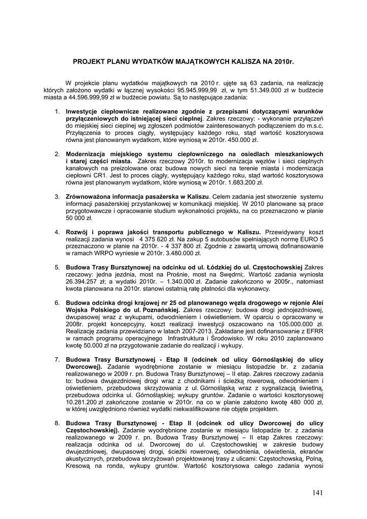 PROJEKT PLANU WYDATKÓW MAJĄTKOWYCH KALISZA NA 2010r. W projekcie planu wydatków majątkowych na 2010 r. ujęte są 63 zadania, na realizację których założono wydatki w łącznej wysokości 95.945.999,99 zł, w tym 51.349.000 zł w budżecie miasta a 44.596.999,99 zł w budżecie powiatu. Są to następujące zadania: 1. Inwestycje ciepłownicze realizowane zgodnie z przepisami dotyczącymi warunków przyłączeniowych do istniejącej sieci cieplnej. Zakres rzeczowy: - wykonanie przyłączeń do miejskiej sieci cieplnej wg zgłoszeń podmiotów zainteresowanych podłączeniem do m.s.c. Przyłączenia to proces ciągły, występujący każdego roku, stąd wartość kosztorysowa równa jest planowanym wydatkom, które wyniosą w 2010r. 450.000 zł. 2. Modernizacja miejskiego systemu ciepłowniczego na osiedlach mieszkaniowych i starej części miasta. Zakres rzeczowy 2010r. to modernizacja węzłów i sieci cieplnych kanałowych na preizolowane oraz budowa nowych sieci na terenie miasta i modernizacja ciepłowni CR1. Jest to proces ciągły, występujący każdego roku, stąd wartość kosztorysowa równa jest planowanym wydatkom, które wyniosą w 2010r. 1.683.200 zł. 3. Zrównoważona informacja pasażerska w Kaliszu. Celem zadania jest stworzenie systemu informacji pasażerskiej przystankowej w komunikacji miejskiej. W 2010 planowane są prace przygotowawcze i opracowanie studium wykonalności projektu, na co przeznaczono w planie 50 000 zł. 4. Rozwój i poprawa jakości transportu publicznego w Kaliszu. Przewidywany koszt realizacji zadania wynosi 4 375 620 zł. Na zakup 5 autobusów spełniających normę EURO 5 przeznaczono w planie na 2010r. - 4 337 800 zł. Zgodnie z zawartą umową dofinansowanie w ramach WRPO wyniesie w 2010r. 3.480.000 zł. 5. Budowa Trasy Bursztynowej na odcinku od ul. Łódzkiej do ul. Częstochowskiej Zakres rzeczowy: jedna jezdnia, most na Prośnie, most na Swędrni;. Wartość zadania wyniosła 26.394.257 zł; a wydatki 2010r. – 1.340.000 zł. Zadanie zakończono w 2005r., natomiast kwota planowana na 2010r. stanowi ostatnią ratę płatności dla wykonawcy. 6. Budowa odcinka drogi krajowej nr 25 od planowanego węzła drogowego w rejonie Alei Wojska Polskiego do ul. Poznańskiej. Zakres rzeczowy: budowa drogi jednojezdniowej, dwupasowej wraz z wykupami, odwodnieniem i oświetleniem. W oparciu o opracowany w 2008r. projekt koncepcyjny, koszt realizacji inwestycji oszacowano na 105.000.000 zł. Realizację zadania przewidziano w latach 2007-2013. Zakładane jest dofinansowanie z EFRR w ramach programu operacyjnego Infrastruktura i Środowisko. W roku 2010 zaplanowano kwotę 50.000 zł na przygotowanie zadanie do realizacji i wykupy. 7. Budowa Trasy Bursztynowej - Etap II (odcinek od ulicy Górnośląskiej do ulicy Dworcowej). Zadanie wyodrębnione zostanie w miesiącu listopadzie br. z zadania realizowanego w 2009 r. pn. Budowa Trasy Bursztynowej – II etap. Zakres rzeczowy zadania to: budowa dwujezdniowej drogi wraz z chodnikami i ścieżką rowerową, odwodnieniem i oświetleniem, przebudowa skrzyżowania z ul. Górnośląską wraz z sygnalizacją świetlną, przebudowa odcinka ul. Górnośląskiej; wykupy gruntów. Zadanie o wartości kosztorysowej 10.281.200 zł zakończone zostanie w 2010r. na co w planie założono kwotę 480 000 zł, w której uwzględniono również wydatki niekwalifikowane nie objęte projektem. 8. Budowa Trasy Bursztynowej - Etap II (odcinek od ulicy Dworcowej do ulicy Częstochowskiej). Zadanie wyodrębnione zostanie w miesiącu listopadzie br. z zadania realizowanego w 2009 r. pn. Budowa Trasy Bursztynowej – II etap Zakres rzeczowy: realizacja odcinka od ul. Dworcowej do ul. Częstochowskiej w zakresie budowy dwujezdniowej, dwupasowej drogi, ścieżki rowerowej, odwodnienia, oświetlenia, ekranów akustycznych, przebudowa skrzyżowań projektowanej trasy z ulicami: Częstochowską, Polną, Kresową na ronda, wykupy gruntów. Wartość kosztorysowa całego zadania wynosi 141 58.500.000 zł, a planowane wydatki 2010r. – to 29.999.999,99 zł. Na zadanie uzyskano dofinansowanie w ramach Wielkopolskiego Regionalnego Programu Operacyjnego. Zgodnie z umową podpisaną z Urzędem Marszałkowskim, pomoc unijna wyniesie w 2010 r. 18.289.056,36 zł. Zadanie realizowane będzie do 2011r. 9. Przebudowa wiaduktu kolejowego przy ul. Zachodniej. W 2010r. opracowanie projektu budowlanego i wykonawczego oraz uzyskanie wszystkich niezbędnych uzgodnień i pozwoleń na jego przebudowę. Kwota przeznaczona w planie 80.000 zł. 10. Połączenie dróg krajowych na odcinku od ul. Godebskiego do ul. Łódzkiej. Zakres zadania obejmuje budowę i przebudowę dróg na odcinku od ul. Godebskiego do ul. Łódzkiej W ramach zadania zakończono w 2009 przebudowę skrzyżowania ul. Stawiszyńskiej (droga krajowa nr 25) z ul. Godebskiego (droga wojewódzka 450) na rondo. Kolejny etap obejmuje przebudowę skrzyżowania ul. Stawiszyńskiej z ul. Włókniarzy na rondo, budowę odcinka jezdni, chodników, ścieżki pieszo - rowerowej do ul. Szerokiej, jezdni obsługującej dojazd do posesji przy ul. Włókniarzy wraz z odwodnieniem, oświetleniem, usunięciem kolizji z infrastrukturą podziemną. Wydatki 2010r. planowane są w wysokości 1.500.000 zł. Całkowity koszt realizacji wyniesie ca 45.358.300 zł a zakończenie robót przewidziane jest na 2017. 11. Budowa mostu na Swędrni i modernizacja ul. Łódzkiej na odcinku od mostu do granic miasta. Zakres rzeczowy zadania: budowa mostu, budowa tymczasowej przeprawy, przebudowa nawierzchni jezdni od mostu do granicy miasta wraz z odwodnieniem, oświetleniem, chodnikiem i ścieżką rowerową. Koszt realizacji zadania wyniesie ca 13.750.000 zł, z czego 100.000 zł zaplanowano na 2010r. Przewidywany termin zakończenia to rok 2012 pod warunkiem pozyskania zakładanego dofinansowania zewnętrznego. 12. Budowa ronda na skrzyżowaniu ul. Podmiejskiej i Dobrzeckiej wraz z wyprofilowaniem przebiegu drogi. Za