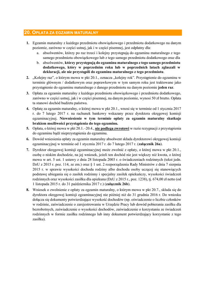 20. OPŁATA ZA EGZAMIN MATURALNY 1. Egzamin maturalny z każdego przedmiotu obowiązkowego i przedmiotu dodatkowego na danym poziomie, zarówno w części ustnej, jak i w części pisemnej, jest odpłatny dla: a. absolwentów, którzy po raz trzeci i kolejny przystępują do egzaminu maturalnego z tego samego przedmiotu obowiązkowego lub z tego samego przedmiotu dodatkowego oraz dla b. absolwentów, którzy przystępują do egzaminu maturalnego z tego samego przedmiotu dodatkowego, który w poprzednim roku lub w poprzednich latach zgłaszali w deklaracji, ale nie przystąpili do egzaminu maturalnego z tego przedmiotu. 2. „Kolejny raz”, o którym mowa w pkt 20.1., oznacza „kolejny rok”. Przystąpienie do egzaminu w terminie głównym / dodatkowym oraz poprawkowym w tym samym roku jest traktowane jako przystąpienie do egzaminu maturalnego z danego przedmiotu na danym poziomie jeden raz. 3. Opłata za egzamin maturalny z każdego przedmiotu obowiązkowego i przedmiotu dodatkowego, zarówno w części ustnej, jak i w części pisemnej, na danym poziomie, wynosi 50 zł brutto. Opłata ta stanowi dochód budżetu państwa. 4. Opłatę za egzamin maturalny, o której mowa w pkt 20.1., wnosi się w terminie od 1 stycznia 2017 r. do 7 lutego 2017 r. na rachunek bankowy wskazany przez dyrektora okręgowej komisji egzaminacyjnej. Niewniesienie w tym terminie opłaty za egzamin maturalny skutkuje brakiem możliwości przystąpienia do tego egzaminu. 5. Opłata, o której mowa w pkt 20.1.–20.4., nie podlega zwrotowi w razie rezygnacji z przystąpienia do egzaminu bądź nieprzystąpienia do egzaminu. 6. Dowód wniesienia opłaty za egzamin maturalny absolwent składa dyrektorowi okręgowej komisji egzaminacyjnej w terminie od 1 stycznia 2017 r. do 7 lutego 2017 r. (załącznik 26a). 7. Dyrektor okręgowej komisji egzaminacyjnej może zwolnić z opłaty, o której mowa w pkt 20.1., osobę o niskim dochodzie, na jej wniosek, jeżeli ten dochód nie jest większy niż kwota, o której mowa w art. 5 ust. 1 ustawy z dnia 28 listopada 2003 r. o świadczeniach rodzinnych (tekst jedn. DzU z 2015 r. poz. 114, ze zm.) oraz § 1 ust. 2 rozporządzenia Rady Ministrów z dnia 7 sierpnia 2015 r. w sprawie wysokości dochodu rodziny albo dochodu osoby uczącej się stanowiących podstawę ubiegania się o zasiłek rodzinny i specjalny zasiłek opiekuńczy, wysokości świadczeń rodzinnych oraz wysokości zasiłku dla opiekuna (DzU z 2015 r., poz. 1238), tj. 674,00 zł netto (od 1 listopada 2015 r. do 31 października 2017 r.) (załącznik 26b). 8. Wniosek o zwolnienie z opłaty za egzamin maturalny, o którym mowa w pkt 20.7., składa się do dyrektora okręgowej komisji egzaminacyjnej nie później niż do 31 grudnia 2016 r. Do wniosku dołącza się dokumenty potwierdzające wysokość dochodów (np. oświadczenie o liczbie członków w rodzinie, zaświadczenie o zarejestrowaniu w Urzędzie Pracy lub dowód pobierania zasiłku dla bezrobotnych, zaświadczenie o wysokości dochodów, zaświadczenie o korzystaniu ze świadczeń rodzinnych w formie zasiłku rodzinnego lub inny dokument potwierdzający korzystanie z tego zasiłku).