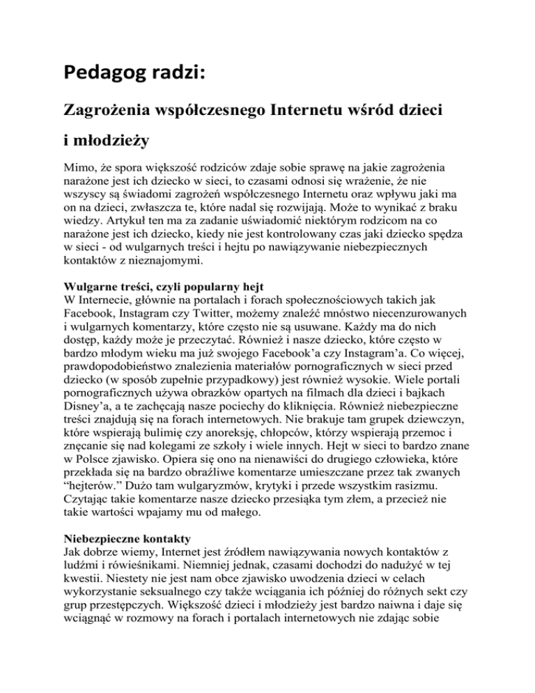 Pedagog radzi: Zagrożenia współczesnego Internetu wśród dzieci i młodzieży Mimo, że spora większość rodziców zdaje sobie sprawę na jakie zagrożenia narażone jest ich dziecko w sieci, to czasami odnosi się wrażenie, że nie wszyscy są świadomi zagrożeń współczesnego Internetu oraz wpływu jaki ma on na dzieci, zwłaszcza te, które nadal się rozwijają. Może to wynikać z braku wiedzy. Artykuł ten ma za zadanie uświadomić niektórym rodzicom na co narażone jest ich dziecko, kiedy nie jest kontrolowany czas jaki dziecko spędza w sieci - od wulgarnych treści i hejtu po nawiązywanie niebezpiecznych kontaktów z nieznajomymi. Wulgarne treści, czyli popularny hejt W Internecie, głównie na portalach i forach społecznościowych takich jak Facebook, Instagram czy Twitter, możemy znaleźć mnóstwo niecenzurowanych i wulgarnych komentarzy, które często nie są usuwane. Każdy ma do nich dostęp, każdy może je przeczytać. Również i nasze dziecko, które często w bardzo młodym wieku ma już swojego Facebook’a czy Instagram’a. Co więcej, prawdopodobieństwo znalezienia materiałów pornograficznych w sieci przed dziecko (w sposób zupełnie przypadkowy) jest również wysokie. Wiele portali pornograficznych używa obrazków opartych na filmach dla dzieci i bajkach Disney’a, a te zachęcają nasze pociechy do kliknięcia. Również niebezpieczne treści znajdują się na forach internetowych. Nie brakuje tam grupek dziewczyn, które wspierają bulimię czy anoreksję, chłopców, którzy wspierają przemoc i znęcanie się nad kolegami ze szkoły i wiele innych. Hejt w sieci to bardzo znane w Polsce zjawisko. Opiera się ono na nienawiści do drugiego człowieka, które przekłada się na bardzo obraźliwe komentarze umieszczane przez tak zwanych “hejterów.” Dużo tam wulgaryzmów, krytyki i przede wszystkim rasizmu. Czytając takie komentarze nasze dziecko przesiąka tym złem, a przecież nie takie wartości wpajamy mu od małego. Niebezpieczne kontakty Jak dobrze wiemy, Internet jest źródłem nawiązywania nowych kontaktów z ludźmi i rówieśnikami. Niemniej jednak, czasami dochodzi do nadużyć w tej kwestii. Niestety nie jest nam obce zjawisko uwodzenia dzieci w celach wykorzystanie seksualnego czy także wciągania ich później do różnych sekt czy grup przestępczych. Większość dzieci i młodzieży jest bardzo naiwna i daje się wciągnąć w rozmowy na forach i portalach internetowych nie zdając sobie sprawy jakie to może mieć konsekwencje. Gry w Internecie Wiele dzieci gra obecnie w rozmaite gry przeglądarkowe, czyli takie, do których potrzebujemy przeglądarki internetowej. Niby nic w tym dziwnego, ale jednak nałogowe granie może być przyczyną wielu problemów w szkole - od pogorszenia się relacji z rówieśnikami po słabsze oceny i mniejszą wydolność intelektualną. Co więcej w sieci jest wiele gier wulgarnych, w których dominuje przemoc i leje się krew. Dla przykładu gra o nazwie Happy Wheels, w której główna postać, dziadek, traci swoje kończyny w bardzo makabryczny sposób tylko dlatego, żeby przejechać przez szalone trasy prosto do mety. Gry nie muszą być jednak szkodliwe. Wszystko zależy od ich tematyki. Dlatego tak ważne jest, abyśmy upewnili się, że nasze dziecko gra w gry, które rozwijają jego umiejętności i uczą czegoś pożytecznego, jak, np. niektóre gry. Uczy, zapewnia dziecku rozrywkę i nie ma tam przemocy ani brutalnych scen. Z badań wynika, że co drugie dziecko spędza swój wolny czas w Internecie. Nie ma w tym nic złego, jeżeli tylko wiemy co nasza pociecha tam robi. Ważne jest, abyśmy rozmawiali na bieżąco z dzieckiem i obserwowali jego aktywność w sieci. Pełna kontrola nad witrynami i stronami, które odwiedza nasze dziecko w pełni pomoże nam zmniejszyć ryzyko zagrożeń, na które jest ono narażone.
