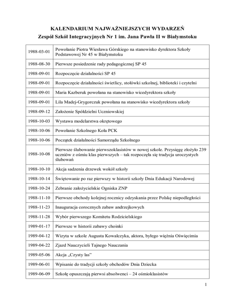 KALENDARIUM NAJWAŻNIEJSZYCH WYDARZEŃ Zespół Szkół Integracyjnych Nr 1 im. Jana Pawła II w Białymstoku 1988-03-01 Powołanie Piotra Wiesława Górskiego na stanowisko dyrektora Szkoły Podstawowej Nr 45 w Białymstoku 1988-08-30 Pierwsze posiedzenie rady pedagogicznej SP 45 1988-09-01 Rozpoczęcie działalności SP 45 1988-09-01 Rozpoczęcie działalności świetlicy, stołówki szkolnej, biblioteki i czytelni 1988-09-01 Maria Kazberuk powołana na stanowisko wicedyrektora szkoły 1988-09-01 Lila Madej-Grygorczuk powołana na stanowisko wicedyrektora szkoły 1988-09-12 Założenie Spółdzielni Uczniowskiej 1988-10-03 Wystawa modelarstwa okrętowego 1988-10-06 Powołanie Szkolnego Koła PCK 1988-10-06 Początek działalności Samorządu Szkolnego 1988-10-08 Pierwsze ślubowanie pierwszoklasistów w nowej szkole. Przysięgę złożyło 239 uczniów z ośmiu klas pierwszych – tak rozpoczęła się tradycja uroczystych ślubowań 1988-10-10 Akcja sadzenia drzewek wokół szkoły 1988-10-14 Świętowanie po raz pierwszy w historii szkoły Dnia Edukacji Narodowej 1988-10-24 Zebranie założycielskie Ogniska ZNP 1988-11-10 Pierwsze obchody kolejnej rocznicy odzyskania przez Polskę niepodległości 1988-11-23 Inauguracja corocznych zabaw andrzejkowych 1988-11-28 Wybór pierwszego Komitetu Rodzicielskiego 1989-01-17 Pierwsze w historii zabawy choinki 1989-04-12 Wizyta w szkole Augusta Kowalczyka, aktora, byłego więźnia Oświęcimia 1989-04-22 Zjazd Nauczycieli Tajnego Nauczania 1989-05-06 Akcja „Czysty las” 1989-06-01 Wpisanie do tradycji szkoły obchodów Dnia Dziecka 1989-06-09 Szkołę opuszczają pierwsi absolwenci – 24 ośmioklasistów 1 1989-06-23 Mury szkoły żegna 1325 uczniów uczęszczających do 45 oddziałów 0-VII 1989-09-01 Elżbieta Dziemiańczuk powołana na stanowisko wicedyrektora szkoły 1988/1989 1989/1990 Współpraca ze szkołą w Orenburgu (Rosja) 1989-09-22 I Sympozjum Naukowo-Techniczne ph. Ergonomia w szkole 1989-12-01 Wprowadzenie ergonomicznych mebli w sali nr 4 (klasy I A i I B) 1990-09-03 Do pracy z 2100 dziećmi przystępuje 117 nauczycieli Naukę rozpoczyna tylu uczniów, że trzeba utworzyć 14 klas I. Wprowadzono naukę religii: katolickiej i prawosławnej. Wprowadzono sześciostopniową skalę ocen: w dziennikach lekcyjnych obok „jedynek” pojawiają się „szóstki” 1990-12-20 Wieczór kolęd patriotycznych 1991-01-20 Zawieszenie w szkole krzyży i ikon 1991-08-31 Maria Kazberuk odwołana ze stanowisko wicedyrektora szkoły 1992-01-02 Nowy Rok – Nowa Świetlica 1992-03-16 Oddanie do użytku bloku sportowego 1992-04-15 Łukasz Tatarczuk zdobywa nagrodę w Europejskim Konkursie Szkolnym 1992-08-31 Lila Madej-Grygorczuk odwołana ze stanowisko wicedyrektora szkoły 1992-09-01 Oficjalne oddanie do użytku drugiego segmentu budynku szkoły: z blokiem sportowym, świetlicą, biblioteką i czytelnią 1992-09-01 Bazyl Bobaj powołany na stanowisko wicedyrektora szkoły 1992-12-18 II Sympozjum Naukowo-Techniczne ph. Ergonomia w szkole 1993-03-05 Urszula Szymańska nagrodzona w konkursie ekspresji dla dzieci PKOl. 1993-03-05 Urszula Bojaryn pierwszą laureatką Wojewódzkiego Konkursu Przedmiotowego 1993-05-10 I edycja konkursu poetyckiego dla uczniów klas I-III o laur Złotego Pióra; impreza organizowana cyklicznie 1993-05-17 Nauczyciele przystępują do strajku. Przez 2 tygodnie nie odbywają się planowane zajęcia: milknie dzwonek, nie ma lekcji; 31 maja nauczyciele ponownie przystępują do pracy 2 1993-09-01 Utworzono pierwsze klasy integracyjne; powstały 2 oddziały; wśród 34 uczniów sześcioro ma specjalne potrzeby edukacyjne 1993/1994 Utworzenie chóru szkolnego 1993/1994 Rozpoczyna działalność koło sprawnych rąk 1993-09-25 Udział w międzynarodowej akcji Sprzątanie świata; odtąd corocznie 1994-01-28 Powołanie Rady Szkoły 1995-03-25 Przemysław Babicz stypendystą Krajowego Funduszu na rzecz Dzieci 1995-06-03 Debiut sceniczny zespołu „Świetliki” 1995/1996 Rozwijanie teatralnych uzdolnień dzieci ze świetlicy; „Świetliki” i „De Kumpel” zdobywają nagrody i wyróżnienia na forum międzynarodowym i ogólnopolskim 1995-09-01 Oddanie do użytku pierwszej pracowni komputerowej 1995-09-16 Zainicjowanie tradycji szachowych w szkole. Organizowanie zawodów na szczeblach od miejskiego do międzynarodowego; 1. runda I edycji Szachowej Białostockiej Ligi Szkolnej 1995-09-29 Założenie Uczniowskiego Klubu Sportowego „Stoczek” przy SP 45 1995-11-26 „Świetliki” najlepsze na Rejonowym Forum Teatrów Dziecięcych 1996-02-02 „Świetliki” wyróżnione w Poznaniu 1996-04-26 Dzień Młodego Miotacza 1996-06-20 Marta Stobińska najlepszą uczennicą szkoły w konkursie Sami najlepsi’96 1996-09-01 Leszek Zega powołany na stanowisko wicedyrektora szkoły 1996-09-01 Na przejściu dla pieszych na ul. Konstytucji 3 Maja pojawia się strażnik szkolny 1996/1997 Wprowadzenie SP 45 do sieci Szkół Promujących Zdrowie 1996-09-17 „Świetliki” na II Międzynarodowym Festiwalu Teatrów w Warszawie 1996-10-15 Powołanie formacji obrony cywilnej w szkole 1996-11-08 Pierwsze warsztaty dla nauczycieli szkół i przedszkoli Białegostoku, inspirowane metodą Celestyna Freineta 1997-03-06 Spotkanie z poetką Joanną Papuzińską 3 1997-04-10 Powołanie Komisji ds. weryfikowania i opiniowania wniosków o przyznanie świadczeń pieniężnych ze środków finansowych na pomoc zdrowotną 1997-06-20 Założenie Szkolnego Koła Caritas 1997/1998 SP 45 zajmuje I miejsce w 23. edycji konkursu gier i zabaw „Olimpijka” 1997-10-10 Utworzenie Szkolnego Koła Krajoznawczo-Turystycznego 1997-12-14 Rozpoczęcie procedury nadania szkole imienia Jana Pawła II 1998-03-20 Teatr Ruchu „Świetliki” nagrywa Balladę o Fleur i Pierrot dla TVP Łódź 1998-05-15 Ewa Niemyjska laureatką Plebiscytu na nauczyciela roku Gazety Wyborczej 1998-05-31 I miejsce „Świetlików” w Przeglądzie Twórczości Artystycznej Szkół Podstawow
