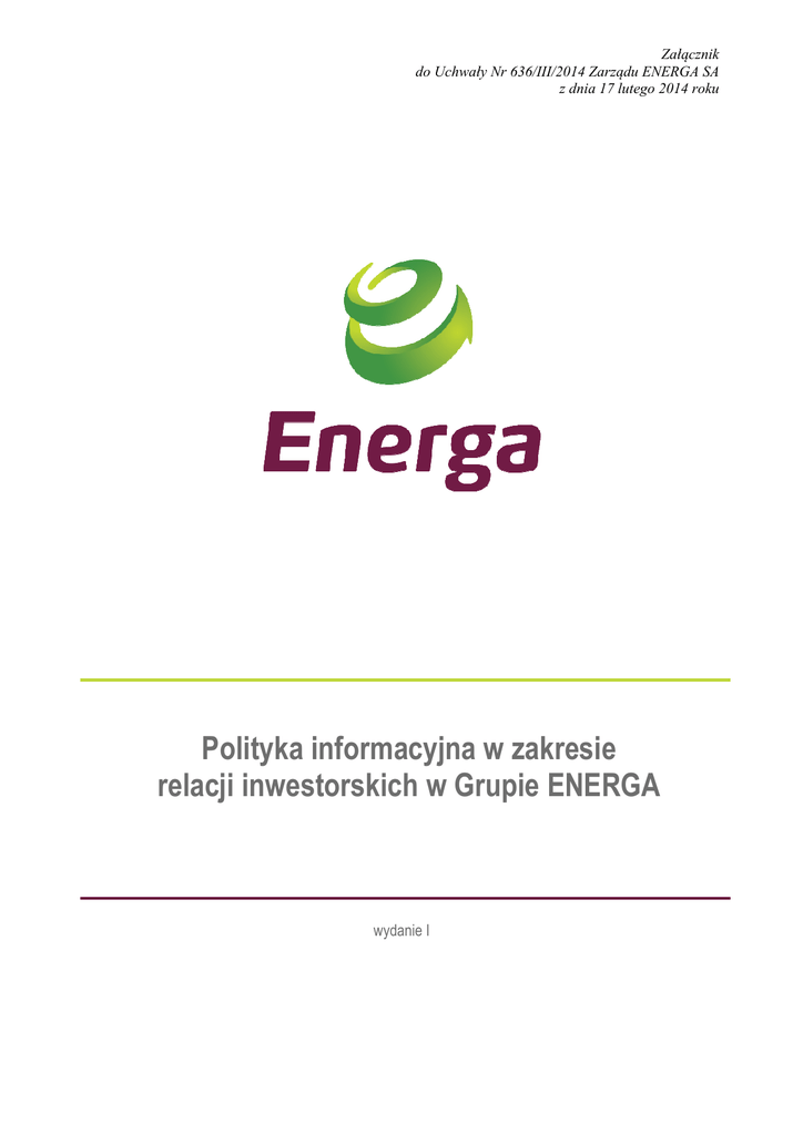 Załącznik do Uchwały Nr 636/III/2014 Zarządu ENERGA SA z dnia 17 lutego 2014 roku Polityka informacyjna w zakresie relacji inwestorskich w Grupie ENERGA wydanie I Spis treści 1. WSTĘP ...................................................................................................................................................... 3 2. ADRESACI POLITYKI INFORMACYJNEJ ............................................................................................... 3 3. CEL WPROWADZENIA ............................................................................................................................ 3 4. ZAKRES PRZEKAZYWANYCH INFORMACJI ........................................................................................ 4 5. ZASADY PRZEKAZYWANIA INFORMACJI ............................................................................................ 5 6. ORGANIZACJA RELACJI INWESTORSKICH W SPÓŁCE..................................................................... 5 7. NARZĘDZIA KOMUNIKACJI Z RYNKIEM KAPITAŁOWYM ................................................................... 6 Polityka informacyjna w zakresie relacji inwestorskich w Grupie ENERGA, wydanie I 2/6 1. WSTĘP 1.1 „Polityka informacyjna w zakresie relacji inwestorskich w Grupie ENERGA” („Polityka”) określa standardy przekazywania do wiadomości publicznej informacji o Spółce ENERGA SA (”Spółka”, „Emitent”, „ENERGA SA”) oraz o Grupie Kapitałowej ENERGA („Grupa” lub „Grupa ENERGA”) oraz prowadzenia komunikacji z uczestnikami rynku kapitałowego. Polityka stanowi uzupełnienie i rozwinięcie norm prawa powszechnie obowiązującego, w szczególności zamieszczonych w aktach normatywnych, o których mowa w pkt 4.7. 1.2 Z dniem debiutu akcji na Giełdzie Papierów Wartościowych w Warszawie, tj. z dniem 11 grudnia 2013 roku, ENERGA SA uzyskała status spółki giełdowej. Wobec czego istnieje konieczność wypełniania obowiązków informacyjnych oraz potrzeba przekazywania informacji niezbędnych do podejmowania racjonalnych decyzji inwestycyjnych dotyczących wyemitowanych przez Spółkę walorów. 1.3 Działania Emitenta w ramach Polityki informacyjnej obejmują: 1) raporty przekazywane do Komisji Nadzoru Finansowego, Giełdy Papierów Wartościowych w Warszawie i agencji informacyjnej, a także Giełdy Papierów Wartościowych w Luksemburgu, 2) pisemne oświadczenia składane w rocznych, półrocznych i kwartalnych raportach okresowych, 3) komunikaty, 4) listy do akcjonariuszy, 5) wypowiedzi, 6) informacje zamieszczone na stronie internetowej Spółki. 1.4 Polityka ma zastosowanie wobec Spółki ENERGA SA, a pośrednio również Spółek Grupy ENERGA, w tym zwłaszcza Liderów Segmentów. 2. ADRESACI POLITYKI INFORMACYJNEJ Działania wynikające z Polityki informacyjnej skierowane są do następujących grup interesariuszy: 1) inwestorzy indywidualni, instytucjonalni i akcjonariusze Spółki, 2) obligatariusze krajowi i zagraniczni Spółki, 3) instytucje nadzoru i organizatorzy rynku regulowanego (Komisja Nadzoru Finansowego, Giełda Papierów Wartościowych w Warszawie oraz Giełda Papierów Wartościowych w Luksemburgu), 4) analitycy rynku akcji i obligacji, 5) pośrednicy w obrocie papierami wartościowymi, 6) agencje ratingowe. 3. CEL WPROWADZENIA 3.1 Podstawowym celem Polityki jest prowadzenie efektywnej komunikacji przez Emitenta z uczestnikami rynku kapitałowego, która przyczynia się do korzystnej wyceny Spółki w dłuższym horyzoncie czasowym. Polityka informacyjna w zakresie relacji inwestorskich w Grupie ENERGA, wydanie I 3/6 3.2 Poprzez budowanie i utrzymywanie relacji z akcjonariuszami i obligatariuszami, ENERGA SA kształtuje swój wizerunek jako Spółki godnej zaufania. 4. ZAKRES PRZEKAZYWANYCH INFORMACJI 4.1 Zakres przekazywanych informacji jest w decydującym stopniu określony obowiązującymi w Polsce przepisami prawa i dobrymi praktykami rynkowymi, a obejmuje m.in.: informacje poufne o charakterze cenotwórczym, wyniki finansowe, informacje o otoczeniu rynkowym, strategii i działalności operacyjnej, coroczne oświadczenie o stosowaniu ładu korporacyjnego oraz raport o społecznej odpowiedzialności biznesu w Grupie ENERGA. 4.2 Za kryterium wyznaczające poziom istotności dla potrzeb wykonywania obowiązków informacyjnych, ENERGA SA przyjmuje próg 10% wartości kapitałów własnych za ostatni kwartał obrotowy. 4.3 Co do zasady, Spółka nie publikuje prognoz wyników finansowych. Przy okazji publikacji raportu okresowego istnieje możliwość skomentowania zmian zachodzących w otoczeniu i ich potencjalnego wpływu na działalność Grupy ENERGA w perspektywie kolejnego okresu sprawozdawczego (tzw. market/industry outlook). 4.4 W okresie bezpośrednio poprzedzającym publikację wyników finansowych, Spółka powstrzymuje się od proaktywnej organizacji spotkań, a podczas wydarzeń objętych Planem komunikacji w rozumieniu zasad komunikacji korporacyjnej oraz pozostałych działań marketingowych w Grupie ENERGA posługuje się jedynie wynikami finansowymi dotąd udostępnionymi publicznie. 4.5 Spółka nie komentuje spekulacji rynkowych ani też nie ma obowiązku dementowania plotek. W przypadku gdy spekulacje lub plotki wywierają wpływ na cenę akcji, Spółka może podjąć określone kroki, po uzgodnieniu z Giełdą Papierów Wartościowych w Warszawie. 4.6 Realizacja obowiązków informacyjnych w Grupie Kapitałowej ENERGA odbywa się w oparciu o regulacje wewnętrzne: 1) „Zasady współpracy przy wypełnianiu obowiązków informacyjnych w ramach Grupy Kapitałowej ENERGA”, 2) „Instrukcję funkcjonowania Repozytorium Umów Grupy Kapitałowej ENERGA”. 4.7 Regulacje wewnętrzne wprowadzone do stosowania są zgodne z przepisami prawa określającymi funkcjonowanie spółki publicznej, ze szczególnym uwzględnieniem: 1) 2) 3) ustawy z dnia 29 lipca 2005 roku o obrocie instrumentami finansowymi (tekst jednolity Dz.U. z 2014 rok