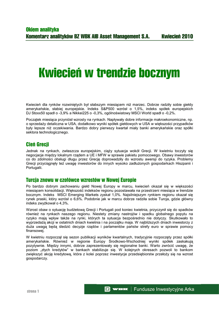 Okiem analityka Komentarz analityków BZ WBK AIB Asset Management S.A. Kwiecień 2010 Kwiecień w trendzie bocznym Kwiecień dla rynków rozwiniętych był słabszym miesiącem niŜ marzec. Dobrze radziły sobie giełdy amerykańskie, słabiej europejskie. Indeks S&P500 wzrósł o 1,5%, indeks spółek europejskich DJ Stoxx50 spadł o -3,9% a Nikkei225 o -0,3%, ogólnoświatowy MSCI World spadł o -0,2%. Początek miesiąca przyniósł wzrosty na rynkach. Napływały dobre informacje makroekonomiczne, np. o sprzedaŜy detaliczna w USA, dodatkowo wyniki spółek giełdowych w USA w większości przypadków były lepsze niŜ oczekiwania. Bardzo dobry pierwszy kwartał miały banki amerykańskie oraz spółki sektora technologicznego. Cień Grecji Jednak na rynkach, zwłaszcza europejskim, ciąŜy sytuacja wokół Grecji. W kwietniu toczyły się negocjacje między lokalnym rządem a UE i MFW w sprawie pakietu pomocowego. Obawy inwestorów co do zdolności obsługi długu przez Grecję doprowadziły do wzrostu awersji do ryzyka. Problemy Grecji przyciągnęły teŜ uwagę inwestorów do innych wysoko zadłuŜonych gospodarkach Hiszpanii i Portugalii. Turcja znowu w czołówce wzrostów w Nowej Europie Po bardzo dobrym zachowaniu giełd Nowej Europy w marcu, kwiecień okazał się w większości miesiącem konsolidacji. Większość indeksów regionu pozostawała na przestrzeni miesiąca w trendzie bocznym. Indeks MSCI Emerging Markets zyskał 1,0%. Najsilniejszym rynkiem regionu okazał się rynek praski, który wzrósł o 6,6%. Podobnie jak w marcu dobrze radziła sobie Turcja, gdzie główny indeks zwyŜkował o 4,3%. Wzrost obaw o sytuację budŜetową Grecji i Portugali pod koniec kwietnia, przyczynił się do spadków równieŜ na rynkach naszego regionu. Niestety zmiany nastrojów i spadku globalnego popytu na ryzyko mają wpływ takŜe na rynki, których ta sytuacja bezpośrednio nie dotyczy. Skutkowało to wyprzedaŜą akcji w ostatnich dniach kwietnia i na początku maja. W najbliŜszych dniach inwestorzy z duŜa uwagą będą śledzić decyzje rządów i parlamentów państw strefy euro w sprawie pomocy finansowej. W kwietniu rozpoczął się sezon publikacji wyników kwartalnych, tradycyjnie rozpoczęty przez spółki amerykańskie. RównieŜ w regionie Europy Środkowo-Wschodniej wyniki spółek zaskakują pozytywnie. Między innymi, dobrze zaprezentowały się regionalne banki. Warto zwrócić uwagę, Ŝe poziom „złych kredytów” w bankach stabilizuje się. W kolejnych okresach pozwoli to bankom zwiększyć akcję kredytową, która z kolei poprzez inwestycje przedsiębiorstw przełoŜy się na wzrost gospodarczy. strona 1 Okiem Analityka Komentarz analityków BZ WBK AIB Asset Management S.A. W Polsce wahania... Kwiecień na krajowym rynku był miesiącem wysokiej zmienności. Pierwsza połowa była kontynuacją dynamicznych wzrostów z marca, podczas gdy w drugiej połowie na wynikach zawaŜyły obawy inwestorów co do rozwoju sytuacji w Grecji i jej wpływu na gospodarkę europejską. Liczby kwietnia Mimo wahań polskie indeksy zakończyły miesiąc wzrostami. Indeks WIG20 wzrósł 2,1%, MWIG40 równieŜ 2,1%, natomiast indeks małych spółek SWIG80 wzrósł 0,5%. Indeks szerokiego rynku WIG wzrósł w kwietniu o 2,0%. ...i publiczna oferta PZU Dane Kraj / region Dane za okres: Dynamika lub wartość aktualna poprzednia 311 tys. Sprzedaż nowych domów USA Marzec 408 tys. The Conference Board Consumer Confidence Index* USA Marzec 57,9 52,5 Sprzedaż detaliczna USA Marzec 1,6% m/m 0,3 m/m Inflacja Polska Marzec 2,6% r/r 2,9% r/r W kwietniu Ministerstwo Skarbu z sukcesem * The Conference Board Consumer Confidence Index (indeks zaufania konsumentów) przeprowadziło publiczną – wskaźnik obliczany na podstawie comiesięcznej ankiety wśród gospodarstw ofertę akcji PZU. Ze względu domowych; obejmuje ocenę bieżącej kondycji gospodarstwa domowego oraz na wysoki popyt, maksymalna oczekiwań co do jej zmiany za 6 miesięcy (rok 1985 = 100). wielkość zapisu w transzy inwestorów indywidualnych została ograniczona do 30 akcji. Natomiast polscy i zagraniczni inwestorzy instytucjonalni zgłosili popyt 9-krotnie przekraczający liczbę akcji do sprzedaŜy. Znaczną cześć akcji przydzielono inwestorom zagranicznym. Surowce Cena ropy wzrosła z 83,8 USD do 86,2 USD za baryłkę, ustanawiając nowe roczne rekordy. Wzrostowi cen „sprzyja” katastrofa platformy wiertniczej BP na wybrzeŜu USA. Ewentualne późniejsze działania rządu ograniczające wydobycie surowca w tym rejonie mogą doprowadzić do obniŜenia światowej podaŜy, co wpływa na wzrost cen. Kurs miedzi spadł z 7793 USD do 7350 USD za tonę. Na niŜsze wyceny surowców wpływa mocny dolar, w którym są notowane. Dodatkowo rząd chiński wprowadza kolejne działania ograniczające spekulację i aktywność na rynku nieruchomości, mające ograniczyć ryzyko nadmuchania „bańki” rynkowej. Inwestorzy obawiają się, Ŝe chińskie studzenie gospodarki wpłynie na osłabieniu popytu tego kraju na surowce. Obligacje i waluty Kwiecień charakteryzował się duŜą zmiennością równieŜ na rynkach długu, zarówno w USA, jak i w Europie. Początek miesiąca przyniósł wzrosty rentowności związane z poprawą sentymentu na światowych rynkach akcji. Jednak wraz z wzrostem obaw o sytuację fiskalną Grecji i innych krajów „peryferyjnych” Europy, pojawił się zwiększony popyt na mniej ryzykowne obligacje, co doprowadziło do spadku rentowności i wzrostu ich cen. W kwietniu miało miejsce dalsze umocnienie dolara względem wspólnej waluty. W przeciągu całego miesiąca kurs EUR/USD spadł z 1,353 do 1,327. Osłabienie EUR względem USD jest równieŜ wynikiem obaw o stan finansów państw z południa Europy. Materiał jest prezentowany w celach informacyjnych i nie powinien być wyłączną podstawą podejmowania decyzji inwestycyjnych. Niniejszy dokument nie moŜe być kopiowany, cytowany lub ro