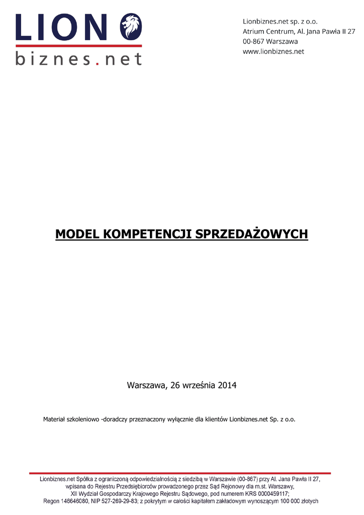 MODEL KOMPETENCJI SPRZEDAŻOWYCH Warszawa, 26 września 2014 Materiał szkoleniowo -doradczy przeznaczony wyłącznie dla klientów Lionbiznes.net Sp. z o.o. MODEL KOMPETENCJI SPRZEDAŻOWYCH Kiedy w sprzedaży pojawia się niebezpieczna rutyna, my lub nasi pracownicy znaleźliśmy się w strefie komfortu. Zatrzymujemy się w miejscu i nie idziemy dalej. To właśnie moment na dokonanie przeglądu swoich kompetencji w relacji do naszych zadań. „Zacznijmy od podstaw …………. to jest piłka” - Vince Lombardii legendarny trener futbolu amerykańskiego, tymi słowami rozpoczynał każdy trening swojej mistrzowskiej drużyny. Przypomnienie „alfabetu” warsztatu sprzedażowego to zwiększenie efektywności rozmowy handlowej w czasie – więcej klientów, z którymi rozmawiamy, więcej zawartych kontraktów sprzedażowych, więcej długoterminowych relacji. KOMPETENCJE SPRZEDAŻOWE 1) Użycie modelu kompetencyjnego w procesie: a) Rekrutacji, b) Rozwoju i doskonaleniu 2) Czego potrzebujemy ? – model kompetencyjny w sprzedaży i ćwiczenia praktyczne. a) Aktywne słuchanie - parafraza, dajemy uwagę, dopytujemy się, b) Zadawanie pytań – pytania otwarte i zamknięte, intencje c) Radzenie sobie w „trudnych sytuacjach”: 1. Walka na argumenty, 2. Mit ceny, 3. Presja czasu, 4. Odmowa wobec klienta – zachowania asertywne. KIM JEST SPRZEDAWCA IDEALNY ? O skuteczności selekcji nie dowiadujemy się po przyjęciu kandydata, lecz zwykle znacznie później. Kandydat osiąga niezbędny poziom kompetencji po minimum roku pracy i po takim okresie w większości przypadków możemy uznać, że proces rekrutacji jest zakończony. Punktem wyjścia do prowadzenia każdego procesu selekcji i rozwoju jest dokładne określenie podstawowych kompetencji i ich poziomu jakimi powinien charakteryzować się dobry sprzedawca. Dla naszych potrzeb możemy wyróżnić dowolną ilość podstawowych kompetencji (chociaż optymalną liczbą jest pięć), które warto badać u kandydatów do pracy przedstawiciela handlowego. Lista kompetencji - Arkusz kontrolny Lp. Kompetencja 1 Analiza rynku 2 Autoprezentacja 3 Budowanie relacji z klientami 4 Dążenie do rezultatów 5 Diagnozowanie potrzeb klienta 6 Elastyczność myślenia 7 Gotowość do uczenia się 8 Identyfikacja z firmą 9 Komunikatywność 10 Kreatywność 11 Kultura osobista 12 Motywowanie 13 Obsługa klienta 14 Organizacja pracy własnej 15 Orientacja na klienta 16 Otwartość na innych 17 Otwartość na zmiany 18 Planowanie 19 Procedury (znajomość i stosowanie) 20 Proces sprzedaży 21 Prowadzenie prezentacji 22 Przestrzeganie zasad 23 Radzenie sobie z obiekcjami klientów 24 Radzenie sobie ze stresem A B C D E F G H I J Razem: 25 Relacje z klientem 26 Rozwiązywanie problemów 27 Samodzielność 28 Sumienność 29 Współpraca w zespole 30 Wywieranie wpływu 31 Zarządzanie czasem 32 …………………………………… Skala kompetencyjna (poziomy kompetencji) Ponieważ podstawową cechą kompetencji jest jej mierzalność niezbędne było stworzenie skali pozwalającej na pomiar kompetencji i jej zmiany. Skala musi być czytelna dla wszystkich uczestników systemu. POZIOM NAZWA POZIOMU OGÓLNA CHARAKTERYSTYKA ZACHOWAŃ BRAK Osoba nie posiada wiedzy/umiejętności w danym zakresie i/lub nie posługuje się nią/nimi przy realizacji zadań zawodowych. 2 UCZĄCY SIĘ Osoba posiada wiedzę/umiejętności w danym zakresie przyswojone w stopniu podstawowym i/lub posługuje się nimi w niektórych sytuacjach zawodowych; wymaga wsparcia i/lub nadzoru ze strony bardziej doświadczonych pracowników lub bezpośredniego przełożonego. 3 DOBRY (RZEMIEŚLNIK) Osoba posiada wiedzę/umiejętności w danym zakresie przyswojone w stopniu dobrym; posługując się nimi; samodzielnie radzi sobie z standardowymi zadaniami. 4 EKSPERT (WZÓR) Osoba posiada wiedzę/umiejętności w danym zakresie przyswojone w stopniu bardzo dobrym; swobodnie posługuje się nimi w różnorodnych sytuacjach zawodowych. Jej zachowanie może stanowić wzór szkoleniowy 5 WYBITNY (MISTRZ) Osoba posiada wiedzę/umiejętności w danym zakresie przyswojone w stopniu doskonałym; twórczo wykorzystuje je w codziennej pracy, jak również w niestandardowych sytuacjach zawodowych. Odporna na rutynę. 1 KOMPETENCJE KOMUNIKACYJNE- klucz każdej sprzedaży Umiejętności komunikacyjne są podstawą wszelkiej działalności handlowej i wymagają kontaktów z innymi ludźmi. Każdy przedstawiciel handlowy przed którym postawiono za cel budowanie relacji z klientem, musi swobodnie posługiwać się narzędziami rozmowy handlowej. Należy do nich także ekspresja językowa -dobre rozumienie pojęć i słów, efektywne ich wykorzystywania oraz przekazywanie ich w mowie i piśmie. Wiąże się to z umiejętnością skutecznego wyjaśniania innym osobom skomplikowanych idei lub procesów. Ważna jest też perswazja, zdecydowane wywieranie wpływu dla uzyskania akceptacji. Od przedstawiciela handlowego wymaga się celowego i skutecznego wpływania na wolę innych. Instruowanie, nauczanie, szkolenie, prezentowanie - wymaga posiadania praktycznej wiedzy. Podstawą jednak jest zdolność do budowania relacji, dobrej analizy potrzeb klienta. PROWADZENIE ROZMOWY HANDLOWEJ (umiejętne prowadzenie rozmowy handlowej z wykorzystaniem wiedzy produktowej) WSKAŹNIKI a - brak b - uczący się brak kontaktu z klientem w trakcie rozmowy traci kontakt z klientem prowadzi prezentacje produktu bez zbadania potrzeb klienta wyrywkowa bada potrzeby klienta, często zatrzymując się na poziomie stanowiska prezentowanego przez klienta Budowanie oferty prowadzi standardową prezentację całości oferty Radzenie sobie z obiekcjami klienta nie radzi sobie z obiekcjami klienta Kontakt z klientem Badanie potrzeb klienta Aktywne pozyskiwanie klientów korzysta tylko z zewnętrznych źródeł pozyskiwania klientów POZIOMY c – dobry (rzemieślnik) d - ekspert (wzór) e - wybitny (mistrz) nawiązuje kontakt z klien