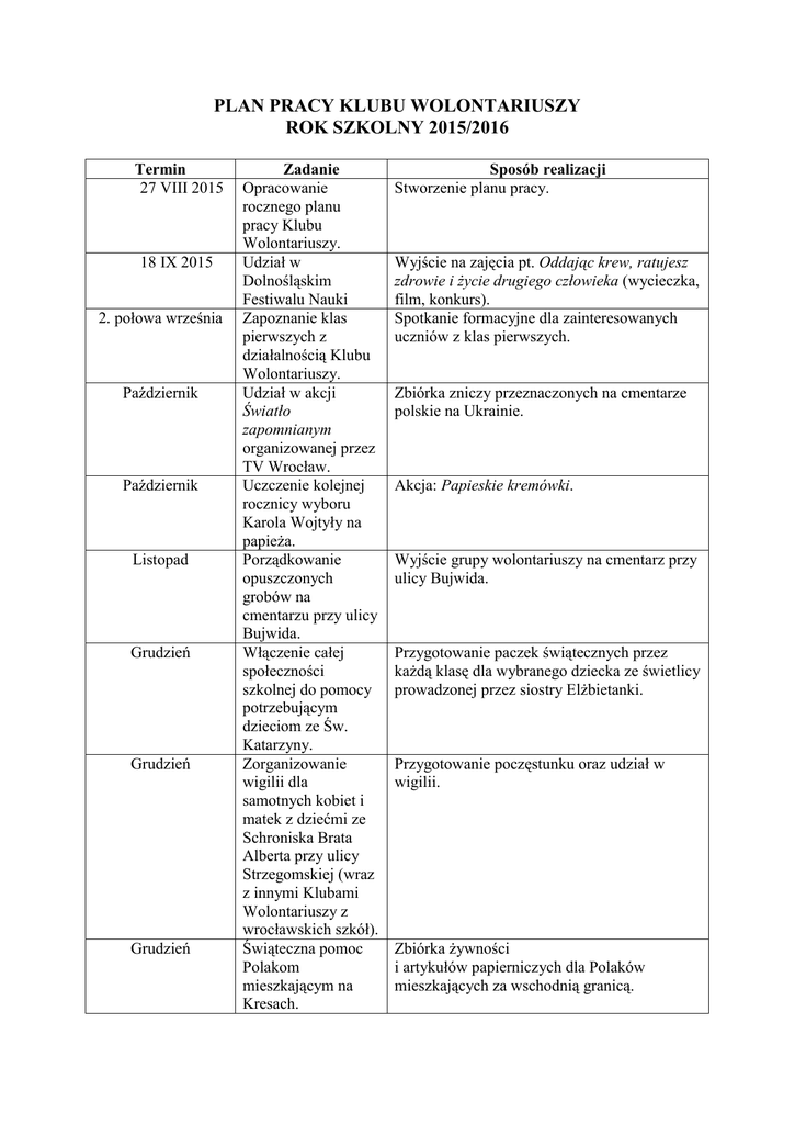 PLAN PRACY KLUBU WOLONTARIUSZY ROK SZKOLNY 2015/2016 Termin 27 VIII 2015 18 IX 2015 2. połowa września Październik Październik Listopad Grudzień Grudzień Grudzień Zadanie Opracowanie rocznego planu pracy Klubu Wolontariuszy. Udział w Dolnośląskim Festiwalu Nauki Zapoznanie klas pierwszych z działalnością Klubu Wolontariuszy. Udział w akcji Światło zapomnianym organizowanej przez TV Wrocław. Uczczenie kolejnej rocznicy wyboru Karola Wojtyły na papieża. Porządkowanie opuszczonych grobów na cmentarzu przy ulicy Bujwida. Włączenie całej społeczności szkolnej do pomocy potrzebującym dzieciom ze Św. Katarzyny. Zorganizowanie wigilii dla samotnych kobiet i matek z dziećmi ze Schroniska Brata Alberta przy ulicy Strzegomskiej (wraz z innymi Klubami Wolontariuszy z wrocławskich szkół). Świąteczna pomoc Polakom mieszkającym na Kresach. Sposób realizacji Stworzenie planu pracy. Wyjście na zajęcia pt. Oddając krew, ratujesz zdrowie i życie drugiego człowieka (wycieczka, film, konkurs). Spotkanie formacyjne dla zainteresowanych uczniów z klas pierwszych. Zbiórka zniczy przeznaczonych na cmentarze polskie na Ukrainie. Akcja: Papieskie kremówki. Wyjście grupy wolontariuszy na cmentarz przy ulicy Bujwida. Przygotowanie paczek świątecznych przez każdą klasę dla wybranego dziecka ze świetlicy prowadzonej przez siostry Elżbietanki. Przygotowanie poczęstunku oraz udział w wigilii. Zbiórka żywności i artykułów papierniczych dla Polaków mieszkających za wschodnią granicą. Grudzień Przygotowanie spotkania świątecznego dla mieszkańców Domu Pomocy Społecznej mieszczącego się przy ulicy Karmelkowej. Zorganizowanie Balu Karnawałowego dla niepełnosprawnych (wraz z innymi Klubami Wolontariuszy z wrocławskich szkół). Wiosna u seniorów spotkanie z mieszkańcami Domu Pomocy Społecznej przy ulicy Karmelkowej. Pomoc osobom bezdomnym z Noclegowni Brata Alberta przy ul. Małachowskiego, poznanie placówki. Udział w akcji Mogiłę pradziada ocal od zapomnienia. Weryfikacja rocznej pracy wolontariuszy. Włączenie się w organizację Jarmarku Dominikańskiego Bł. Czesława. Wspólne planowanie akcji i wymiana doświadczeń z innymi opiekunami Klubów Wolontariuszy. Świąteczne spotkanie w formie KARAOKEśpiewanie kolęd z mieszkańcami DPS. Cały rok Wspomaganie osób potrzebujących poprzez zbiórkę makrętek, z których dochód przeznaczony jest na cele charytatywne. Zbiórka nakrętek do pojemników wystawionych na szkolnych korytarzach. Cały rok Informowanie Spotkania Klubu. Styczeń/luty Marzec Marzec Kwiecień Maj Czerwiec Raz w miesiącu Udział w Balu Karnawałowym dla niepełnosprawnych. Wyjście z programem artystycznym oraz poczęstunkiem (ciasta przygotowane przez uczniów, owoce) - Koncert Wiosenny. Zbiórka środków czystości, zaniesienie ich do schroniska, spotkanie z mieszkańcami. Zbiórka symbolicznej złotówki od każdego ucznia. Analiza dokumentacji pracy wolontariuszy. Szkolna zbiórka odzieży, książek i ciast domowego wypieku, praca w trakcie trwania Jarmarku. Spotkanie opiekunów Klubów Wolontariuszy z różnych szkół w Centrum Klubów 8 przy ulicy Skwierzyńskiej. wolontariuszy o szkolnych i miejskich akcjach charytatywnych. Wg planu Szkolenia ustalonego z formacyjne dla opiekunami z innych wolontariuszy. wrocławskich Klubów Udział uczniów w szkoleniach (warsztaty itp.) Akcje: 1. Zbiórka zniczy na polskie groby pozostałe za wschodnią granicą, żywności oraz artykułów papierniczych dla rodaków mieszkających na Ukrainie i Wileńszczyźnie. 2. Przygotowanie świątecznej paczki przez każdą klasę dla dzieci z ubogich rodzin, uczęszczających do świetlicy prowadzonej przez siostry Elżbietanki w Świętej Katarzynie. 3. Sprzątanie opuszczonych grobów na wrocławskim cmentarzu przy ulicy Bujwida. 4. Spotkania wolontariuszy z mieszkańcami Domu Pomocy Społecznej przy ul. Karmelkowej: poczęstunek ciastami domowego wypieku, kartki z życzeniami, program artystyczny (np. jasełka, koncerty muzyczne, przedstawienia teatralne itp.) 5. Udział w Integracyjnym Balu Karnawałowym organizowanym corocznie w I Liceum Ogólnokształcącym we Wrocławiu. 6. Zbiórka środków czystości dla Noclegowni Brata Alberta. 7. Całoroczna zbiórka plastikowych nakrętek. 8. Współorganizowanie Jarmarku Dominikańskiego. Opiekunowie: Ewa Mordel, Magdalena Szafrańska, Edyta Trestka, Małgorzata Mejer, ks. R. Rotman