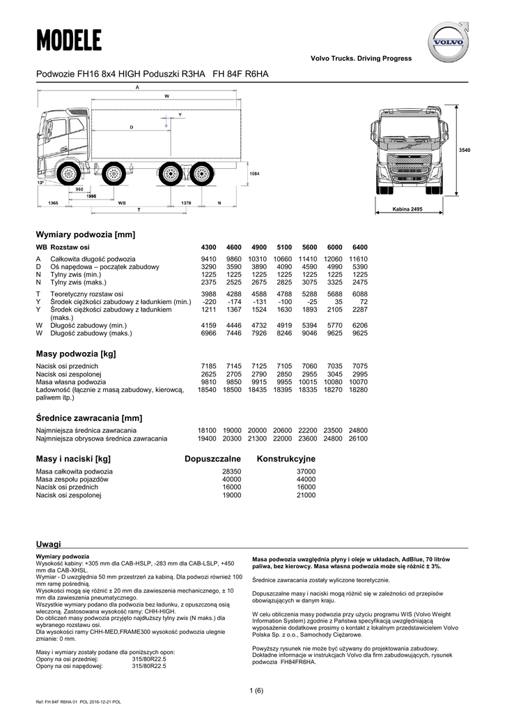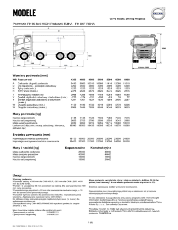 Volvo Trucks. Driving Progress Podwozie FH16 8x4 HIGH Poduszki R3HA FH 84F R6HA 3540 ,374 Kabina 2495 Wymiary podwozia [mm] WB Rozstaw osi 4300 4600 4900 5100 5600 6000 6400 A D N N Całkowita długość podwozia Oś napędowa – początek zabudowy Tylny zwis (min.) Tylny zwis (maks.) 9410 3290 1225 2375 9860 10310 10660 11410 12060 11610 3590 3890 4090 4590 4990 5390 1225 1225 1225 1225 1225 1225 2525 2675 2825 3075 3325 2475 T Y Y Teoretyczny rozstaw osi Środek ciężkości zabudowy z ładunkiem (min.) Środek ciężkości zabudowy z ładunkiem (maks.) Długość zabudowy (min.) Długość zabudowy (maks.) 3988 -220 1211 4288 -174 1367 4588 -131 1524 4788 -100 1630 5288 -25 1893 5688 35 2105 6088 72 2287 4159 6966 4446 7446 4732 7926 4919 8246 5394 9046 5770 9625 6206 9625 W W Masy podwozia [kg] Nacisk osi przednich Nacisk osi zespolonej Masa własna podwozia Ładowność (łącznie z masą zabudowy, kierowcą, paliwem itp.) 7185 7145 7125 7105 7060 7035 7075 2625 2705 2790 2850 2955 3045 2995 9810 9850 9915 9955 10015 10080 10070 18540 18500 18435 18395 18335 18270 18280 Średnice zawracania [mm] Najmniejsza średnica zawracania Najmniejsza obrysowa średnica zawracania 18100 19000 20000 20600 22200 23500 24800 19400 20300 21300 22000 23600 24800 26100 Masy i naciski [kg] Dopuszczalne Konstrukcyjne Masa całkowita podwozia Masa zespołu pojazdów Nacisk osi przednich Nacisk osi zespolonej 28350 40000 16000 19000 37000 44000 16000 21000 Uwagi Wymiary podwozia Wysokość kabiny: +305 mm dla CAB-HSLP, -283 mm dla CAB-LSLP, +450 mm dla CAB-XHSL. Wymiar - D uwzględnia 50 mm przestrzeń za kabiną. Dla podwozi również 100 mm ramę pośrednią. Wysokości mogą się różnić ± 20 mm dla zawieszenia mechanicznego, ± 10 mm dla zawieszenia pneumatycznego. Wszystkie wymiary podano dla podwozia bez ładunku, z opuszczoną osią wleczoną. Zastosowana wysokość ramy: CHH-HIGH. Do obliczeń masy podwozia przyjęto najdłuższy tylny zwis (N maks.) dla wybranego rozstawu osi. Dla wysokości ramy CHH-MED,FRAME300 wysokość podwozia ulegnie zmianie: 0 mm. Masy i wymiary zostały podane dla poniższych opon: Opony na osi przedniej: 315/80R22.5 Opony na osi napędowej: 315/80R22.5 Masa podwozia uwzględnia płyny i oleje w układach, AdBlue, 70 litrów paliwa, bez kierowcy. Masa własna podwozia może się różnić ± 3%. Średnice zawracania zostały wyliczone teoretycznie. Dopuszczalne masy i naciski mogą różnić się w zależności od przepisów obowiązujących w danym kraju. W celu obliczenia masy podwozia przy użyciu programu WIS (Volvo Weight Information System) zgodnie z Państwa specyfikacją uwzględniającą wyposażenie dodatkowe prosimy o kontakt z lokalnym przedstawicielem Volvo Polska Sp. z o.o., Samochody Ciężarowe. Powyższy rysunek nie może być używany do projektowania zabudowy. Dokładne informacje w instrukcjach Volvo dla firm zabudowujących, rysunek podwozia FH84FR6HA. 1 (6) Ref: FH 84F R6HA 01 POL 2016-12-21 POL Podwozie FH16 8x4 HIGH Poduszki R3HA FH 84F R6HA Przeznaczenie pojazdu ■ RC-ROUGH □ RC-SMOOT Drogi utwardzone i nieutwardzone Drogi utwardzone □ TIPP-PRE ■ UNIFORM Przygotowanie pod zabudowę wywrotki Bez specjalnego przygotowania pod zabud. Główne elementy pojazdu ■ CHH-HIGH □ CHH-MED Rama wysoka (1000) Rama 900 □ □ ■ □ Kabina FH16, sypialna wysoka GLOBETROTTER Kabina FH16 o obniżonym dachu, sypialna Kabina FH16, sypialna Kabina FH16, sypialna ekstra wysoka GLOBETROTTER XL FH16HSLP FH16LSLP FH16SLP FH16XHSL ■ D16K550 □ D16K650 □ D16K750 Silnik 16 litrowy 550 KM, 2900 Nm (2800 Nm dla manualnej skrz. biegów) wersja K Silnik 16 litrowy 650 KM, 3150 Nm wersja K Silnik 16 litrowy 750 KM, 3550 Nm wersja K □ EBR-EPG □ EBR-EPGC □ EBR-VEB+ Hamulec silnikowy - klapowy EPG Hamulec silnikowy - klapowy EPG, I-shift Hamulec silnikowy - VEB+ (z EPG) ■ □ □ □ □ Skrzynia biegów I-shift AT2812F, 2800 Nm Skrzynia biegów I-shift z nadbiegiem ATO3112F, 3150 Nm Skrzynia biegów I-shift z nadbiegiem ATO3512F, 3550 Nm Skrzynia biegów manualna VT2814B, 2800 Nm Skrzynia biegów manualna VTO2814B, 2800 Nm AT2812F ATO3112F ATO3512F VT2814B VTO2814B ■ FAL16.0 □ FAL18.0 □ FAL20.0 Nośność przedniego zawieszenia 16.000kg Nośność przedniego zawieszenia 18.000kg □ FSTAB ■ FSTAB2 Przedni stabilizator Przedni stabilizator średnio wzmocniony ■ RAL21 □ RAL23 □ RAL26 Nośność tylnego zawieszenia 21.000 kg Nośność tylnego zawieszenia 23.000 kg Nośność tylnego zawieszenia 26.000 kg ■ RSTAB1 □ RSTAB3 Tylny stabilizator Tylny stabilizator wzmocniony. ■ RALIM105 □ RALIM115 □ RALIM13 Ogranicznik obciążenia osi napęd. 10.5 t Ogranicznik obciążenia osi napęd. 11.5 t Ogranicznik obciążenia osi napędowej 13 t □ ACTST-TO Aktywny Uklad Kierowniczy Volvo VDS - Volvo Dynamic Steering ■ PSS-DUAL □ PSS-SING Podwójny układ wspomagania kierownicy Pojedynczy układ wspomagania kierownicy ■ PSP-VAR Pompa wspomagania układu kierowniczego ze zmiennym wydatkiem ■ EBS-MED Pakiet EBS Medium □ AUXPARK Dodatkowy hamulec postojowy przedniej osi. 2 siłowniki. ■ FST8080 Grubość profilu ramy 8.0 mm Wzmocnienie ramy silnik-koniec wózka Wzmocnienie ramy silnik-koniec ramy Wzmocnienie ramy początek wózka-koniec wózka Wzmocnienie ramy początek wózka-koniec ramy Wzmocnienie ramy skrzynia biegów-koniec wózka Wzmocnienie ramy skrzynia biegów-koniec ramy □ TAAXLIFT Układ podniesienia osi napędowej □ RTH2610F ■ RTS2370A Tylny most RTH2610F podw. ze zwolnicami, GCW 100 ton. Tylny most RTS2370A podw. bez zwolnic □ □ □ □ □ □ □ TLHFUEL Pełny pakiet paliwowy ■ BBOX-L Skrzynka akumulatorowa z lewej strony □ LHFP-V Długodystansowy pakiet paliwowy- pojazd □ DRIV16++ □ DRIVE16+ Pakiet wyposażenia kabiny FH16 Driving Plus/Plus Pakiet wyposażenia kabiny FH16 Driving Plus □ 2BAT210B ■ 2BATT225 2 akumulatory, 225 Ah □ □ □ □ Pakiet sypialny 1 Bed Pakiet sypialny 1 Bed Plus 