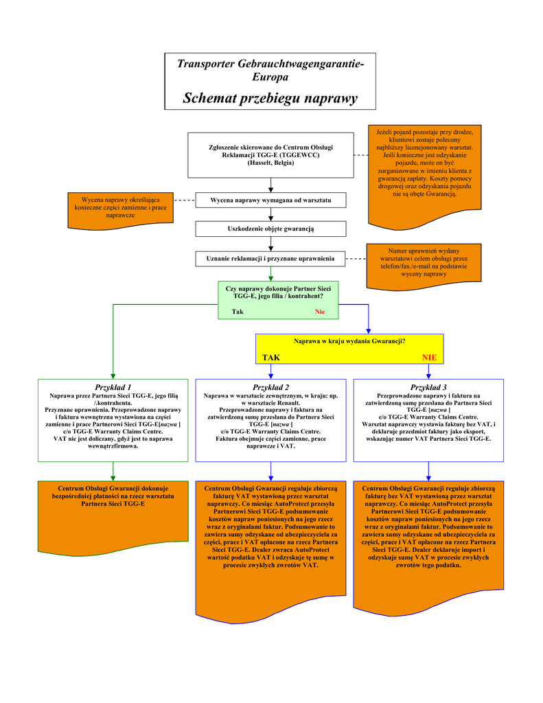 Transporter GebrauchtwagengarantieEuropa Schemat przebiegu naprawy Zgłoszenie skierowane do Centrum Obsługi Reklamacji TGG-E (TGGEWCC) (Hasselt, Belgia) Wycena naprawy określająca konieczne części zamienne i prace naprawcze Wycena naprawy wymagana od warsztatu Jeżeli pojazd pozostaje przy drodze, klientowi zostaje polecony najbliższy licencjonowany warsztat. Jeśli konieczne jest odzyskanie pojazdu, może on być zorganizowane w imieniu klienta z gwarancją zapłaty. Koszty pomocy drogowej oraz odzyskania pojazdu nie są obęte Gwarancją. Uszkodzenie objęte gwarancją Uznanie reklamacji i przyznane uprawnienia Numer uprawnień wydany warsztatowi celem obsługi przez telefon/fax./e-mail na podstawie wyceny naprawy Czy naprawy dokonuje Partner Sieci TGG-E, jego filia / kontrahent? Tak Nie Naprawa w kraju wydania Gwarancji? TAK NIE Przykład 1 Przykład 2 Przykład 3 Naprawa przez Partnera Sieci TGG-E, jego filią /.kontrahenta. Przyznane uprawnienia. Przeprowadzone naprawy i faktura wewnętrzna wystawiona na części zamienne i prace Partnerowi Sieci TGG-E[nazwa ] c/o TGG-E Warranty Claims Centre. VAT nie jest doliczany, gdyż jest to naprawa wewnątrzfirmowa. Naprawa w warsztacie zewnętrznym, w kraju: np. w warsztacie Renault. Przeprowadzone naprawy i faktura na zatwierdzoną sumę przesłana do Partnera Sieci TGG-E [nazwa ] c/o TGG-E Warranty Claims Centre. Faktura obejmuje części zamienne, prace naprawcze i VAT. Przeprowadzone naprawy i faktura na zatwierdzoną sumę przesłana do Partnera Sieci TGG-E [nazwa ] c/o TGG-E Warranty Claims Centre. Warsztat naprawczy wystawia fakturę bez VAT, i deklaruje przedmiot faktury jako eksport, wskazując numer VAT Partnera Sieci TGG-E. Centrum Obsługi Gwarancji dokonuje bezpośredniej płatności na rzecz warsztatu Partnera Sieci TGG-E Centrum Obsługi Gwarancji reguluje zbiorczą fakturę VAT wystawioną przez warsztat naprawczy. Co miesiąc AutoProtect przesyła Partnerowi Sieci TGG-E podsumowanie kosztów napraw poniesionych na jego rzecz wraz z oryginałami faktur. Podsumowanie to zawiera sumy odzyskane od ubezpieczyciela za części, prace i VAT opłacone na rzecz Partnera Sieci TGG-E. Dealer zwraca AutoProtect wartość podatku VAT i odzyskuje tę sumę w procesie zwykłych zwrotów VAT. Centrum Obsługi Gwarancji reguluje zbiorczą fakturę bez VAT wystawioną przez warsztat naprawczy. Co miesiąc AutoProtect przesyła Partnerowi Sieci TGG-E podsumowanie kosztów napraw poniesionych na jego rzecz wraz z oryginałami faktur. Podsumowanie to zawiera sumy odzyskane od ubezpieczyciela za części, prace i VAT opłacone na rzecz Partnera Sieci TGG-E. Dealer deklaruje import i odzyskuje sumę VAT w procesie zwykłych zwrotów tego podatku.