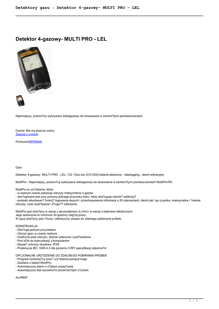 Detektory gazu : Detektor 4-gazowy- MULTI PRO - LEL Detektor 4-gazowy- MULTI PRO - LEL Najmniejszy, przeno?ny wykrywacz wielogazowy do stosowania w zamkni?tych pomieszczeniach Ocena: Nie ma jeszcze oceny Zapytaj o produkt ProducentSPERIAN Opis Detektor 4-gazowy- MULTI PRO - LEL / O2 / Duo-tox (CO-H2S) bateria alkaiczna - datalogging - alarm wibracyjny MultiPro - Najmniejszy, przeno?ny wykrywacz wielogazowy do stosowania w zamkni?tych pomieszczeniach MultiProTM. MultiPro to urz?dzenie, które: - w realnym czasie pokazuje odczyty maksymalnie 4 gazów. - obs?ugiwane jest przy pomocy jednego przycisku trybu, który obs?uguje równie? kalibracj? - posiada wbudowan? funkcj? logowania danych i przechowywania informacji o 20 zdarzeniach, takich jak: typ czujnika, maksymalne i ?rednie odczyty, czas wyst?pienia i d?ugo?? zdarzenia. MultiPro jest dost?pny w wersji z akumulatorem (Li-Ion) i w wersji z bateriami alkalicznymi. Jego autonomia to minimum 24 godziny ciag?ej pracy.. W opcji dost?pny jest r?czny i elektryczny zestaw do zdalnego pobierania próbek. KONSTRUKCJA - Obs?uga jednym przyciskiem - Odczyt gazu w czasie realnym - Graficzne pole odczytu, dobrze widoczne i pod?wietlone. - Port IrDA do komunikacji z komputerem - Stopie? ochrony obudowy: IPX5 - Przekracza IEC 1000-4-3 dla poziomu 3 RFI specyfikacji odporno?ci OPCJONALNE URZ?DZENIE DO ZDALNEGO POBIRANIA PRÓBEK - Program kontroluj?cy prac? urz?dzenia pompuj?cego - Zasilane z baterii MultiPro - Automatyczny alarm o s?abym przep?ywie - Automatyczny test szczelno?ci przed ka?dym u?yciem ALARMY 1 / 2 Detektory gazu : Detektor 4-gazowy- MULTI PRO - LEL - Ostrzegawczy, zagro?enie, STEL i TWA - Jasne ?wiat?o diody alarmowej. - G?o?ny alarm d?wi?kowy o sile 92dB z odleg?o?ci 30 cm - Opcjonalny alarm wibracyjny CZUJNIKI I KALIBRACJA - Trzy czujniki i maksymalnie 4 kana?y wykrywania: O2, LEL, oraz wybór: CO, H2S lub czujnika Duo-Tox CO/H2S - ?atwo wymienialne czujniki - Kalibracja wykonywana przy pomocy jednego przycisku - Wska?niki skali czujników zarezerwowane dla czynno?ci serwisowych. - Kompatybilno?? ze Systemem Logowania Danych IQ i Multi Pro IQ Ekspress BATERIE - Zamiennie wersja na baterie alkalicznie lub akumulator (Li-Ion). - Autonomia do 24 godzin (bez zestawu do zdalnego pobierania próbek). 2 / 2 Powered by TCPDF (www.tcpdf.org)