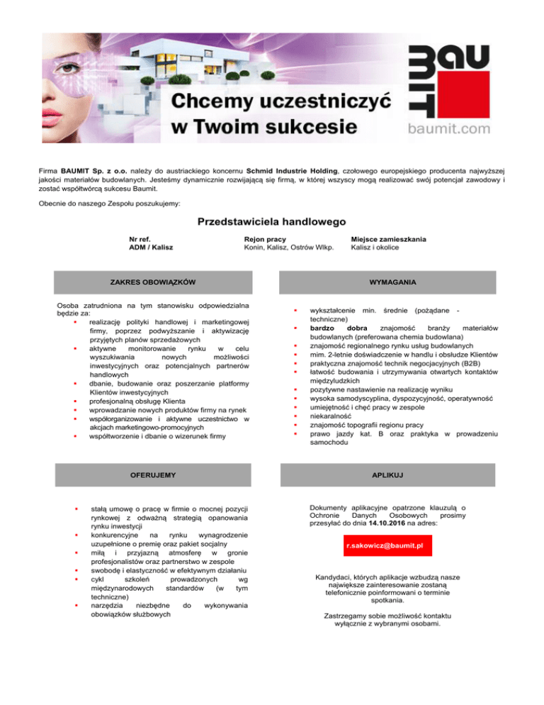 Firma BAUMIT Sp. z o.o. należy do austriackiego koncernu Schmid Industrie Holding, czołowego europejskiego producenta najwyższej jakości materiałów budowlanych. Jesteśmy dynamicznie rozwijającą się firmą, w której wszyscy mogą realizować swój potencjał zawodowy i zostać współtwórcą sukcesu Baumit. Obecnie do naszego Zespołu poszukujemy: Przedstawiciela handlowego Nr ref. ADM / Kalisz Rejon pracy Konin, Kalisz, Ostrów Wlkp. ZAKRES OBOWIĄZKÓW Osoba zatrudniona na tym stanowisku odpowiedzialna będzie za:  realizację polityki handlowej i marketingowej firmy, poprzez podwyższanie i aktywizację przyjętych planów sprzedażowych  aktywne monitorowanie rynku w celu wyszukiwania nowych możliwości inwestycyjnych oraz potencjalnych partnerów handlowych  dbanie, budowanie oraz poszerzanie platformy Klientów inwestycyjnych  profesjonalną obsługę Klienta  wprowadzanie nowych produktów firmy na rynek  współorganizowanie i aktywne uczestnictwo w akcjach marketingowo-promocyjnych  współtworzenie i dbanie o wizerunek firmy OFERUJEMY       stałą umowę o pracę w firmie o mocnej pozycji rynkowej z odważną strategią opanowania rynku inwestycji konkurencyjne na rynku wynagrodzenie uzupełnione o premię oraz pakiet socjalny miłą i przyjazną atmosferę w gronie profesjonalistów oraz partnerstwo w zespole swobodę i elastyczność w efektywnym działaniu cykl szkoleń prowadzonych wg międzynarodowych standardów (w tym techniczne) narzędzia niezbędne do wykonywania obowiązków służbowych Miejsce zamieszkania Kalisz i okolice WYMAGANIA             wykształcenie min. średnie (pożądane techniczne) bardzo dobra znajomość branży materiałów budowlanych (preferowana chemia budowlana) znajomość regionalnego rynku usług budowlanych mim. 2-letnie doświadczenie w handlu i obsłudze Klientów praktyczna znajomość technik negocjacyjnych (B2B) łatwość budowania i utrzymywania otwartych kontaktów międzyludzkich pozytywne nastawienie na realizację wyniku wysoka samodyscyplina, dyspozycyjność, operatywność umiejętność i chęć pracy w zespole niekaralność znajomość topografii regionu pracy prawo jazdy kat. B oraz praktyka w prowadzeniu samochodu APLIKUJ Dokumenty aplikacyjne opatrzone klauzulą o Ochronie Danych Osobowych prosimy przesyłać do dnia 14.10.2016 na adres: [email protected] Kandydaci, których aplikacje wzbudzą nasze największe zainteresowanie zostaną telefonicznie poinformowani o terminie spotkania. Zastrzegamy sobie możliwość kontaktu wyłącznie z wybranymi osobami.