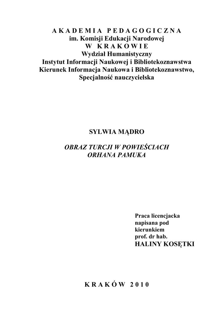 AKADEMIA PEDAGOGICZNA im. Komisji Edukacji Narodowej W KRAKOWIE Wydział Humanistyczny Instytut Informacji Naukowej i Bibliotekoznawstwa Kierunek Informacja Naukowa i Bibliotekoznawstwo, Specjalność nauczycielska SYLWIA MĄDRO OBRAZ TURCJI W POWIEŚCIACH ORHANA PAMUKA Praca licencjacka napisana pod kierunkiem prof. dr hab. HALINY KOSĘTKI KRAKÓW 2010 SPIS TREŚCI Wstęp ............................................................................................................ 3 1. Orhan Pamuk i Stambuł ......................................................................... 5 1.1. Orhan Pamuk ............................................................................... 5 1.2. Stambuł ........................................................................................ 7 2. Turecka rodzina ...................................................................................... 16 2.1. Fatma i Selahattin ........................................................................ 16 2.2. Dogan ........................................................................................... 25 2.3. Hasan ........................................................................................... 30 2.4. Faruk ............................................................................................ 33 2.5. Metin ............................................................................................ 37 2.6. Nilgun .......................................................................................... 39 3. Między Wschodem, a Zachodem ........................................................... 45 Zakończenie ................................................................................................ 57 Bibliografia .................................................................................................. 58 Spis fotografii ............................................................................................... 60 2 WSTĘP Literacka Nagroda Nobla przyznana w 2006 roku Orhanowi Pamukowi – cenionemu w Turcji pisarzowi - stała się szansą na popularyzację tureckiej kultury w Europie1. Turcja znajduje się w zupełnie innym od Europy kręgu kulturowym, dlatego też jest to świat obcy rzeczywistości, którą zna większość Europejczyków 2. Przez wielu Turcja kojarzona jest głównie z zagranicznymi wycieczkami, turecką kuchnią i emigrantami. Jesteśmy osadzeni w kulturze i tradycji europejskiej, dlatego Turcja to dla Europejczyków miejsce raczej egzotyczne. Literatura Pamuka otworzyła drogę do lepszego poznania mentalności, kultury, obyczajów, myśli społecznej, politycznej czy historycznej Turków. Jest to możliwe, ponieważ Pamuk to pisarz, który tkwi w tradycji wschodniej, ale nieobca jest mu także kultura europejska. Jego ojciec, człowiek wykształcony, mogący pochwalić się pokaźną biblioteką, do której Pamuk miał dostęp, zaszczepił w synu umiłowanie dla europejskich wartości jak wolność, równość i braterstwo oraz szacunek dla europejskiej literatury3. Za swoistą metaforę własnej twórczości Pamuk uznaje most łączący dwa brzegi Bosforu. Czuje się tak, jakby ciągle na nim stał, nie należąc ani do europejskiej części Turcji, ani do azjatyckiej, i obie je opisując4. Ta dwukulturowość powoduje, że potrafi on przełożyć tajemnice kultury Wschodu na język kultury Zachodu5, dzięki czemu możemy mieć szersze wyobrażenie i wiedzę o wschodniej cywilizacji. Pamuk zwraca uwagę na to, w jaki sposób skomplikowana historia Turcji wpłynęła na sytuację i sposób myślenia jej mieszkańców. Imperium Osmańskie powstało w XIII wieku i przez wiele lat, a zwłaszcza w wieku XVI i XVII, było to jedno z najpotężniejszych politycznie i militarnie państw na świecie. Od XVIII wieku siła Imperium ulegała jednak coraz większemu osłabieniu, którego konsekwencją były częściowe rozbiory po I wojnie światowej. W roku 1923 przekształciło się ono w 1 Orhan Pamuk zmienia obraz Turcji, http://ksiazki.wp.pl/tytul,Orhan-Pamuk-zmienia-obrazTurcji,wid,8156,wiadomosc.html, 20 maja 2010 2 Anna Polat opowiada o tłumaczeniu książek Orhana Pamuka, http://www.youtube.com/watch?v=3qc0M3vq20I&NR=1, 20 maja 2010 3 Conversations with History - Orhan Pamuk, http://www.youtube.com/watch?v=zy62YqDeE0c, 20 maja 2010 4 Nobel dla Orhana Pamuka, http://wiadomosci.gazeta.pl/wiadomosci/1,55670,3681604.html, 20 maja 2010 5 Literacka Nagroda Nobla dla Turka - Orhana Pamuka, http://www.ksiazka.net.pl/?id=archiwum09&uid=8259, 20 maja 2010 3 republikę, której pierwszym prezydentem został Mustafa Kemal, nazwany później Atatürkiem. Kultury Wschodu i Zachodu od dawna przenikały się, jednak Kemal uznał kulturę zachodnią za lepszą od wschodniej i postawił sobie za cel radykalną europeizację kraju. Kobietom zakazano nosić chusty. Alfabet arabski zastąpiono łacińskim. Meczet podporządkowano państwu, a ludy zamieszkujące Turcję zostały w imię jedności narodowej albo uznane za Turków, albo zmuszone do opuszczenia kraju. Manifestacje odrębności etnicznej zwalczano szykanami i terrorem, aż po regularną wojnę z Kurdami we wschodniej Anatolii (…). Ten drakoński model westernizacji wprowadził Turcję w ślepą uliczkę, bo nie wynikał z wewnętrznej dynamiki kultury tureckiej, lecz jedynie naśladował zachodnie wzorce6. Tymczasem Turcja była krajem wielobarwnym i zróżnicowanym. Przymusowa europeizacja sprawiła, że w XX wieku Turcja szamotała się między uwielbieniem Zachodu, próbami jego imitacji, a pamięcią o własnej tradycji, korzeniach. Dodatkowy rozdźwięk wywoływały wszędzie obecne pozostałości po świecie ottomańskim, ruiny przypominające o dawnej świetności oraz fakt, że mimo geograficznej bliskości Europy Stambuł nie miał tych samych praw, panowała w nim bieda, a rzeczy nie zmieniały się tak szybko jak w Europie. Europa korzystała z wysokich standardów, które jednak nie staw