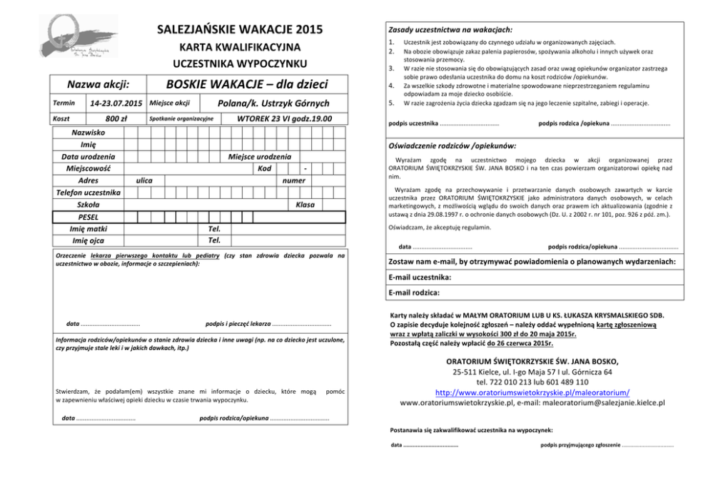 SALEZJAŃSKIE WAKACJE 2015 Zasady uczestnictwa na wakacjach: 1. 2. Uczestnik jest zobowiązany do czynnego udziału w organizowanych zajęciach. Na obozie obowiązuje zakaz palenia papierosów, spożywania alkoholu i innych używek oraz stosowania przemocy. 3. W razie nie stosowania się do obowiązujących zasad oraz uwag opiekunów organizator zastrzega sobie prawo odesłania uczestnika do domu na koszt rodziców /opiekunów. 4. Za wszelkie szkody zdrowotne i materialne spowodowane nieprzestrzeganiem regulaminu odpowiadam za moje dziecko osobiście. 5. W razie zagrożenia życia dziecka zgadzam się na jego leczenie szpitalne, zabiegi i operacje. KARTA KWALIFIKACYJNA UCZESTNIKA WYPOCZYNKU BOSKIE WAKACJE – dla dzieci Nazwa akcji: Termin Koszt Polana/k. Ustrzyk Górnych 14-‐23.07.2015 Miejsce akcji 800 zł WTOREK 23 VI godz.19.00 Spotkanie organizacyjne Nazwisko Imię Data urodzenia Miejscowość Adres Telefon uczestnika Szkoła PESEL Imię matki Imię ojca ulica Miejsce urodzenia Kod -‐ numer Klasa Tel. kont. Tel. kont. podpis uczestnika ................................... podpis rodzica /opiekuna ................................... Oświadczenie rodziców /opiekunów: Wyrażam zgodę na uczestnictwo mojego dziecka w akcji organizowanej przez ORATORIUM ŚWIĘTOKRZYSKIE ŚW. JANA BOSKO i na ten czas powierzam organizatorowi opiekę nad nim. Wyrażam zgodę na przechowywanie i przetwarzanie danych osobowych zawartych w karcie uczestnika przez ORATORIUM ŚWIĘTOKRZYSKIE jako administratora danych osobowych, w celach marketingowych, z możliwością wglądu do swoich danych oraz prawem ich aktualizowania (zgodnie z ustawą z dnia 29.08.1997 r. o ochronie danych osobowych (Dz. U. z 2002 r. nr 101, poz. 926 z póź. zm.). Oświadczam, że akceptuję regulamin. data ................................... podpis rodzica/opiekuna ................................... Orzeczenie lekarza pierwszego kontaktu lub pediatry (czy stan zdrowia dziecka pozwala na uczestnictwo w obozie, informacje o szczepieniach): E-‐mail uczestnika: Zostaw nam e-‐mail, by otrzymywać powiadomienia o planowanych wydarzeniach: E-‐mail rodzica: data ................................... podpis i pieczęć lekarza ................................... Informacja r odziców/opiekunów o s tanie z drowia dziecka i inne uwagi (np. na co dziecko jest uczulone, czy przyjmuje stale leki i w jakich dawkach, itp.) Stwierdzam, że podałam(em) wszystkie znane mi informacje o dziecku, które mogą pomóc w zapewnieniu właściwej opieki dziecku w czasie trwania wypoczynku. Karty należy składać w MAŁYM ORATORIUM LUB U KS. ŁUKASZA KRYSMALSKIEGO SDB. O zapisie decyduje kolejność zgłoszeń – należy oddać wypełnioną kartę zgłoszeniową wraz z wpłatą zaliczki w wysokości 300 zł do 20 maja 2015r. Pozostałą część należy wpłacić do 26 czerwca 2015r. ORATORIUM ŚWIĘTOKRZYSKIE ŚW. JANA BOSKO, 25-‐511 Kielce, ul. I-‐go Maja 57 I ul. Górnicza 64 tel. 722 010 213 lub 601 489 110 http://www.oratoriumswietokrzyskie.pl/maleoratorium/ www.oratoriumswietokrzyskie.pl, e-‐mail: [email protected] data ................................... podpis rodzica/opiekuna ................................... Postanawia się zakwalifikować uczestnika na wypoczynek: data ................................... podpis przyjmującego zgłoszenie ...................................
