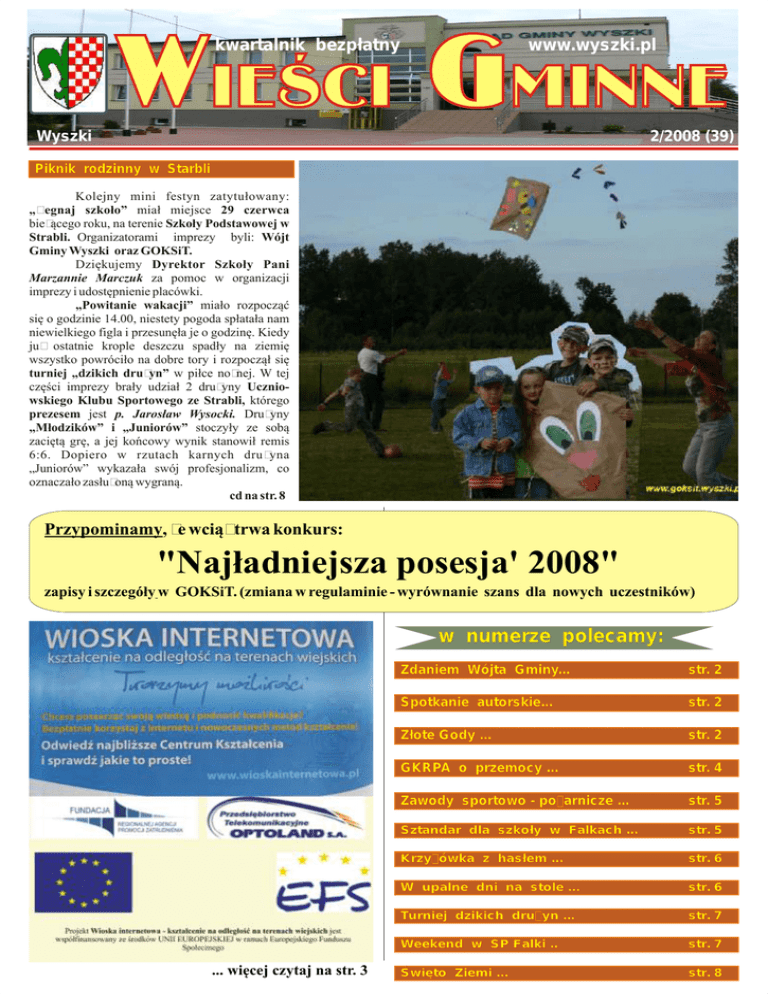 WIEŚCI GMINNE kwartalnik bezpłatny Wyszki www.wyszki.pl 2/2008 (39) Piknik rodzinny w Starbli Kolejny mini festyn zatytułowany: „Żegnaj szkoło” miał miejsce 29 czerwca bieżącego roku, na terenie Szkoły Podstawowej w Strabli. Organizatorami imprezy byli: Wójt Gminy Wyszki oraz GOKSiT. Dziękujemy Dyrektor Szkoły Pani Marzannie Marczuk za pomoc w organizacji imprezy i udostępnienie placówki. „Powitanie wakacji” miało rozpocząć się o godzinie 14.00, niestety pogoda spłatała nam niewielkiego figla i przesunęła je o godzinę. Kiedy już ostatnie krople deszczu spadły na ziemię wszystko powróciło na dobre tory i rozpoczął się turniej „dzikich drużyn” w piłce nożnej. W tej części imprezy brały udział 2 drużyny Uczniowskiego Klubu Sportowego ze Strabli, którego prezesem jest p. Jarosław Wysocki. Drużyny „Młodzików” i „Juniorów” stoczyły ze sobą zaciętą grę, a jej końcowy wynik stanowił remis 6:6. Dopiero w rzutach karnych drużyna „Juniorów” wykazała swój profesjonalizm, co oznaczało zasłużoną wygraną. cd na str. 8 Przypominamy, że wciąż trwa konkurs: "Najładniejsza posesja' 2008" zapisy i szczegóły w GOKSiT. (zmiana w regulaminie - wyrównanie szans dla nowych uczestników) w numerze polecamy: ... więcej czytaj na str. 3 Zdaniem Wójta Gminy... str. 2 Spotkanie autorskie... str. 2 Złote Gody ... str. 2 GKRPA o przemocy ... str. 4 Zawody sportowo - pożarnicze ... str. 5 Sztandar dla szkoły w Falkach ... str. 5 Krzyżówka z hasłem ... str. 6 W upalne dni na stole ... str. 6 Turniej dzikich drużyn ... str. 7 Weekend w SP Falki .. str. 7 Święto Ziemi ... str. 8 Zdaniem Wójta Gminy Problem, który chciałbym tutaj poruszyć nie jest czymś nowym ani dotyczącym tylko naszej gminy. Ma raczej charakter socjologiczno - psychologiczny. Chodzi mi o postawy wielu obywateli w sytuacjach, gdy trzeba dać coś od siebie na rzecz ogółu społeczeństwa. Nie chodzi mi w tym momencie, o jakieś jednorazowe datki lub ofiary dla potrzebujących. Chodzi o postawę niektórych ludzi w sytuacji, gdy trzeba wyrazić zgodę na udostępnienie własnej działki na przeprowadzenie inwestycji liniowej np. wodociąg, kanalizacja, droga itp. Ale zanim zacznę dalszą analizę tego zjawiska muszę jeszcze kilka zdań powiedzieć o innej części tego problemu. Nadal panuje u nas podział na „my mieszkańcy i oni władza”. Jest to, co najmniej, trudne do zrozumienia w sytuacji, że wybieramy ich w wolnych demokratycznych wyborach. cd na str. 3 W związku z przystąpieniem do opracowania historii Gminy Wyszki i poszczególnych jej miejscowości zwracamy się z gorącą prośbą o udostępnienie swoich rodzinnych zbiorów zdjęć, na których uwidocznione zostały dawne budynki, stroje, narzędzia pracy, inne, jak również zdjęcia ukazujące dawne życie mieszkańców, dokumenty z dawnych lat, druki itp. Osoby mające takie zdjęcia zapraszamy do sekretariatu Urzędu Gminy Wyszki lub GOKSiT, gdzie zdjęcia zostaną zeskanowane, po czym oddane właścicielom. W ramach podziękowania, w wydaniu książkowym historii będzie zamieszczona informacja o osobach, których zdjęcia zostały zamieszczone w publikacji. Z góry serdecznie dziękujemy za okazaną pomoc Wójt Gmin Ryszard Perkowski Spotkanie autorskie z p.Cecylią Łozińską-Grzywacz Kolejny miesiąc i kolejne spotkanie członków Klubu Seniora "Razem". Pani Eugenia Gromada zaprosiła przewodniczącego Związku Emerytów i Rencistów O/Bielsk Podlaski p.Stefana Iwaniuka oraz p.Cecylię Łozińską - Grzywacz, autorkę wspomnień "Oczami dziecka". Pani Lila (bo tak się do niej zwracaliśmy) pochodzi z Wyszek a obecnie na stałe mieszka w USA Spotkanie rozpoczął dyr. GOKSiT p.Henryk Zalewski witając gości i wszystkich członków koła. Następnie głos zabrała przewodnicząca klubu p.Gromada. Powiedziała co było powodem i inspiracją do zaproszenia właśnie tych osób na nasze spotkanie. Od samego początku spotkania była miła, wręcz rodzinna atmosfera. Pani Lila opowiadała o swoich przeżyciach, o książce, o "okrzyczanej ameryce". Do rozmowy włączyli się inni, podzielili wspomnieniami dawnych czasów w Wyszkach. Zaczęto porównywać warunki bytowe emerytów w kraju i za granicą. "Wszędzie dobrze, gdzie nas nie ma"... Podarowała każdemu uczestnikowi tomik wierszy "Moje tęsknoty" oraz wspomnienia z lat dziecięcych "Oczami dziecka". Wszyscy otrzymali autograf Pani Cecylii, która to z nieukrywaną przyjemnością podpisywała własne książki. Z nieukrywaną przyjemnością, ponieważ mogła spotkać się z dawnymi znajomymi i przyjaciółmi z Wyszek. Rozmawiano również o Związku Sybiraków. Jeden z emerytów pokazał pamiątkową monetę(fot) z 2008r. wybitą właśnie na cześć wszystkich męczenników tamtych lat. Następnie p.Stefan Iwaniuk przedstawił korzyści z przynależności do Koła Emerytów przy symbolicznej składce rocznej 18zł. W ten sposób dopisało się jeszcze kilka osób z Klubu Seniora "Razem", twierdząc, że "Biała Pani" i tak przyjdzie, a nie można biernie na nią czekać. Kilkugodzinne spotkanie zakończyło się wspólnym pamiątkowym zdjeciem i podziękowaniem zaproszonym gościom za przybycie. (hz) Złote Gody w UG Wyszki str. 2 W dniu 27 kwietnia br. w naszej gminie obchodziliśmy uroczystość Złotych Godów. Jest to wyjątkowe święto, 50 wspólnie przeżytych lat to symbol wzajemnej miłości i wierności. Za zgodność pożycia małżeńskiego, za trud pracy i wyrzeczeń dla dobra swych rodzin założonych przed pół wiekiem Jubilaci zostali odznaczeni medalami przyznanymi przez Prezydenta RP. Aktu dekoracji dokonał Wójt Gminy Wyszki Pan Ryszard Perkowski. Na uroczystość przybyły również rodziny Jubilatów, ks. proboszcz parafii Wyszki Andrzej Ulaczyk i Skarbnik Gminy Pani Stanisława Ryczkowska. Spotkanie odbyło się w sympatycznej atmosferze. Były gratulacje, życzenia, pamiątkowe dyplomy i zd