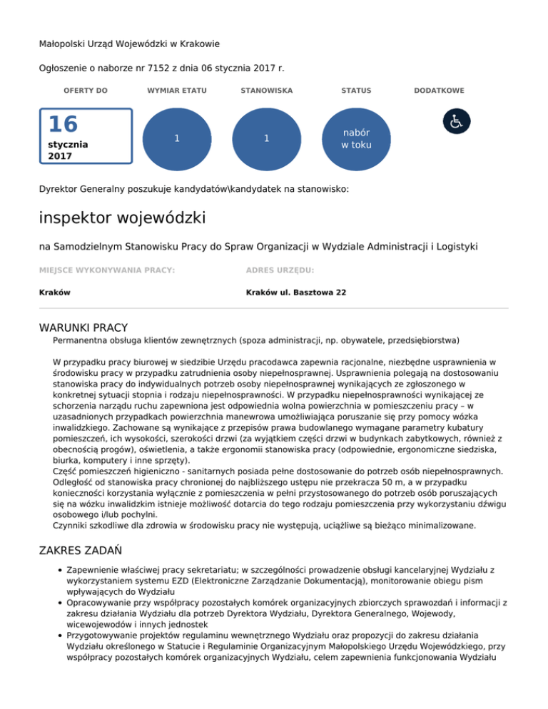 Małopolski Urząd Wojewódzki w Krakowie Ogłoszenie o naborze nr 7152 z dnia 06 stycznia 2017 r. OFERTY DO 16 stycznia 2017 WYMIAR ETATU STANOWISKA STATUS 1 1 nabór w toku DODATKOWE Dyrektor Generalny poszukuje kandydatów\kandydatek na stanowisko: inspektor wojewódzki na Samodzielnym Stanowisku Pracy do Spraw Organizacji w Wydziale Administracji i Logistyki MIEJSCE WYKONYWANIA PRACY: ADRES URZĘDU: Kraków Kraków ul. Basztowa 22 WARUNKI PRACY Permanentna obsługa klientów zewnętrznych (spoza administracji, np. obywatele, przedsiębiorstwa) W przypadku pracy biurowej w siedzibie Urzędu pracodawca zapewnia racjonalne, niezbędne usprawnienia w środowisku pracy w przypadku zatrudnienia osoby niepełnosprawnej. Usprawnienia polegają na dostosowaniu stanowiska pracy do indywidualnych potrzeb osoby niepełnosprawnej wynikających ze zgłoszonego w konkretnej sytuacji stopnia i rodzaju niepełnosprawności. W przypadku niepełnosprawności wynikającej ze schorzenia narządu ruchu zapewniona jest odpowiednia wolna powierzchnia w pomieszczeniu pracy – w uzasadnionych przypadkach powierzchnia manewrowa umożliwiająca poruszanie się przy pomocy wózka inwalidzkiego. Zachowane są wynikające z przepisów prawa budowlanego wymagane parametry kubatury pomieszczeń, ich wysokości, szerokości drzwi (za wyjątkiem części drzwi w budynkach zabytkowych, również z obecnością progów), oświetlenia, a także ergonomii stanowiska pracy (odpowiednie, ergonomiczne siedziska, biurka, komputery i inne sprzęty). Część pomieszczeń higieniczno - sanitarnych posiada pełne dostosowanie do potrzeb osób niepełnosprawnych. Odległość od stanowiska pracy chronionej do najbliższego ustępu nie przekracza 50 m, a w przypadku konieczności korzystania wyłącznie z pomieszczenia w pełni przystosowanego do potrzeb osób poruszających się na wózku inwalidzkim istnieje możliwość dotarcia do tego rodzaju pomieszczenia przy wykorzystaniu dźwigu osobowego i/lub pochylni. Czynniki szkodliwe dla zdrowia w środowisku pracy nie występują, uciążliwe są bieżąco minimalizowane. ZAKRES ZADAŃ Zapewnienie właściwej pracy sekretariatu; w szczególności prowadzenie obsługi kancelaryjnej Wydziału z wykorzystaniem systemu EZD (Elektroniczne Zarządzanie Dokumentacją), monitorowanie obiegu pism wpływających do Wydziału Opracowywanie przy współpracy pozostałych komórek organizacyjnych zbiorczych sprawozdań i informacji z zakresu działania Wydziału dla potrzeb Dyrektora Wydziału, Dyrektora Generalnego, Wojewody, wicewojewodów i innych jednostek Przygotowywanie projektów regulaminu wewnętrznego Wydziału oraz propozycji do zakresu działania Wydziału określonego w Statucie i Regulaminie Organizacyjnym Małopolskiego Urzędu Wojewódzkiego, przy współpracy pozostałych komórek organizacyjnych Wydziału, celem zapewnienia funkcjonowania Wydziału zgodnie z procedurami i przepisami oraz czuwaniem nad ich aktualizacją Koordynowanie procesu tworzenia i aktualizacji opisów stanowisk pracy Wydziału, w celu zapewnienia ciągłości i spójności całego procesu WYMAGANIA NIEZBĘDNE Wykształcenie: wyższe doświadczenie zawodowe: 6 miesięcy w administracji publicznej– potwierdzone kopiami świadectw pracy lub innych dokumentów znajomość ustaw ustrojowych, KPA, ustawy o służbie cywilnej, ustawy o wojewodzie i administracji rządowej w województwie, ustawy Prawo zamówień publicznych, prawa pracy, instrukcji kancelaryjnej znajomość struktur administracji publicznej umiejętność obsługi komputera umiejętności analityczne umiejętność interpretacji przepisów prawa Posiadanie obywatelstwa polskiego Korzystanie z pełni praw publicznych Nieskazanie prawomocnym wyrokiem za umyślne przestępstwo lub umyślne przestępstwo skarbowe WYMAGANIA DODATKOWE Wykształcenie: wyższe administracja publiczna staż pracy: 1 rok w administracji publicznej odporność na stres komunikatywność dokładność i zdolność do efektywnej pracy pod presją czasu umiejętność negocjacji umiejętność organizacji pracy szybkość w podejmowaniu decyzji DOKUMENTY I OŚWIADCZENIA NIEZBĘDNE Życiorys/CV i list motywacyjny Kopie dokumentów potwierdzających spełnienie wymagania niezbędnego w zakresie wykształcenia Kopie dokumentów potwierdzających spełnienie wymagania niezbędnego w zakresie doświadczenia zawodowego / stażu pracy Oświadczenie o posiadaniu obywatelstwa polskiego albo kopia dokumentu potwierdzającego posiadanie polskiego obywatelstwa Oświadczenie o wyrażeniu zgody na przetwarzanie danych osobowych do celów naboru Oświadczenie o korzystaniu z pełni praw publicznych Oświadczenie o nieskazaniu prawomocnym wyrokiem za umyślne przestępstwo lub umyślne przestępstwo skarbowe DOKUMENTY I OŚWIADCZENIA DODATKOWE kopia dokumentu potwierdzającego niepełnosprawność - w przypadku kandydatek/kandydatów, zamierzających skorzystać z pierwszeństwa w zatrudnieniu w przypadku, gdy znajdą się w gronie najlepszych kandydatek/kandydatów Kopie dokumentów potwierdzających spełnienie wymagania dodatkowego w zakresie wykształcenia Kopie dokumentów potwierdzających spełnienie wymagania dodatkowego w zakresie doświadczenia zawodowego / stażu pracy TERMINY I MIEJSCE SKŁADANIA DOKUMENTÓW Dokumenty należy złożyć do: 16 stycznia 2017 r. Decyduje data: stempla pocztowego / osobistego dostarczenia oferty do urzędu Miejsce składania dokumentów: Małopolski Urząd Wojewódzki Wydział Administracji i Logistyki ul. Basztowa 22 (pok. 24) 31-156 Kraków z dopiskiem „oferta pracy”. Prosimy o podawanie w liście motywacyjnym nazwy Oddziału, którego oferta dotyczy oraz oznaczenia stanowiska. INNE INFORMACJE: W miesiącu poprzedzającym datę upublicznienia ogłoszenia wskaźnik zatrudnienia osób niepełnosprawnych w urzędzie, w rozumieniu przepisów o rehabilitacji zawodowej i społecznej oraz zatrudnianiu osób niepełnosprawnych, nie wynosi co najmnie