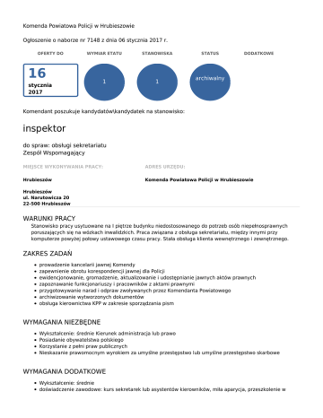 Komenda Powiatowa Policji w Hrubieszowie Ogłoszenie o naborze nr 7148 z dnia 06 stycznia 2017 r. OFERTY DO WYMIAR ETATU STANOWISKA 1 1 16 stycznia 2017 STATUS DODATKOWE archiwalny Komendant poszukuje kandydatów\kandydatek na stanowisko: inspektor do spraw: obsługi sekretariatu Zespół Wspomagający MIEJSCE WYKONYWANIA PRACY: ADRES URZĘDU: Hrubieszów Komenda Powiatowa Policji w Hrubieszowie Hrubieszów ul. Narutowicza 20 22-500 Hrubieszów WARUNKI PRACY Stanowisko pracy usytuowane na I piętrze budynku niedostosowanego do potrzeb osób niepełnosprawnych poruszających się na wózkach inwalidzkich. Praca związana z obsługa sekretariatu, między innymi przy komputerze powyżej połowy ustawowego czasu pracy. Stała obsługa klienta wewnętrznego i zewnętrznego. ZAKRES ZADAŃ prowadzenie kancelarii jawnej Komendy zapewnienie obrotu korespondencji jawnej dla Policji ewidencjonowanie, gromadzenie, aktualizowanie i udostępnianie jawnych aktów prawnych zapoznawanie funkcjonariuszy i pracowników z aktami prawnymi przygotowywanie narad i odpraw zwoływanych przez Komendanta Powiatowego archiwizowanie wytworzonych dokumentów obsługa kierownictwa KPP w zakresie sporządzania pism WYMAGANIA NIEZBĘDNE Wykształcenie: średnie Kierunek administracja lub prawo Posiadanie obywatelstwa polskiego Korzystanie z pełni praw publicznych Nieskazanie prawomocnym wyrokiem za umyślne przestępstwo lub umyślne przestępstwo skarbowe WYMAGANIA DODATKOWE Wykształcenie: średnie doświadczenie zawodowe: kurs sekretarek lub asystentów kierowników, miła aparycja, przeszkolenie w pracy biurowej DOKUMENTY I OŚWIADCZENIA NIEZBĘDNE Życiorys/CV i list motywacyjny Kopie dokumentów potwierdzających spełnienie wymagania niezbędnego w zakresie wykształcenia Oświadczenie o posiadaniu obywatelstwa polskiego albo kopia dokumentu potwierdzającego posiadanie polskiego obywatelstwa Oświadczenie o wyrażeniu zgody na przetwarzanie danych osobowych do celów naboru Oświadczenie o korzystaniu z pełni praw publicznych Oświadczenie o nieskazaniu prawomocnym wyrokiem za umyślne przestępstwo lub umyślne przestępstwo skarbowe DOKUMENTY I OŚWIADCZENIA DODATKOWE Kopie dokumentów potwierdzających spełnienie wymagania dodatkowego w zakresie wykształcenia Kopie dokumentów potwierdzających spełnienie wymagania dodatkowego w zakresie doświadczenia zawodowego / stażu pracy TERMINY I MIEJSCE SKŁADANIA DOKUMENTÓW Dokumenty należy złożyć do: 16 stycznia 2017 r. Decyduje data: wpływu oferty do urzędu Miejsce składania dokumentów: Komenda Powiatowa Policji w Hrubieszowie ul. Narutowicza 20 22-500 Hrubieszów INNE INFORMACJE: W miesiącu poprzedzającym datę upublicznienia ogłoszenia wskaźnik zatrudnienia osób niepełnosprawnych w urzędzie, w rozumieniu przepisów o rehabilitacji zawodowej i społecznej oraz zatrudnianiu osób niepełnosprawnych, wynosi co najmniej 6%. Oferty przesłane po terminie nie będą brane pod uwagę (liczy się data wpływu). Odpowiadamy tylko na wybrane oferty. Kandydaci zakwalifikowani zostaną powiadomieni o terminie rozmowy wstępnej telefonicznie. Oferty odrzucone zostaną zarchiwizowane. Dodatkowe informacje: (0...84) 696-62-15. Legenda Pierwszeństwo dla osób z niepełnosprawnościami Ogłoszenie z tym symbolem oznacza, że pierwszeństwo w zatrudnieniu mają osoby z niepełnosprawnościami, które spełniają wszystkie następujące warunki: • złożyły w terminie ofertę wraz z dokumentem potwierdzającym niepełnosprawność, • spełniają warunki wymienione w ogłoszeniu, • po rekrutacji znalazły się w gronie najlepszych kandydatów. Zastępstwo Ogłoszenie z tym symbolem oznacza, że urząd poszukuje kandydatów do pracy na czas przewidywanej nieobecności swojego pracownika. Jeśli w ogłoszeniu nie wskazano okresu zastępstwa, możesz o to spytać w urzędzie. Osoba zatrudniona na zastępstwo jest członkiem korpusu służby cywilnej. Nabór otwarty dla cudzoziemców Ogłoszenie z tym symbolem oznacza, że o stanowisko mogą starać się, poza polskimi obywatelami, również cudzoziemcy. Kandydaci muszą spełniać następujące warunki: • są obywatelami państwa Unii Europejskiej lub innego państwa, którego obywatelom na podstawie umów międzynarodowych lub przepisów prawa wspólnotowego przysługuje prawo podjęcia zatrudnienia na terytorium Polski, • ich znajomość języka polskiego jest potwierdzona jednym z dokumentów wskazanych w rozporządzeniu w sprawie rodzajów dokumentów potwierdzających znajomość języka polskiego przez osoby nieposiadające obywatelstwa polskiego, ubiegające się o zatrudnienie w służbie cywilnej.