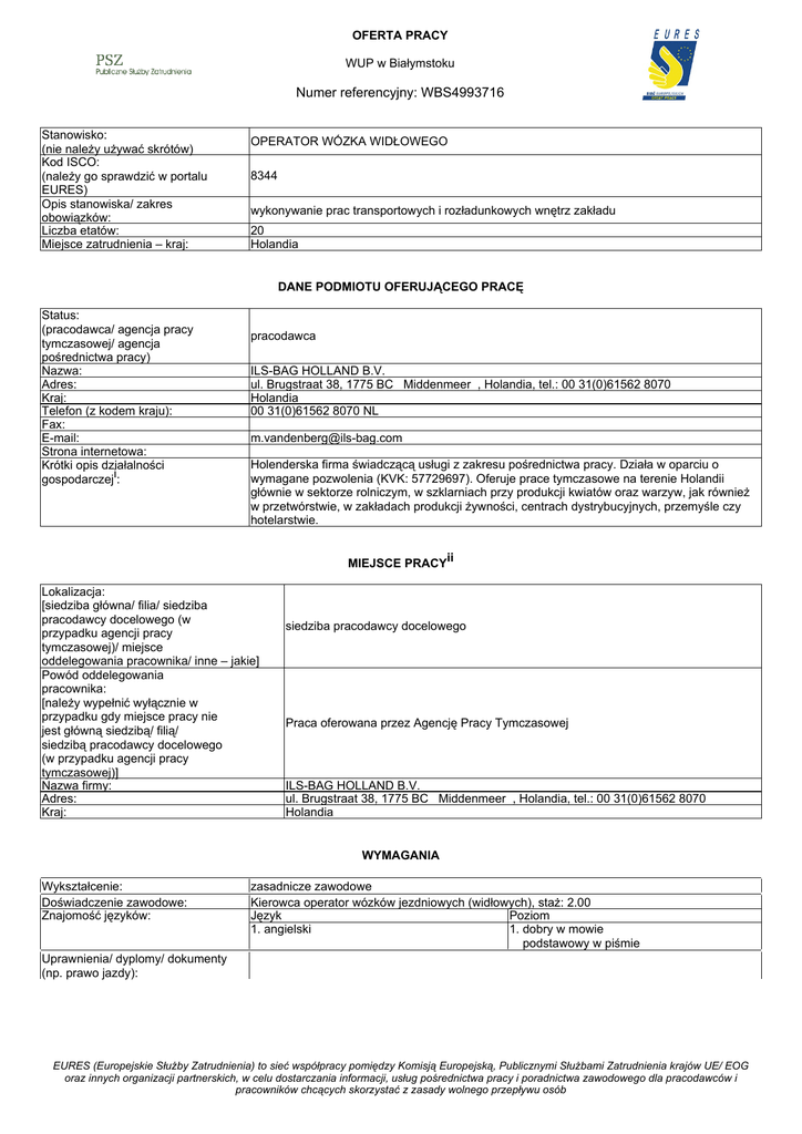 OFERTA PRACY WUP w Białymstoku Numer referencyjny: WBS4993716 Stanowisko: (nie należy używać skrótów) Kod ISCO: (należy go sprawdzić w portalu EURES) Opis stanowiska/ zakres obowiązków: Liczba etatów: Miejsce zatrudnienia – kraj: OPERATOR WÓZKA WIDŁOWEGO 8344 wykonywanie prac transportowych i rozładunkowych wnętrz zakładu 20 Holandia DANE PODMIOTU OFERUJĄCEGO PRACĘ Status: (pracodawca/ agencja pracy tymczasowej/ agencja pośrednictwa pracy) Nazwa: Adres: Kraj: Telefon (z kodem kraju): Fax: E-mail: Strona internetowa: Krótki opis działalności gospodarczeji: pracodawca ILS-BAG HOLLAND B.V. ul. Brugstraat 38, 1775 BC Middenmeer , Holandia, tel.: 00 31(0)61562 8070 Holandia 00 31(0)61562 8070 NL [email protected] Holenderska firma świadczącą usługi z zakresu pośrednictwa pracy. Działa w oparciu o wymagane pozwolenia (KVK: 57729697). Oferuje prace tymczasowe na terenie Holandii głównie w sektorze rolniczym, w szklarniach przy produkcji kwiatów oraz warzyw, jak również w przetwórstwie, w zakładach produkcji żywności, centrach dystrybucyjnych, przemyśle czy hotelarstwie. MIEJSCE PRACYii Lokalizacja: [siedziba główna/ filia/ siedziba pracodawcy docelowego (w przypadku agencji pracy tymczasowej)/ miejsce oddelegowania pracownika/ inne – jakie] Powód oddelegowania pracownika: [należy wypełnić wyłącznie w przypadku gdy miejsce pracy nie jest główną siedzibą/ filią/ siedzibą pracodawcy docelowego (w przypadku agencji pracy tymczasowej)] Nazwa firmy: Adres: Kraj: siedziba pracodawcy docelowego Praca oferowana przez Agencję Pracy Tymczasowej ILS-BAG HOLLAND B.V. ul. Brugstraat 38, 1775 BC Middenmeer , Holandia, tel.: 00 31(0)61562 8070 Holandia WYMAGANIA Wykształcenie: Doświadczenie zawodowe: Znajomość języków: zasadnicze zawodowe Kierowca operator wózków jezdniowych (widłowych), staż: 2.00 Język Poziom 1. angielski 1. dobry w mowie podstawowy w piśmie Uprawnienia/ dyplomy/ dokumenty (np. prawo jazdy): EURES (Europejskie Służby Zatrudnienia) to sieć współpracy pomiędzy Komisją Europejską, Publicznymi Służbami Zatrudnienia krajów UE/ EOG oraz innych organizacji partnerskich, w celu dostarczania informacji, usług pośrednictwa pracy i poradnictwa zawodowego dla pracodawców i pracowników chcących skorzystać z zasady wolnego przepływu osób Inne istotne wymagania: Uprawnienia holenderskie lub polskie do prowadzenia różnych typów wózków widłowych (w przypadku polskich uprawnień starszego typu konieczne tłumaczenie przysięgłe na język holenderski posiadanego dokumentu), elastyczność i dyspozycyjność ze względu na konieczność pracy w systemie zmianowym (godziny nocne). Posiadanie prawa jazdy kat. B oraz referencje - mile widziane. Staż ogółem: 2.0 WYNAGRODZENIE I WARUNKI ZATRUDNIENIA Wysokość pensji brutto: Wysokość pensji netto: Waluta, w jakiej wypłacana jest pensja: Rodzaj stawki wynagrodzenia: (godzinowa/ tygodniowa/ miesięczna/ roczna/ inna) Premie: Dodatkowe świadczenia (zakwaterowanie, wyżywienie, koszty związane ze zmianą miejsca zamieszkania, koszty podróży itp.): 8,87 Euro Czasowy ze stawką godzinową istnieje możliwość wyżywienia na własny koszt, Pensja wypłacana co tydzień. Pracodawca oferuje zakwaterowanie i ubezpieczenie – koszt ponosi pracownik – zakwaterowanie – 65-75 Euro tygodniowo, ubezpieczenie – 22,63 Euro tygodniowo. Opieka polskojęzycznego koordynatora, organizacja transportu do i z Holandii oraz pomiędzy miejscem zakwaterowania a pracą , informacje i wsparcie podczas podróży z Polski do Holandii. ILS-BAG HOLLAND B.V. Nazwa firmy, z którą zostanie podpisana umowa: Rodzaj umowy: (umowa o pracę, umowa zlecenia, wolontariat, praktyka zawodowa/ staż, umowa o pracę praca zdalna, agencja pracy tymczasowej, inne): Wymiar czasu pracy pełny (praca na pełen etat/ część etatu): Czas trwania umowy: określony (nieokreślony/ określony) Liczba godzin tygodniowo: Zmiany i praca w dni wolne: Data rozpoczęcia: Inne informacje: Data wygaśnięcia umowy (w przypadku umowy na czas określony): 2017-03-07 40,00 praca zmianowa 2016-10-07 praca na zmiany, także godziny nocne SPOSÓB SKŁADANIA WNIOSKU Wymagane dokumenty (list motywacyjny, CV itp.): Język, w którym muszą być sporządzone przedkładane dokumenty: Do kogo należy wysłać dokumenty: (do pracodawcy/ doradcy EURES) Gdzie należy wysłać dokumenty: (adres, adres e-mail, nr faksu z kodem kraju itp.) Dane teleadresowe doradcy EURES lub przedstawiciela pracodawcy: (nazwisko, adres, telefon, fax, e-mail itp.) CV z odręcznie podpsianą zgodą na pzretwarzane danych osobowych w języku angielskim lub polskim inne do doradcy EURES z WUP email: [email protected] – w tytule emaila proszę wpisać Holandia – operator wózka widłowego Tel. 85 74 97 235 WUP w Białymstoku, ul. Pogodna 22 15-354 Białystok DODATKOWE INFORMACJE Dane teleadresowe przedstawiciela pracodawcy: Email: [email protected] WAŻNOŚĆ 2016-10-06 Data publikacji: Termin przedkładania podań o pracę / zakończenia ważności oferty: Uprzejmie informujemy, że skontaktujemy się wyłącznie z wybranymi kandydatami. EURES (Europejskie Służby Zatrudnienia) to sieć współpracy pomiędzy Komisją Europejską, Publicznymi Służbami Zatrudnienia krajów UE/ EOG oraz innych organizacji partnerskich, w celu dostarczania informacji, usług pośrednictwa pracy i poradnictwa zawodowego dla pracodawców i pracowników chcących skorzystać z zasady wolnego przepływu osób UWAGA: 1. Umowa z zagranicznym pracodawcą jest zawierana, co do zasady, zgodnie z prawem kraju zatrudnienia. Oznacza to, że wszystkie roszczenia odnośnie warunków, które obejmuje umowa, można kierować wyłącznie do odpowiedniego sądu w kraju zatrudnienia. Publiczne służby zatrudnienia (EURES) nie mogą pośredniczyć ani reprezentować pracownika w sądzie kraju zatrudnienia w przypadku sporu z pracodawcą. 2. Publiczne służby zatrudnienia (EURES) dokł