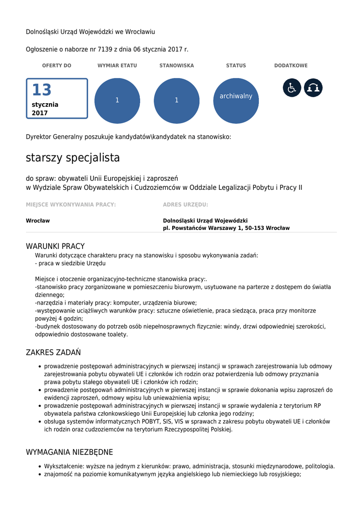 Dolnośląski Urząd Wojewódzki we Wrocławiu Ogłoszenie o naborze nr 7139 z dnia 06 stycznia 2017 r. OFERTY DO WYMIAR ETATU STANOWISKA 1 1 13 stycznia 2017 STATUS DODATKOWE archiwalny Dyrektor Generalny poszukuje kandydatów\kandydatek na stanowisko: starszy specjalista do spraw: obywateli Unii Europejskiej i zaproszeń w Wydziale Spraw Obywatelskich i Cudzoziemców w Oddziale Legalizacji Pobytu i Pracy II MIEJSCE WYKONYWANIA PRACY: ADRES URZĘDU: Wrocław Dolnośląski Urząd Wojewódzki pl. Powstańców Warszawy 1, 50-153 Wrocław WARUNKI PRACY Warunki dotyczące charakteru pracy na stanowisku i sposobu wykonywania zadań: - praca w siedzibie Urzędu Miejsce i otoczenie organizacyjno-techniczne stanowiska pracy:. -stanowisko pracy zorganizowane w pomieszczeniu biurowym, usytuowane na parterze z dostępem do światła dziennego; -narzędzia i materiały pracy: komputer, urządzenia biurowe; -występowanie uciążliwych warunków pracy: sztuczne oświetlenie, praca siedząca, praca przy monitorze powyżej 4 godzin; -budynek dostosowany do potrzeb osób niepełnosprawnych fizycznie: windy, drzwi odpowiedniej szerokości, odpowiednio dostosowane toalety. ZAKRES ZADAŃ prowadzenie postępowań administracyjnych w pierwszej instancji w sprawach zarejestrowania lub odmowy zarejestrowania pobytu obywateli UE i członków ich rodzin oraz potwierdzenia lub odmowy przyznania prawa pobytu stałego obywateli UE i członków ich rodzin; prowadzenie postępowań administracyjnych w pierwszej instancji w sprawie dokonania wpisu zaproszeń do ewidencji zaproszeń, odmowy wpisu lub unieważnienia wpisu; prowadzenie postępowań administracyjnych w pierwszej instancji w sprawie wydalenia z terytorium RP obywatela państwa członkowskiego Unii Europejskiej lub członka jego rodziny; obsługa systemów informatycznych POBYT, SIS, VIS w sprawach z zakresu pobytu obywateli UE i członków ich rodzin oraz cudzoziemców na terytorium Rzeczypospolitej Polskiej. WYMAGANIA NIEZBĘDNE Wykształcenie: wyższe na jednym z kierunków: prawo, administracja, stosunki międzynarodowe, politologia. znajomość na poziomie komunikatywnym języka angielskiego lub niemieckiego lub rosyjskiego; znajomość ustawy o wjeździe, pobycie i wyjeździe z terytorium Rzeczypospolitej Polskiej obywateli krajów członkowskich Unii Europejskiej i członków ich rodzin wraz z aktami wykonawczymi; znajomość ustawy Kodeks postępowania administracyjnego; znajomość ustawy o cudzoziemcach; umiejętność analitycznego myślenia; umiejętność komunikacji pisemnej; komunikatywność; Posiadanie obywatelstwa polskiego Korzystanie z pełni praw publicznych Nieskazanie prawomocnym wyrokiem za umyślne przestępstwo lub umyślne przestępstwo skarbowe DOKUMENTY I OŚWIADCZENIA NIEZBĘDNE Życiorys/CV i list motywacyjny Kopie dokumentów potwierdzających spełnienie wymagania niezbędnego w zakresie wykształcenia Oświadczenie o znajomości na poziomie komunikatywnym języka angielskiego lub niemieckiego lub rosyjskiego; Oświadczenie o posiadaniu obywatelstwa polskiego albo kopia dokumentu potwierdzającego posiadanie polskiego obywatelstwa Oświadczenie o wyrażeniu zgody na przetwarzanie danych osobowych do celów naboru Oświadczenie o korzystaniu z pełni praw publicznych Oświadczenie o nieskazaniu prawomocnym wyrokiem za umyślne przestępstwo lub umyślne przestępstwo skarbowe DOKUMENTY I OŚWIADCZENIA DODATKOWE kopia dokumentu potwierdzającego niepełnosprawność - w przypadku kandydatek/kandydatów, zamierzających skorzystać z pierwszeństwa w zatrudnieniu w przypadku, gdy znajdą się w gronie najlepszych kandydatek/kandydatów TERMINY I MIEJSCE SKŁADANIA DOKUMENTÓW Dokumenty należy złożyć do: 13 stycznia 2017 r. Decyduje data: stempla pocztowego / osobistego dostarczenia oferty do urzędu Miejsce składania dokumentów: Dolnośląski Urząd Wojewódzki Wydział Organizacji i Rozwoju pl. Powstańców Warszawy 1 50-153 Wrocław lub składać w pok. 0200 z dopiskiem „Oferta zatrudnienia w służbie cywilnej SOC/LP/01/01/2017”. INNE INFORMACJE: W miesiącu poprzedzającym datę upublicznienia ogłoszenia wskaźnik zatrudnienia osób niepełnosprawnych w urzędzie, w rozumieniu przepisów o rehabilitacji zawodowej i społecznej oraz zatrudnianiu osób niepełnosprawnych, nie wynosi co najmniej 6%. Nasz Urząd jest pracodawcą równych szans i wszystkie aplikacje są rozważane z równą uwagą bez względu na płeć, wiek, niepełnosprawność, rasę, narodowość, przekonania polityczne, przynależność związkową, pochodzenie etniczne, wyznanie, orientację seksualną czy też jakąkolwiek inną cechę prawnie chronioną. Do składania dokumentów zachęcamy również osoby niepełnosprawne. Informacje o stosowanych technikach i metodach oraz zasadach uczestnictwa w naborze znajdują się na stronie internetowej www.bip.duw.pl w zakładce „praca w DUW”. Wszystkie oświadczenia powinny zawierać odpowiednią treść, datę i podpis (wzory oświadczeń, które kandydaci mogą wykorzystać zamieszczone są na stronie internetowej www.bip.duw.pl). Oferty niekompletne i dostarczone po terminie (decyduje data stempla pocztowego) nie będą rozpatrywane. Po zakończeniu procesu naboru złożone aplikacje niszczone są niezwłocznie z wyjątkiem aplikacji kandydatów/kandydatek wyłonionych przez komisję przeprowadzająca nabór, które niszczone są po upływie 3 miesięcy od dnia nawiązania stosunku pracy z kandydatem/kandydatką wybranym/wybraną podczas naboru Administratorem danych jest Wojewoda Dolnośląski z siedzibą w: Wrocław 50-153, pl. Powstańców Warszawy 1. Dane zbierane są dla potrzeb rekrutacji. Osoby składające oferty mają prawo dostępu do treści swoich danych oraz ich poprawiania. Obowiązek podania danych określonych w treści ogłoszenia wynika z art. 22(1) § 1 oraz art. 22(1) § 4 ustawy z dnia 26 czerwca 1974 r. Kodeks Pracy, w związku z art. 4 i art. 28 ust. 2b ustawy z dnia 21