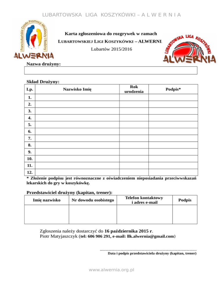 LUBARTOWSKA LIGA KOSZYKÓWKI – A L W E R N I A Karta zgłoszeniowa do rozgrywek w ramach LUBARTOWSKIEJ LIGI KOSZYKÓWKI – ALWERNIA Lubartów 2015/2016 Nazwa drużyny: Skład Drużyny: Lp. Rok urodzenia Nazwisko Imię Podpis* 1. 2. 3. 4. 5. 6. 7. 8. 9. 10. 11. 12. * Złożenie podpisu jest równoznaczne z oświadczeniem nieposiadania przeciwwskazań lekarskich do gry w koszykówkę. Przedstawiciel drużyny (kapitan, trener): Imię nazwisko Nr dowodu osobistego Telefon kontaktowy i adres e-mail Podpis Zgłoszenia należy dostarczyć do 16 października 2015 r. Piotr Matyjaszczyk (tel: 606 906 291, e-mail: [email protected]) ……………………………………………………………………………………. Data i podpis przedstawiciela drużyny (kapitan, trener) www.alwernia.org.pl