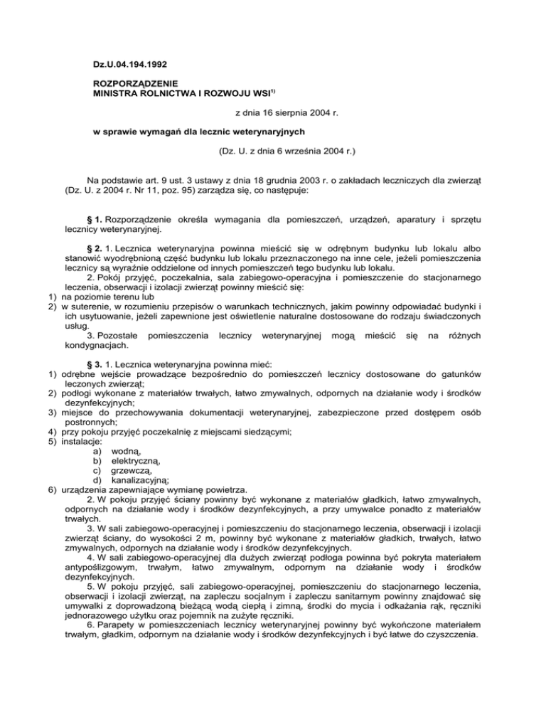 Dz.U.04.194.1992 ROZPORZĄDZENIE MINISTRA ROLNICTWA I ROZWOJU WSI1) z dnia 16 sierpnia 2004 r. w sprawie wymagań dla lecznic weterynaryjnych (Dz. U. z dnia 6 września 2004 r.) Na podstawie art. 9 ust. 3 ustawy z dnia 18 grudnia 2003 r. o zakładach leczniczych dla zwierząt (Dz. U. z 2004 r. Nr 11, poz. 95) zarządza się, co następuje: § 1. Rozporządzenie określa wymagania dla pomieszczeń, urządzeń, aparatury i sprzętu lecznicy weterynaryjnej. § 2. 1. Lecznica weterynaryjna powinna mieścić się w odrębnym budynku lub lokalu albo stanowić wyodrębnioną część budynku lub lokalu przeznaczonego na inne cele, jeżeli pomieszczenia lecznicy są wyraźnie oddzielone od innych pomieszczeń tego budynku lub lokalu. 2. Pokój przyjęć, poczekalnia, sala zabiegowo-operacyjna i pomieszczenie do stacjonarnego leczenia, obserwacji i izolacji zwierząt powinny mieścić się: 1) na poziomie terenu lub 2) w suterenie, w rozumieniu przepisów o warunkach technicznych, jakim powinny odpowiadać budynki i ich usytuowanie, jeżeli zapewnione jest oświetlenie naturalne dostosowane do rodzaju świadczonych usług. 3. Pozostałe pomieszczenia lecznicy weterynaryjnej mogą mieścić się na różnych kondygnacjach. § 3. 1. Lecznica weterynaryjna powinna mieć: 1) odrębne wejście prowadzące bezpośrednio do pomieszczeń lecznicy dostosowane do gatunków leczonych zwierząt; 2) podłogi wykonane z materiałów trwałych, łatwo zmywalnych, odpornych na działanie wody i środków dezynfekcyjnych; 3) miejsce do przechowywania dokumentacji weterynaryjnej, zabezpieczone przed dostępem osób postronnych; 4) przy pokoju przyjęć poczekalnię z miejscami siedzącymi; 5) instalacje: a) wodną, b) elektryczną, c) grzewczą, d) kanalizacyjną; 6) urządzenia zapewniające wymianę powietrza. 2. W pokoju przyjęć ściany powinny być wykonane z materiałów gładkich, łatwo zmywalnych, odpornych na działanie wody i środków dezynfekcyjnych, a przy umywalce ponadto z materiałów trwałych. 3. W sali zabiegowo-operacyjnej i pomieszczeniu do stacjonarnego leczenia, obserwacji i izolacji zwierząt ściany, do wysokości 2 m, powinny być wykonane z materiałów gładkich, trwałych, łatwo zmywalnych, odpornych na działanie wody i środków dezynfekcyjnych. 4. W sali zabiegowo-operacyjnej dla dużych zwierząt podłoga powinna być pokryta materiałem antypoślizgowym, trwałym, łatwo zmywalnym, odpornym na działanie wody i środków dezynfekcyjnych. 5. W pokoju przyjęć, sali zabiegowo-operacyjnej, pomieszczeniu do stacjonarnego leczenia, obserwacji i izolacji zwierząt, na zapleczu socjalnym i zapleczu sanitarnym powinny znajdować się umywalki z doprowadzoną bieżącą wodą ciepłą i zimną, środki do mycia i odkażania rąk, ręczniki jednorazowego użytku oraz pojemnik na zużyte ręczniki. 6. Parapety w pomieszczeniach lecznicy weterynaryjnej powinny być wykończone materiałem trwałym, gładkim, odpornym na działanie wody i środków dezynfekcyjnych i być łatwe do czyszczenia. 7. Grzejniki w pomieszczeniach lecznicy weterynaryjnej powinny być gładkie i łatwe do czyszczenia. 8. W pokoju przyjęć, sali zabiegowo-operacyjnej, poczekalni, pomieszczeniu do stacjonarnego leczenia, obserwacji i izolacji zwierząt okna powinny być otwierane lub uchylne, chyba że w pomieszczeniach tych jest zainstalowana klimatyzacja. 1) 2) 3) 4) 5) 6) 7) 8) 9) § 4. Powierzchnia i wysokość pomieszczeń lecznicy weterynaryjnej powinna wynosić co najmniej: 8 m2 i 2,2 m - w przypadku pokoju przyjęć; 6 m2 i 2,2 m - w przypadku poczekalni; 8 m2 i 2,2 m - w przypadku pomieszczenia do stacjonarnego leczenia, obserwacji i izolacji małych zwierząt; 15 m2 i 2,5 m - w przypadku pomieszczenia do stacjonarnego leczenia, obserwacji i izolacji dużych zwierząt; 10 m2 i 2,2 m - w przypadku sali zabiegowo-operacyjnej dla małych zwierząt; 28 m2 i 2,5 m - w przypadku sali zabiegowo-operacyjnej dla dużych zwierząt; 3 m2 i 2,2 m - w przypadku zaplecza sanitarnego; 6 m2 i 2,2 m - w przypadku zaplecza socjalnego; 2 m2 i 2,2 m - w przypadku magazynu do przechowywania środków i sprzętu dezynfekcyjnego. § 5. Lecznicę weterynaryjną wyposaża się w: 1) sprzęt i urządzenia do przechowywania produktów leczniczych, artykułów sanitarnych, sprzętu jednorazowego użytku i innych produktów medycznych zgodnie z wymaganiami określonymi przez producenta lub wynikającymi z ich właściwości; 2) pojemniki na odpady, w tym na odpady weterynaryjne. § 6. 1. Pokój przyjęć wyposaża się w: 1) stół zabiegowy dostosowany wielkością do zakresu i rodzaju świadczonych usług weterynaryjnych, wykonany z materiału trwałego, łatwo zmywalnego i odpornego na działanie środków dezynfekcyjnych; 2) lampę bakteriobójczą; 3) stetoskop. 2. Urządzenia i sprzęt znajdujące się w pokoju przyjęć powinny być wykonane z materiałów trwałych, łatwo zmywalnych i odpornych na działanie środków dezynfekcyjnych. § 7. Salę zabiegowo-operacyjną wyposaża się w: 1) sprzęt umożliwiający podawanie tlenu o pojemności co najmniej 250 litrów; 2) zestaw do intubacji dotchawiczej z rurkami intubacyjnymi i laryngoskopem dostosowany do zakresu świadczonych usług weterynaryjnych; 3) worek samorozprężny; 4) sprzęt do dożylnego podawania leków; 5) stetoskop; 6) źródło światła bezcieniowego; 7) armaturę bezdotykową; 8) autoklaw lub sterylizator na suche powietrze; 9) stół operacyjny dostosowany wielkością do zakresu i rodzaju świadczonych usług weterynaryjnych, wykonany z materiału trwałego, łatwo zmywalnego i odpornego na działanie środków dezynfekcyjnych; 10) pojemnik na odpady medyczne; 11) lampę bakteriobójczą; 12) wentylację mechaniczną; 13) poskrom dla zwierząt w przypadku świadczenia usług weterynaryjnych dla dużych zwierząt. § 8. Pomieszczenie do stacjonarnego leczenia, obserwacji i izolacji zwierząt wyposaża się w: 1) wentylację mechaniczną; 2) klatki do stacj