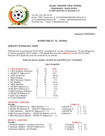 ŚLĄSKI ZWIĄZEK PIŁKI NOŻNEJ PODOKRĘG SOSNOWIEC 41-200 Sosnowiec ul. Rzeżnicza 12 Tel./fax 032 266-58-45 Konto : PKO Sosnowiec nr 19 10202498 0000 8402 0018 4671 www.podokregsosnowiec.pl : e-mail : [email protected] Wydział Gier – e-mail: [email protected] Sosnowiec 29.09.2016 r. KOMUNIKAT Nr 29/2016 SPRAWY WYDZIAŁU GIER Wydział Gier na posiedzeniu 29.09.2016r zweryfikował zawody o Mistrzostwo IV Ligi Okręgowej A1 Junior pomiędzy CKS Czeladż – LKS Zgoda Byczyna jako walkower 3:0 dla CKS Czeladż. Drużyna LKS Zgoda Byczyna nie wstawiła się na zawody. Zaliczone mecze, punkty i bramki do Ligi Żaków po 7 Turniejach LIGA ŻAKÓW 1. UKS Jedynka Łazy 2. UKS Academy Zawiercie 3. MUKP IV Dąbrowa G. 4. ZEW Sosnowiec 5. RKS Grodziec 6. BKS Sarmacja I Będzin 7. KS Mydlice 8. MKS Sławków 9. MUKP I Dabrowa G. 10.MUKP II Dabrowa G. 11.BKS Sarmacja II Będzin 12.MUKP III Dabrowa G. 13.LKS Tęcza Błędów 14.Cyklon Rogożnik 7 21 39:6 10 16 11:11 8 14 18:7 7 12 20:10 7 12 16:17 4 10 7:3 9 10 10:14 9 10 6:10 10 9 5:11 7 7 7:21 2 4 3:1 5 2 2:7 5 1 0:24 ------------------------------- MUKP III : 24.09.2016 Wyniki: 1. MUKP III Dabrowa G. - MKS Sławków 1:1 2. MUKP III Dabrowa G. - MUKP IV Dąbrowa G. 1:1 3. MKS Sławków - MUKP IV Dąbrowa G. 1:3 4.BKS Sarmacja II Będzin - MUKP III Dabrowa G.3:0 5. BKS Sarmacja II Będzin - MUKP IV Dąbrowa G 1:1 MUKP I : 24.09.2016 Wyniki : 1.Sarmacja I Będzin - Academy Zawiercie 2 Sarmacja I Będzin - MUKP I Dabrowa G. 3.Sarmacja I Będzin - KS Mydlice 1:0 3:1 1:1 TABELA: 1.MUKP IV 3 5 5:3 2.Sarmacja II 2 4 3:1 3.MUKP III 3 2 2:5 4.Sławków 2 1 2:4 TABELA: 1.Sarmacja 3 7 5:2 2.Academy 3 4 3:2 3. Mydlice 3 4 3: 4 4. KS Mydlice - MUKP I Dabrowa G 1:0 5. KS Mydlice - Academy Zawiercie 1:3 6. Academy Zawiercie - MUKP I Dabrowa G 0:0 4.MUKP I 3 1 1:4 GRODZIEC: 25.09.2016 Wyniki : 1.RKS Grodziec –MUKP II Dąbrowa G. 7:1 2.LKS Tęcz Błędów - ZEW Sosnowiec 0:6 3.UKS Jedynka Łazy - RKS Grodziec 7:0 4. ZEW Sosnowiec -MUKP II Dąbrowa G. 4:2 5. LKS Tęcz Błędów- RKS Grodziec 0:3 6. MUKP II Dąbrowa G.- UKS Jedynka Łazy 0:7 7. MUKP II Dąbrowa G.- LKS Tęcz Błędów 0:0 8. RKS Grodziec - ZEW Sosnowiec 0:4 9. UKS Jedynka Łazy - LKS Tęcz Błędów 7:0 10.UKS Jedynka Łazy - ZEW Sosnowiec 3:1 TABELA: 1. Łazy 4 12 24:1 2. ZEW 4 9 15:5 3. Grodziec 4 6 11:15 4. MUKP II 4 1 3:18 5. Błędów 4 1 0:16 UKS Football Academy informuję że turniej ligi żaków, którego jesteśmy organizatorem w dniu 1 października odbędzie się na Boisku Orlik przy SP 6 w Zawierciu ul. Wierzbowa 4 . Początek godzina 10:00 PUCHAR POLSKI Zarząd JSP Szczakowianka, informuje iż mecz III Rundy Pucharu Polski w dniu 12.10.2016r o godz. 15:30 pomiędzy JSP Szczakowianka a KS Przemsza Siewierz zostanie rozegrany na Stadionie w Jaworznie – Szczakowej ul. Kościuszki 1 PATRICK B KLASA KS Góra Siewierska informuje za zgodą drużyny KS Strażak Nowa Wieś o przełożeniu terminu meczu o mistrzostwo B Klasy pomiędzy KS Góra Siewierska - KS Strażak Nowa Wieś z dnia 09.10.2016 na dzień 08.10.2016 godzina 15.30 UKS Zagłębiak Tucznawa informuje o zmianie terminu meczu z KKS Łazowianka II Łazy z dnia 9.10.2016 r., godz. 15.30 na dzień 8.10.2016 r., godz. 11.00. Grupy Młodzieżowe Informujemy, że mecze IV ligi okręgowej C2 KP Warta Zawiercie jako gospodarz będzie rozgrywać na sztucznym boisku przy ulicy Moniuszki 10 w Zawierciu przy sztucznym oświetleniu w następujących terminach: - piątek 7 październik 2016 roku godz.17.00 Warta – Unia Ząbkowice - piątek 14 października 2016 roku godz.17.00 Warta – MKS Sławków - piątek 28 października 2016 roku godz. 17.00 Warta – Niwka Sosnowiec W nawiązaniu do pisma z 4.09.2016 odnośnie rozgrywanych meczy u siebie Uczniowski Klub Sportowy Akademia 2012 Jaworzno informuje, że z powodu błędu zawody piłki nożnej o mistrzostwo V ligi orlików E1, rundy jesiennej sezonu 2016/2017, których jest gospodarzem w kolejce 9 będą rozgrywane na boisku Orlik przy ul. Ławczanej 12 w Jaworznie (SP 7) w następującym terminie. Rozgrywki Runda Kolejka Data Spotkania Godzina Gospodarz Sosnowiec: V liga okręgowa E1 Orlik Jesienna 9 2016-10-08 9:00 UKS AKADEMIA 2012 Goście MUKP DĄBROWA GÓRNICZ Zarząd KS GÓRNIK w Jaworznie, informuje, że na prośbę drużyny KS Górnik Sosnowiec zawody piłki nożnej VI LIGA OKRĘGOWA E1 GRUPA A zmienia termin z 29.09.2016 na 28.09.2016 na godz. 18.15 Mecz zostanie rozegrany na ORLIKU przy ul. Ławczana 7 w Jaworznie. Zarząd KS GÓRNIK w Jaworznie, informuje o zmianie terminu rozegrania zawodów IV LIGA OKRĘGOWA JUNIORÓW B1 kol . 11 pomiędzy LKS SKALNIAK KROCZYCE a KS GÓRNIK w JAWORZNIE z dnia 23.10.2016 r. na 19.10.2016 (środa) na godz.16.30. Drużyna przeciwna wyraziła zgodę. Zarząd KS GÓRNIK w Jaworznie, informuje, że zawody piłki nożnej o mistrzostwo VI LIGA OKRĘGOWA E1 GRUPA A rundy jesiennej sezonu 2016/2017, którego jest gospodarzem rozegrany zostanie na ORLIKU przy ul. Ławczana 7 w Jaworznie:Kol.5 15.10.2016 godz. 10.30 pomiędzy KS GÓRNIK w Jaworznie a MUKP Dąbrowa Górnicza. LKS Tęcza Błędów informuje o zmianie godziny meczy IV Ligi OkręgowejE2 Orlik r.A : 1.Tęcza błędów – Silesja Jaworzno 6 kolejka 09.10.2016r godz. 15:00 2. Tęcza Błędów – MUKP II Dąbrowa G. 8 kolejka 23.10.2016r godz. 15:00 Czarni Sosnowiec za zgodą drużyny przeciwnej zmieniamy godzinę rozegrania meczu IV Ligii Okręgowej Orlik E2 gr. 2 pomiędzy KKS Czarni a Warta Zawiercie dnia 01.10.2016 na godz. 12:30. Czarni Sosnowiec zmiana godzinę rozegrania meczu IV Ligii Okręgowej Orlik E1 r. 2006 pomiędzy KKS Czarni a Orbitą Bukowno. Data: 28.09.2016. Nowa godzina: 19:00. BKS Sarmacja za zgodą przeciwnika zmienia termin rozegrania meczu V Liga Okręgowa E1 pomiędzy drużynami: BKS Sarmacja - KS Mydlice z dnia 15.10.2016. godz.11.00. na dzień 19.10.2016. godz. 16.00. Salos Dąbrowa Górnicza informuje, że najbliższe spotkania jako gospodarz w 4 lidze juniora m