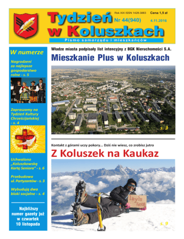 W numerze Nagrodzeni za najlepsze gospodarstwo rolne - s. 5 Rok XIX ISSN 1428-3883 Cena 1,5 zł Nr 44(940) 4.11.2016 Władze miasta podpisały list intencyjny z BGK Nieruchomości S.A. Mieszkanie Plus w Koluszkach Zapraszamy na Tydzień Kultury Chrześcijańskiej - s. 4 s. 3 Kontakt z górami uczy pokory... Dziś nie wiesz, co zrobisz jutro Uchwalono „Koluszkowską Kartę Seniora” - s. 6 Z Koluszek na Kaukaz Przebudowa ul. Partyzantów - s. 3 Wybudują dwa bloki socjalne - s. 4 Najbliższy numer gazety już w czwartek 10 listopada s. 9 2 Tydzień w Koluszkach nr 44 Policja – 997, 44 714 69 77 Straż Pożarna – 998, 44 714 08 90 OSP Koluszki – 44 714 58 27 Pogotowie Ratunkowe – 999 URZĄD MIEJSKI Sekretariat – 44 725 67 00 Redakcja TwK – 44 725 67 18 USC – 44 725 67 60 Biblioteka Miejska – 44 714 58 38 MOK, Kino Odeon – 44 714 58 80 Wykaz opłat w 2016 roku Opłata za podatek od nieruchomości, rolny, leśny: - do 15 marca - I rata - do 15 maja - II rata - do 15 września - III rata - do 15 listopada - IV rata Opłata za podatek od środków transportowych: - do 15 lutego – I rata - do 15 września - II rata BIURO INŻYNIERA GMINY – 44 725 67 68 KPGK sp. z o.o. – 44 714 58 45 ZUK – 44 714 04 95 MGOPS – 44 714 58 25 Pogot. Energetyczne – 991 – 468-30-15-31 Pog. Kanalizacyjne – 44 714 58 79 507 078 873 Pogotowie Gazowe – 992 Ujęcie wody i pog. wod. – 44 714 58 24 605 370 020 Oczyszcz. ścieków – 44 714 58 79 507 078 873 Opłata za posiadanie zezwoleń na sprzedaż alkoholu: SŁUŻBA ZDROWIA NZOZ Zdrowie – 44 714 08 00 NZOZ Eskulap – 44 714 50 00 NZOZ Med-Kol (POZ) – 44 714 22 22 – 44 714 67 57 Med-Kol (poradnie specj.) – 44 714 55 00 Laboratorium Analityk – 44 714 57 57 Poradnia Stomatologiczno-Protetyczna ul. Staszica 34 – 44 714 44 98 Punkt Selektywnej Zbiórki Odpadów Komunalnych Apteki: ul. Żwirki 2 ul. Sikorskiego 6 ul. Głowackiego 20 ul. Korczaka 5 ul. 11 Listopada 33 ul. Przejazd 6 ul. 3 Maja 8 ul. 3 Maja 19G ul. Brzezińska 54 Gałków – 44 714 16 01 – 44 714 16 43 – 44 714 02 86 – 44 714 24 58 – 44 714 03 63 – 44 714 24 44 – 44 714 07 88 – 44 714 02 73 – 44 714 00 77 – 605 509 502 Taxi Biuro numerów Informacja PKP KSM Spółdz. Odlewnik Urząd Pracy – 44 714 58 42 – 118 913 – 19 757 – 44 714 10 41 – 44 714 19 98 – 44 714 13 54 Ośrodek Psychoedukacji i Psychoterapii ul. Staszica 34 – 44 714 67 67 wt. 13.00-20.00, czw. 15.00-19.30, pt. 14.00 – 20.00, sob. 8.30-11.00 Abstynenckie Stowarzyszenie Klub Wzajemnej Pomocy „Ostoja”, ul. Staszica 34 44 714-23-40 (pn-pt 17.00-20.00) Punkt Konsultacyjny Pomocy Rodzinie ul. Staszica 34 – 44 714-58-69 (pn.: 17.15-20.00 i śr. 17.15-20.30) Grupa AA „Iskierka”, Koluszki ul. Mickiewicza 40, 501 648 560 - do 30 września – III rata Opłata za wywóz odpadów komunalnych: - do 10 marca – I rata - do 10 maja - II rata - do 10 lipca - III rata - do 10 września - IV rata - do 10 listopada - V rata 4.11.2016 r. Działania Straży Pożarnej W dniu 26.10. roku straż pożarna została zadysponowana do wypadku drogowego w Gałkowie Małym na ul. Brzezińskiej. W zdarzeniu uczestniczyły dwa samochody osobowe. W działaniach udział brały dwa zastępy ratownicze z JRG Koluszki oraz jeden z OSP Gałków Duży. Działania straży pożarnej polegały na zabezpieczeniu miejsca zdarzenia, udzieleniu kwalifikowanej pierwszej pomocy osobie poszkodowanej, odłączeniu zasilania akumulatorowego w uszkodzonych pojazdach, oświetleniu terenu akcji, sorpcji płynów eksploatacyjnych z jezdni, przemieszczeniu samochodów na pobocze drogi oraz uprzątnięciu z jezdni szkła i drobnych elementów karoserii. Kasa Urzędu przy ulicy Reymonta w Koluszkach jest czynny w dniach: • wtorek w godz. 12.00 – 17.00 • czwartek w godz. 7.00 – 12.00 • sobota w godz. 10.00 – 15.00 Biuro Inżyniera Gminy przyjmuje zgłoszenia dotyczące: awarii sieci infrastruktury miejskiej (wodociągi, kanalizacja, ciepłownictwo, energetyka, gazociągi); l zimowego odśnieżania dróg; l uszkodzeń dróg i infrastruktury drogowej (znaki, przepusty); l uszkodzonych studzienek kanalizacyjnych; l nielegalnie prowadzonych robót w pasie drogowym; l uszkodzonych latarni oświetlenia ulicznego; l czystości w mieście i gminie; l przepełnień pojemników na odpady; l przepełnionych ulicznych koszy na śmieci; l zniszczeń i nieporządku wokół pojemników do selektywnej zbiórki odpadów; l zaśmiecenia terenów; l dzikich wysypisk śmieci; l padłych zwierząt; l inne związane z bieżącą obsługą mieszkań-ców w zakresie gospodarki komunalnej. l 44 725 67 68 telefon czynny 24h KOLUSZKI ZAWSZE W CENTRUM poniedziałek, środa, czwartek – 8.15-14.10 wtorek – 8.15-15.10 piątek – 8.15-13.10 przerwa w godzinach: 10.30-10.40 i 12.30-12.50 04.11. ul. 11 Listopada 33 05.11. ul. Żwirki 2 06.11. ul. Głowackiego 20 07.11. ul. 3 Maja 8 08.11. ul. Korczaka 5 09.11. ul. 3 Maja 8 10.11. ul. 3 Maja 19 G 4.11.2016 r. Władze miasta podpisały list intencyjny z BGK Nieruchomości S.A. ceptowanej do dalszej analizy pod kątem możliwości realizacji inwestycji przez BGK Nieruchomości S.A. – spółkę zależną Banku Gospodarstwa Krajowego, odpowiedzialną za operacyjne przygotowanie i pilotażową realizację programu Mieszkanie Plus. – Cieszę się, że w krótkim czasie od podpisania pierwszych Skarbu Państwa. Jesteśmy w stałym kontakcie z kolejnymi podmiotami, zainteresowanymi współpracą w celu realizacji projektów inwestycyjnych obejmujących budownictwo mieszkaniowe. To intensywne rozmowy, które wkrótce powinny zaowocować dalszymi porozumieniami. Liczę, że stale rosnąca skala pilotażowych inwestycji będzie stanowić dla wszystkich zachętę do współpracy w ramach programu Mieszkanie Plus – przekonywał Włodzimierz Stasiak, wiceprezes BGK Nieruchomości S.A. Na wskazanej przez miasto porozumień, do programu Mieszkanie Plus przystępują Koluszki. Łączni