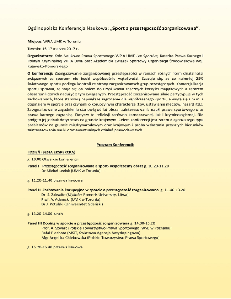 Ogólnopolska Konferencja Naukowa: „Sport a przestępczość zorganizowana”. Miejsce: WPiA UMK w Toruniu Termin: 16-17 marzec 2017 r. Organizatorzy: Koło Naukowe Prawa Sportowego WPiA UMK Lex Sportiva, Katedra Prawa Karnego i Polityki Kryminalnej WPiA UMK oraz Akademicki Związek Sportowy Organizacja Środowiskowa woj. Kujawsko-Pomorskiego O konferencji: Zaangażowanie zorganizowanej przestępczości w ramach różnych form działalności związanych ze sportem nie budzi współcześnie wątpliwości. Szacuje się, ze co najmniej 25% światowego sportu podlega kontroli ze strony zorganizowanych grup przestępczych. Komercjalizacja sportu sprawia, że staje się on polem do uzyskiwania znacznych korzyści majątkowych a zarazem obszarem licznych nadużyć z tym związanych. Przestępczość zorganizowana silnie partycypuje w tych zachowaniach, które stanowią największe zagrożenie dla współczesnego sportu, a wiążą się z m.in. z dopingiem w sporcie oraz czynami o korupcyjnym charakterze (tzw. ustawianie meczów, hazard itd.). Zasygnalizowane zagadnienia stanowią od lat obszar zainteresowania nauki prawa sportowego oraz prawa karnego zagranicą. Dotyczy to refleksji zarówno karnoprawnej, jak i kryminologicznej. Nie podjęto jej jednak dotychczas na gruncie krajowym. Celem konferencji jest zatem diagnoza tego typu problemów na gruncie międzynarodowym oraz krajowym i próba wskazania przyszłych kierunków zainteresowania nauki oraz ewentualnych działań prawodawczych. Program Konferencji: I DZIEŃ (SESJA EKSPERCKA) g. 10.00 Otwarcie konferencji Panel I Przestępczość zorganizowana a sport- współczesny obraz g. 10.20-11.20 Dr Michał Leciak (UMK w Toruniu) g. 11.20-11.40 przerwa kawowa Panel II Zachowania korupcyjne w sporcie a przestępczość zorganizowana g. 11.40-13.20 Dr S. Zaksaite (Mykolas Romeris University, Litwa) Prof. A. Adamski (UMK w Toruniu) Dr J. Potulski (Uniwersytet Gdański) g. 13.20-14.00 lunch Panel III Doping w sporcie a przestępczość zorganizowana g. 14.00-15.20 Prof. A. Szwarc (Polskie Towarzystwo Prawa Sportowego, WSB w Poznaniu) Rafał Piechota (MSiT, Światowa Agencja Antydopingowa) Mgr Angelika Chlebowska (Polskie Towarzystwo Prawa Sportowego) g. 15.20-15.40 przerwa kawowa Panel IV Wybrane obszary zainteresowania zorganizowanej przestępczości (Sport a zorganizowane grupy kibiców; Sport a przestępstwa gospodarcze, podatkowe, przeciwko własności intelektualnej; Sport a handel ludźmi itd.) g. 15.40-17.50 Dr N. Daśko (UMK w Toruniu) Prof. P. Chlebowicz (UWM w Olsztynie) Prof. M. Balcerzak (UMK w Toruniu) Prof. D. Antonowicz (UMK w Toruniu) Mgr H. Radke (UMK w Toruniu) g. 17.50 Zamknięcie SESJI EKSPERCKIEJ II DZIEŃ (SESJA STUDENCKO-DOKTORANCKA) g. 10.00 Otwarcie SESJI Panel I Zachowania korupcyjne w sporcie a przestępczość zorganizowana Panel II Doping w sporcie a przestępczość zorganizowana Panel III Wybrane obszary zainteresowania zorganizowanej przestępczości g. 18.00 Zamknięcie SESJI