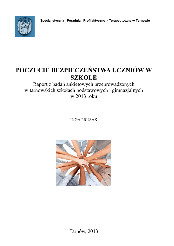 Specjalistyczna Poradnia Profilaktyczno - Terapeutyczna w Tarnowie POCZUCIE BEZPIECZEŃSTWA UCZNIÓW W SZKOLE Raport z badań ankietowych przeprowadzonych w tarnowskich szkołach podstawowych i gimnazjalnych w 2013 roku INGA PRUSAK Tarnów, 2013 Poczucie bezpieczeństwa uczniów w szkole 1. Wprowadzenie Badania przeprowadzane w tarnowskich szkołach to element działań systemowych w Tarnowie w zakresie przeciwdziałania zagrożeniom społecznym dzieci i młodzieży. Coroczna diagnoza środowiska uczniowskiego jest unikatowym źródłem informacji na temat niebezpieczeństw, które czyhają na dzieci i młodzież w środowisku szkolnym i nie tylko. Temat tegorocznego badania środowiska jest połączony z priorytetem wybranym przez Ministerstwo Edukacji Narodowej na obecny rok szkolny. Rok bezpiecznej szkoły ma na celu pobudzenie uczniów, nauczycieli, rodziców - do podejmowania aktywności w zakresie szeroko pojętej problematyki bezpieczeństwa, a także przeciwdziałania negatywnym aspektom zachowania, budowaniu wzajemnych relacji, kształtowaniu właściwych postaw, poszerzaniu kompetencji społecznych i odpowiedzialności. 1. 1. Pojęcia Bezpieczeństwo to stan, który daje poczucie pewności istnienia, gwarantuje ciągłość oraz daje motywację i szansę na rozwój. Jest to jedna z podstawowych potrzeb człowieka. Odznacza się brakiem ryzyka utraty czegoś dla podmiotu szczególnie cennego – życia, zdrowia, pracy, szacunku, uczuć, dóbr materialnych i dóbr niematerialnych. Bezpieczeństwo jest naczelną potrzebą człowieka i grup społecznych, jest także podstawową potrzebą państw i systemów międzynarodowych. Brak bezpieczeństwa generuje silny niepokój i poczucie zagrożenia.1 Poczucie bezpieczeństwa zgodnie z teorią piramidy potrzeb Maslowa, jest pojęciem węższym aniżeli bezpieczeństwo. Poczucia bezpieczeństwa to subiektywne odczucie człowieka o realizacji jego potrzeby bezpieczeństwa. Poczucie bezpieczeństwa wewnętrznego, rzutuje na funkcjonowanie człowieka, kreowanie szczęśliwych relacji, ta także osiąganie sukcesów i trwałych osiągnięć. Jest niezbędne do czy prowadzenie udanego życia.2 Agresja to każde zamierzone działanie – w formie otwartej lub symbolicznej, mające na celu wyrządzenie komuś lub czemuś szkody, straty lub bólu.3 Rozróżniamy różne jej rodzaje: 1 A. Włodarek, Problemy międzypokoleniowe a poczucie bezpieczeństwa, [w:] Edukacja dla bezpieczeństwa bezpieczna szkoła, bezpieczny uczeń, pod red. D. Czajkowska-Ziobrowska, A. Zduniak, Poznań 2007, s. 97-98. 2 I. Korcz, Inteligencja emocjonalna – gwarantem bezpieczeństwa i determinantą rozwoju uczniów, [w:] Edukacja dla bezpieczeństwa - bezpieczna szkoła, bezpieczny uczeń, pod red. D. Czajkowska-Ziobrowska, A. Zduniak, Poznań 2007, s. 107-109 3 J. Ranschburg, Lęk, gniew, agresja, Warszawa, 1993, str. 93. 2 Poczucie bezpieczeństwa uczniów w szkole agresja słowna wulgaryzmy, straszenie, grożenie pobiciem, przezywanie, dokuczanie, ubliżanie, obmawianie, ośmieszanie, kłótnie, skarżenie, uszczypliwość lub kpiny, cieszenie się z niepowodzeń innych, pomówienia agresja fizyczna bicia, kopania, popychania, szarpanie inne zmuszanie do ośmieszających lub poniżających czynności; opluwanie; zabieranie, chowanie, przeszukiwanie rzeczy; zamieszczanie obraźliwych treści na portalach społecznościowych; prowokowanie krzykiem lub robieniem „min”; obraźliwe wypowiedzi na temat członków rodziny Przemoc jest zachowaniem agresywnym, które cechuje także: istnienie nierównowag sił pomiędzy ofiarą a sprawcą, cykliczność i długotrwały charakter tych działań, a także występowanie „sztywnych” ról – sprawcy, ofiary i świadka (w odróżnieniu od agresji osoby te nie „zamieniają się rolami). 2. Badanie 2.1. Cel badania Cel główny: Odpowiedź na pytanie jaki jest obecnie poziom poczucia bezpieczeństwa wśród uczniów w tarnowskich szkołach. Zgodnie z dzisiejszą wiedzą psychologiczną i pedagogiczną na poczucie bezpieczeństwa bądź jego brak wpływają nie tylko bezpośrednie doznania fizyczne i psychiczne człowieka. Istotnym zagrożeniem dla bezpieczeństwa może być również wystąpienie w roli świadka aktów przemocy, świadomość osamotnienia w problemie, czy niemożność uzyskania pomocy. Z psychologicznego punktu widzenia na poczucie bezpieczeństwa duży wpływ ma poziom zaspokojenia potrzeb z różnych obszarów życia człowieka. W związku z wymienionymi aspektami tematu, analiza wyników badań dotyczyć będzie również następujących problemów szczegółowych, wyłonionych z problemu zasadniczego: 1. Jak często uczniowie stają się świadkami przemocy wobec kolegów i koleżanek? 2. Kto lub co wzbudza największy lęk wśród uczniów? 3. Kiedy i gdzie uczniowie odczuwają największe zagrożenie? 4. Z czyjej pomocy uczniowie korzystają w sytuacji zagrożenia? 3 Poczucie bezpieczeństwa uczniów w szkole Sprawdzeniu poddane zostaną również następujące hipotezy szczegółowe opierające się na wstępnym założeniu hipotezy głównej oraz na dostępnych wynikach badań ogólnokrajowych: 1. Mniema się, że uczniowie często stają się świadkami przemocy wobec kolegów i koleżanek. 2. Większy lęk wśród uczniów wydają się wzbudzać rówieśnicy aniżeli nauczyciele. 3. Przypuszcza się, że uczniowie odczuwają największe zagrożenie w toaletach szkolnych. 4. Domniemywa się, że uczniowie mówią rodzicom, że byli świadkami lub ofiarami agresji. 2.2. Metody Narzędziem wykorzystanym do badania była ankieta audytoryjna składająca się z 17 pytań zamkniętych i otwartych, z możliwością wyboru jednej lub kilku odpowiedzi (niektóre pytania były w formie tabeli, gdzie respondenci mieli możliwość zaznaczenia odpowiedzi przy każdym zdaniu). Narzędzie zostało wybrane ze względu na wysoki stopień standaryzacji ankiety przy jednoczesnej możliwości uzyskania informacji