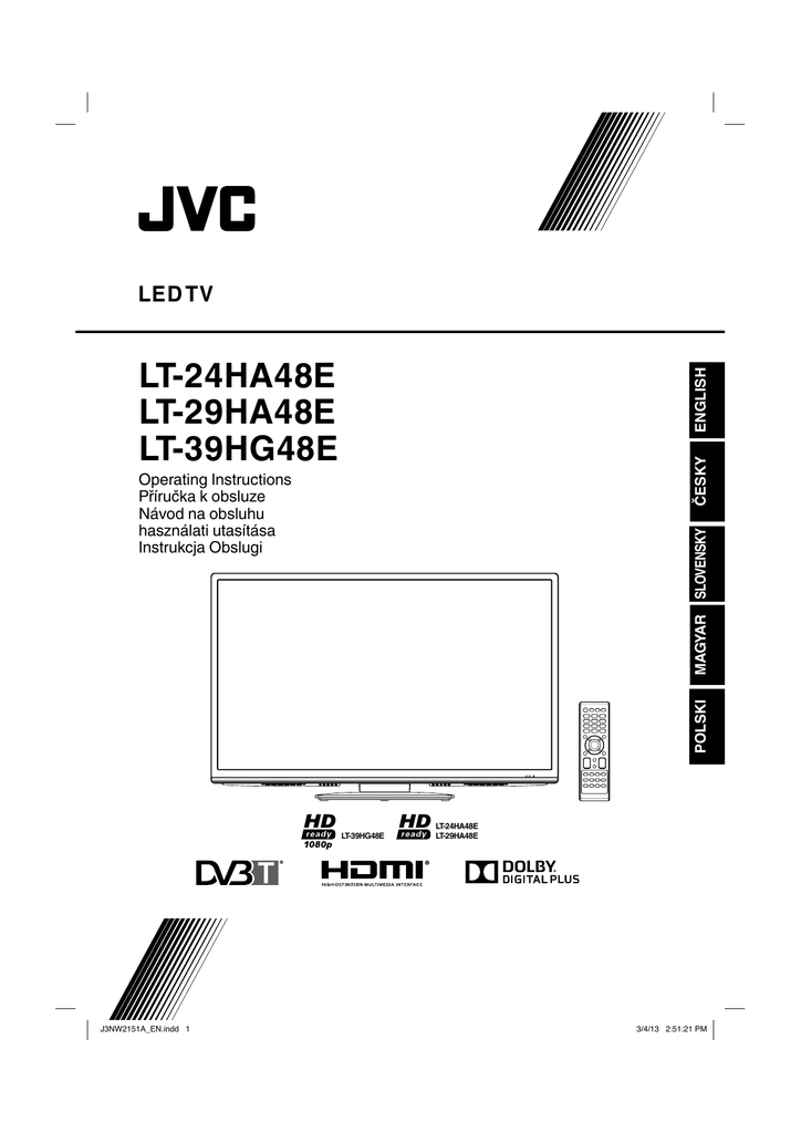 LED TV ČESKY ENGLISH LT-24HA48E LT-29HA48E LT-39HG48E POLSKI MAGYAR SLOVENSKY Operating Instructions Příručka k obsluze Návod na obsluhu használati utasítása Instrukcja Obslugi LT-39HG48E J3NW2151A_EN.indd 1 LT-24HA48E LT-29HA48E 3/4/13 2:51:21 PM Features • • • • • 16:9 LCD screen LED-Backlight-Technology DVB-T-HDTV-Tuner Electronic Progr. Guide (EPG) for DVB USB-Media player • • • • Auto Power Off PVR (Personal Video Recorder) Time Shift New Thin-frame design* Battery notice (valid in EU only) Look after our environment - contact your local authorities for advice on how to safely dispose of exhausted batteries. The crossed out wheelie bin symbol indicates that used batteries should not be disposed of with your normal household waste! A separate collection system for used batteries is in place to allow the correct treatment and recycling in accordance with current legislation. Please contact your local authority for details on collection and recycling schemes in your area. Information for the DVB-T function • Any function relative to the digital television (with the DVB logo) is available only within the country or area where such signals are transmitted. Verify with the salesman if it is possible to receive a DVB-T signal in the zone where you live. • Remove the CAM for DVB-T reception, if it has been inserted. • A DVB-T antenna must be connected for DVB-T reception. • Even if the television conforms to the DVB-T specifications, the compatibility to future digital DVB-T transmissions is not guaranteed. • Some digital television functions may not be available in some countries. • The DVB-T system present in this device is FTA (Free to air). Equipment connected to the protective earthing of the building installation through the mains connection or through other equipment with a connection to protective earthing – and to a cable distribution system using coaxial cable, may in some circumstances create a fire hazard. Connection to a cable distribution system has therefore to be provided through a device providing electrical isolation below a certain frequency range. Utstyr som er koplet til beskyttelsesjord via nettplugg og/eller via annet jordtilkoplet utstyr – og er tilkoplet et kabel-TV nett, kan forårsake brannfare. For å unngå dette skal det ved tilkopling av utstyret til kabel-TV nettet installeres en galvanisk isolator mellom utstyret og kabel-TV nettet. Utrustning som är kopplad till skyddsjord via jordat vägguttag och/eller via annan utrustning och samtidigt är kopplad till kabel-TV nät kan i vissa fall medföra risk för brand. För att undvika detta skall vid anslutning av utrustningen till kabel-TV nät galvanisk isolator finnas mellan utrustningen och kabel-TV nätet. Dear Customer, [European Union] This apparatus is in conformance with the valid European directives and standards regarding electromagnetic compatibility and electrical safety. European representative of the manufacturer is: ORION ELECTRIC (POLAND) SP.ZO.O. OSTASZEWO 57 87-148 LYSOMICE POLAND * The extra-slim frame allows more than a full view to the TV’s screen. Even the superblack screen’s rim (3mm approx.) is now visible. EN 2 J3NW2151A_EN.indd 2 3/4/13 2:51:24 PM Features................................................................ 2 Contents ............................................................... 3 Important safety information.................................. 4 Location of controls............................................... 7 Remote Control..................................................... 8 Antenna connection ............................................ 10 Auto setup........................................................... 11 Selecting the input source................................... 11 On-screen Language Selection .......................... 12 Station search ..................................................... 12 Manual Channel Scan......................................... 12 Channel Setup .................................................... 13 Auto Synchronization .......................................... 13 Power On/Off Timer ............................................ 13 Basic Operation .................................................. 14 Teletext ............................................................... 14 Stereo reception in analogue cable TV channel mode................................................ 15 Remarks on DVB-T system ................................. 16 Password Setup (Parental lock) .......................... 17 EPG (Electronic Programme Guide) ................... 17 Other convenience functions .............................. 18 Picture size and resolution .................................. 20 Picture format...................................................... 21 Information for recording function ....................... 22 Recording the TV programme ............................. 22 Watch the recorded programme ......................... 22 Preparing your USB device for playing Time Shift recordings .......................................... 22 Time Shift............................................................ 23 EPG Recording ................................................... 23 Media Operation ................................................. 24 Media Browser .................................................... 24 Playable File Types ............................................. 24 Playback files ...................................................... 25 Connecting an HDMI or a DVI device to the HDMI input ................................................ 26 Connection to other equipment ........................... 26 Troubleshooting table.......................................... 28 Specifications ..................................................... 29 License information............................................. 30 ENGLISH Contents 3 EN J3NW2151A_EN.indd 3 3/4/13 2:51:24 PM Important safety in