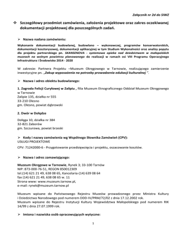 Załącznik nr 2d do SIWZ Szczegółowy przedmiot zamówienia, założenia projektowe oraz zakres oczekiwanej dokumentacji projektowej dla poszczególnych zadań. Nazwa nadana zamówieniu: Wykonanie dokumentacji budowlanej, budowlano – wykonawczej, programów konserwatorskich, dokumentacji kosztorysowej, dokumentacji aplikacyjnej w tym Studium Wykonalności oraz analizy popytu dla projektu partnerskiego pn. SKANSENOVA - systemowa opieka nad dziedzictwem w małopolskich muzeach na wolnym powietrzu planowanego do realizacji w ramach osi VIII Programu Operacyjnego Infrastruktura i Środowisko 2014 - 2020 W zakresie: Partnera Projektu –Muzeum Okręgowego w Tarnowie, realizującego zamierzenie inwestycyjne pn. „Zakup wyposażenia na potrzeby prowadzenia edukacji kulturalnej ”. Nazwa i adres obiektu budowlanego: 1. Zagroda Felicji Curyłowej w Zalipiu , filia Muzeum Etnograficznego Oddział Muzeum Okręgowego w Tarnowie Zalipie 135, działka nr 555 33-210 Olesno gm. Olesno, powiat dąbrowski 2. Dwór w Dołędze Dołęga 10, działka nr 384 32-821 Zaborów gm. Szczurowa, powiat brzeski Kody i nazwy zamówienia wg Wspólnego Słownika Zamówień (CPV): USŁUGI PROJEKTOWE CPV: 71242000-6 - Przygotowanie przedsięwzięcia i projektu, oszacowanie kosztów. Nazwa i adres zamawiającego: Muzeum Okręgowe w Tarnowie, Rynek 3; 33-100 Tarnów NIP: 873-000-76-51, REGON 850012309 tel.(14) 621 21 49, 638 08 65, Kancelaria-(14) 639 08 64 fax (14) 621 21 49, 638 08 65 w. 11 Strona www: www.muzeum.tarnow.pl, e-mail: [email protected] Muzeum wpisane do Państwowego Rejestru Muzeów prowadzonego przez Ministra Kultury i Dziedzictwa Narodowego pod numerem DDD-IV/PRM/72/02 z dnia 17.12.2002 rok. Muzeum wpisane do Rejestru Instytucji Kultury Województwa Małopolskiego pod numerem RIK 14/99 z dnia 27.07.1999 rok. Imiona i nazwiska osób opracowujących wytyczne: 1 Wojciech Kiecka – specjalista ds. inwestycji; tel. (14) 639 08 65 w. 51 1. Zagroda Felicji Curyłowej w Zalipiu, filia Muzeum Etnograficznego Oddział Muzeum Okręgowego w Tarnowie. Lp. 1. Nazwa Opis techniczny sprzęt komputerowy i oprogramowanie SPRZĘT laptop z oprogramowaniem systemowym oraz pakietem biurowym sprzęt/system nagłośnieniowy 2. sprzęt/system nagłośnieniowy 3. 4. sprzęt/system multimedialny 5. sprzęt/system multimedialny 6. wyposażenie przestrzeni edukacyjnej zestaw mikrofonów: 2 sztuki typ przetwornika : dynamiczne wykres kierunkowości: kardioidalna pasmo przenoszenia: 50 Hz - 15 kHz dwie dwudrożne aktywne kolumny frontowe, ośmiokanałowy (minimum) mikser lub powermikser , dwa przewody głośnikowe (minimalna długość jednego przewodu 4,5 m), max SPL: 124 dB, pasmo: 60 Hz-20 kHz, 10" przetwornik niskotonowy, moc ciągła - 300W, gniazdo do statywu, kąty pokrycia 100° poziom x 60° pion statywy do kolumn (dwie sztuki) monitor interaktywny 75" LED + nakładka dotykowa projektor multimedialny , rodzaj matrycy: LED full HD/ HD Ready: tak / tak żywotność lampy (normal): min. 30000 h żywotność lampy (econo): min. 30000 h współczynnik kontrastu 100000:1 rozdzielczość bazowa: HD 1080p (1920 x 1080) rozdzielczość maksymalna: HD 1080p (1920 x 1080) jasność: 1000 ANSI lumen format obrazu standardowy/skompresowany: 16:9 / 4:3 zoom optyczny/cyfrowy: tak/tak wielkość obrazu: 20 cali - 120 cali scena modułowa wymiar 100 cm x 200 cm 12 modułów 2 Liczba sztuk 1 2 2 1 1 12 2. Dwór w Dołędze Oddział Muzeum Okręgowego w Tarnowie Lp. Nazwa Opis techniczny 1. sprzęt komputerowy i oprogramowanie SPRZĘT laptop z oprogramowaniem systemowym oraz pakietem biurowym sprzęt/system nagłośnieniowy 2. sprzęt/system nagłośnieniowy 3. 4. sprzęt/system multimedialny 5. sprzęt/system multimedialny zestaw mikrofonów: 2 sztuki typ przetwornika: dynamiczne wykres kierunkowości: kardioidalna pasmo przenoszenia: 50 Hz - 15 kHz dwie dwudrożne aktywne kolumny frontowe, ośmiokanałowy (minimum) mikser lub powermikser , dwa przewody głośnikowe (minimalna długość jednego przewodu 4,5 m), max SPL: 124 dB, pasmo: 60 Hz-20 kHz, 10" przetwornik niskotonowy, moc ciągła - 300W, gniazdo do statywu, kąty pokrycia 100° poziom x 60° pion statywy do kolumn (dwie sztuki) monitor interaktywny 50 LED + nakładka dotykowa projektor multimedialny – Rodzaj matrycy: LED Full HD/ HD Ready: tak / tak Żywotność lampy (normal): min. 30000 h Żywotność lampy (econo): min. 30000 h Współczynnik kontrastu 100000:1 Rozdzielczość bazowa: HD 1080p (1920 x 1080) Rozdzielczość maksymalna: HD 1080p (1920 x 1080) Jasność: 1000 ANSI lumen Format obrazu standardowy/skompresowany: 16:9 / 4:3 Zoom optyczny/cyfrowy: tak/tak Wielkość obrazu: 20 cali - 120 cali 3 Liczba sztuk 1 2 2 1 1