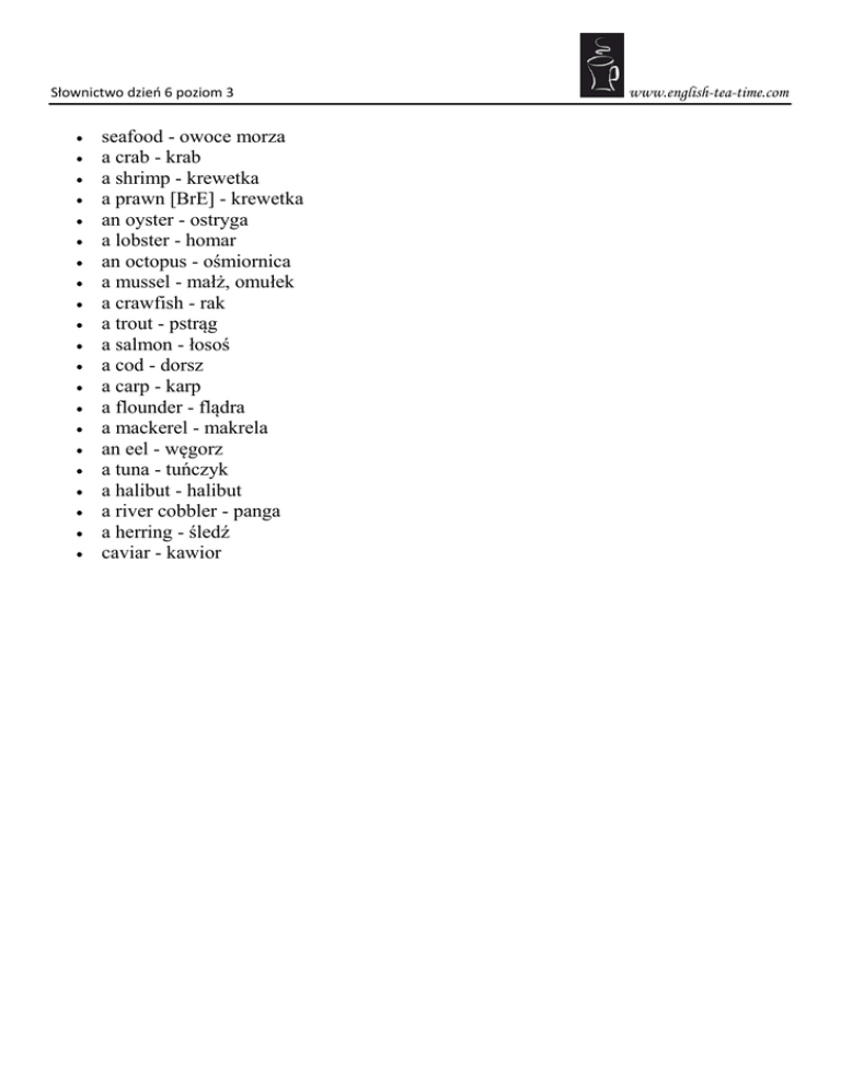 Słownictwo dzień 6 poziom 3 seafood - owoce morza a crab - krab a shrimp - krewetka a prawn [BrE] - krewetka an oyster - ostryga a lobster - homar an octopus - ośmiornica a mussel - małż, omułek a crawfish - rak a trout - pstrąg a salmon - łosoś a cod - dorsz a carp - karp a flounder - flądra a mackerel - makrela an eel - węgorz a tuna - tuńczyk a halibut - halibut a river cobbler - panga a herring - śledź caviar - kawior www.english-tea-time.com