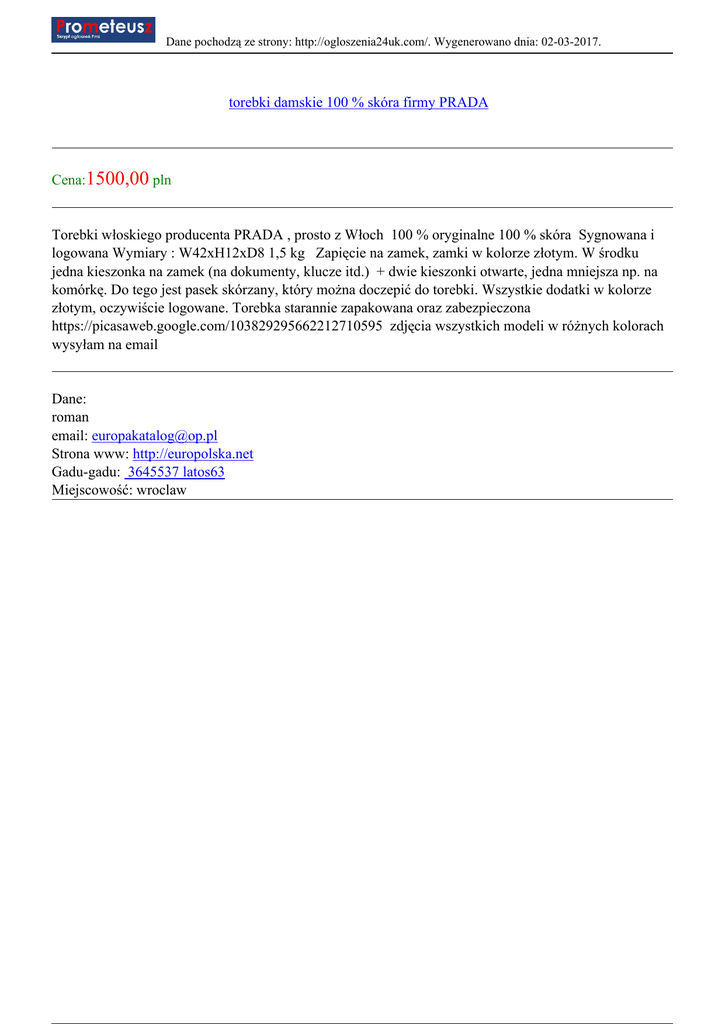Dane pochodzą ze strony: http://ogloszenia24uk.com/. Wygenerowano dnia: 02-03-2017. torebki damskie 100 % skóra firmy PRADA Cena:1500,00 pln Torebki włoskiego producenta PRADA , prosto z Włoch 100 % oryginalne 100 % skóra Sygnowana i logowana Wymiary : W42xH12xD8 1,5 kg Zapięcie na zamek, zamki w kolorze złotym. W środku jedna kieszonka na zamek (na dokumenty, klucze itd.) + dwie kieszonki otwarte, jedna mniejsza np. na komórkę. Do tego jest pasek skórzany, który można doczepić do torebki. Wszystkie dodatki w kolorze złotym, oczywiście logowane. Torebka starannie zapakowana oraz zabezpieczona https://picasaweb.google.com/103829295662212710595 zdjęcia wszystkich modeli w różnych kolorach wysyłam na email Dane: roman email: [email protected] Strona www: http://europolska.net Gadu-gadu: 3645537 latos63 Miejscowość: wroclaw