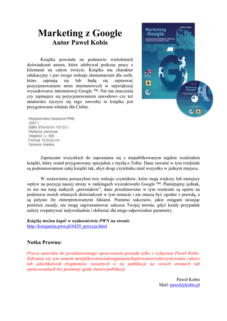 Marketing z Google Autor Paweł Kobis Książka powstała na podstawie wieloletnich doświadczeń autora, które zdobywał podczas pracy z klientami na całym świecie. Książka ma charakter edukacyjny i jest swego rodzaju elementarzem dla osób, które zajmują się lub będą się zajmować pozycjonowaniem stron internetowych w największej wyszukiwarce internetowej Google ™. Nie ma znaczenia czy zajmujesz się pozycjonowaniem zawodowo czy też amatorsko (uczysz się tego zawodu) ta książka jest przygotowana właśnie dla Ciebie. Zapraszam wszystkich do zapoznania się z niepublikowanym nigdzie rozdziałem książki, który został przygotowany specjalnie z myślą o Tobie. Dane zawarte w tym rozdziale są podsumowaniem całej książki tak, abyś drogi czytelniku miał wszystko w jednym miejscu. W zestawieniu poruszyłem trzy rodzaje czynników, które mają większy lub mniejszy wpływ na pozycję naszej strony w rankingach wyszukiwarki Google ™. Pamiętajmy jednak, że nie ma tutaj żadnych „pewniaków”, dane przedstawione w tym rozdziale są oparte na podstawie moich własnych doświadczeń w tym temacie i nie muszą być zgodne z prawdą, a są jedynie źle zinterpretowanymi faktami. Pomimo sukcesów, jakie osiągam stosując poniższe zasady, nie mogę zagwarantować sukcesu Twojej stronie, gdyż każdy przypadek należy rozpatrywać indywidualnie i dobierać dla niego odpowiednie parametry. Książkę można kupić w wydawnictwie PWN na stronie http://ksiegarnia.pwn.pl/6429_pozycja.html Notka Prawna: Prawa autorskie do przedstawionego opracowania posiada tylko i wyłącznie Paweł Kobis. Zabrania się tym samym modyfikowania/udostępniania/kopiowania/wykorzystywania całości lub jakichkolwiek fragmentów zawartych w tej publikacji na swoich stronach lub opracowaniach bez pisemnej zgody Autora publikacji Paweł Kobis Mail: [email protected] CZYNNIKI WPŁYWAJĄCE NA POZYCJĘ W WYSZUKIWARKACH Oto zestawienie tych czynników w tabeli. Ważność każdego z nich przedstawiona jest w skali 0 – 5. Poniżej krótkie omówienie niektórych z nich oraz takich, które w tabeli nie wystąpiły. + 10 Najkorzystniejszych 1. Słowa kluczowe w tytule 2. Rozbudowana sieć linków 3. Anchor Text 4. Popularność linków wewnętrznych 5. Wiek strony 6. Linki do stron podobnych 7. Popularność tematu strony 8. Słowa klucze w <body> 9. 9. Popularność linków globalnych 10. Częstość dodawania linków . 10 Kontrowersyjnych 1. Ręczne ustawianie rankingu - 5 Negatywnych 1. Niedostępność serwera 2. Zależność: temat <> zapytanie 3. Słabe linki / sprzedaż linków 4. Duplikowanie meta tagów 2. Zduplikowana zawartość 3. Linki do słabych stron 4. Duplikowanie metatagów 5. Słabe linki/sprzedaż linków 5. Popularność linków globalnych 6. Zawartość merytoryczna strony 7. Rodzaj domeny (com, gov, edu..) 8. Kiepski, awaryjny serwer 9. Linki zew. do niepewnych stron 10. Domena (edu, gov, com ...) CZYNNIKI ZWIĄZANE ZE SŁOWAMI KLUCZOWYMI UŻYCIE SŁOWA KLUCZOWEGO W TYTULE STRONY WAŻNOŚĆ: 4.9 Znawcy tematu są zgodni w tej kwestii – sformułowanie właściwego tytułu to klucz do sukcesu. Czynnik ten jest ważny od kilku lat i ta tendecja nie ulega zmianom. UŻYCIE SŁOWA KLUCZOWEGO W CIELE STRONY Ważność: 3.7 Ważne jest umieszczanie słowa kluczowego także w zawartości strony, aby miała ona logiczną spójność z tytułem. Algorytmy wyszukiwania są coraz dokładniejsze i mają zdolność sprawdzenia czy słowa na stronie są powiązane z tematem, czy też nie. str. 1 Powiązanie zawartości strony ze słowami kluczowymi Ważność: 3.4 Kolejna ważna kwestia. Zawartość strony nie musi być idealnie zgodna ze słowami kluczowymi, ale sprawdzane są też np. synonimy, pozwalające stwierdzić, czy strona na pewno traktuje o tym, o czym powinna. Słowa kluczowe w tagu <H1> Ważność: 3.4 Zależne od tematu strony oraz słowa zawartego między <H1> i </H1> . Jeśli masz strone o odkurzaczach i wpiszesz w tagu H1: Britney Spears – na pewno Ci to nie pomoże. Słowo kluczowe w nazwie domeny Ważność: 3 Używanie słów kluczowych w nazwie ma sens, jeśli oddzielimy je myślnikami. Z drugiej strony używanie zbyt wielu myślników może być zgubne. Najlepszą opcją jest całkowita zgodność słowa kluczowego oraz nazwy domeny. Słowo kluczowe w adresie URL (np. www.topseo.pl/słowo-kluczowe) Ważność: 2.8 Równie ważny czynnik, szczególnie jeśli chodzi o Yahoo. Zapewnia dobrą nawigację użytkownikom. Używaj myślników. Słowa kluczowe w tagach H2, H3, H(x) Ważność: 2.8 Drugi z najważniejszych czynników decydujący o pozycji strony. Może być czasami ważniejszy niż H1. Należy stosować go z rozwagą, gdyż źle umieszczony lub używany bez umiaru może zaszkodzić stronie. Słowa kluczowe zawarte tagach Alt i tytułach obrazków Ważność: 2.5 Bardzo ważne przy wyszukiwaniu obrazów, dużo mniej ważne przy wyszukiwaniu standardowym. Pogrubione słowa kluczowe (zawarte między <B> a </B> ) Ważność: 2.4 Podkreślenie owych słów i wyróżnienie ich z reszty tekstu może wskazać robotowi, że musi poświęcić więcej uwagi na analizę danego fragmentu. str. 2 Słowa kluczowe w tagu : Meta-Description Ważność: 1.2 Jedynie Yahoo bierze to szczególnie pod uwagę. Działa także na literówki – także Google się „da złapać” (gdy wpiszemy w tym tagu np. „Gogle” i użytkownik także popełni ten błąd przy wyszukiwaniu, jest szansa na dobrą pozycję). WŁAŚCIWOŚCI STRONY Ogólna popularność linków oraz stron linkujących do naszej Ważność: 4.5 Czyli liczba oraz jakość stron, które linkują do naszego serwisu i vice versa. Jeśli strony do których linkujemy są wartościowe, możemy liczyć na wzrost wartości PageRank strony. Wiek strony Ważność: 4 Wiek strony jest ważny, szczególnie jeśli strona ma mniej niż rok. Strona długo „wisząca” w sieci zyskuje zaufanie wyszukiwarek i lepszą pozycję w ra