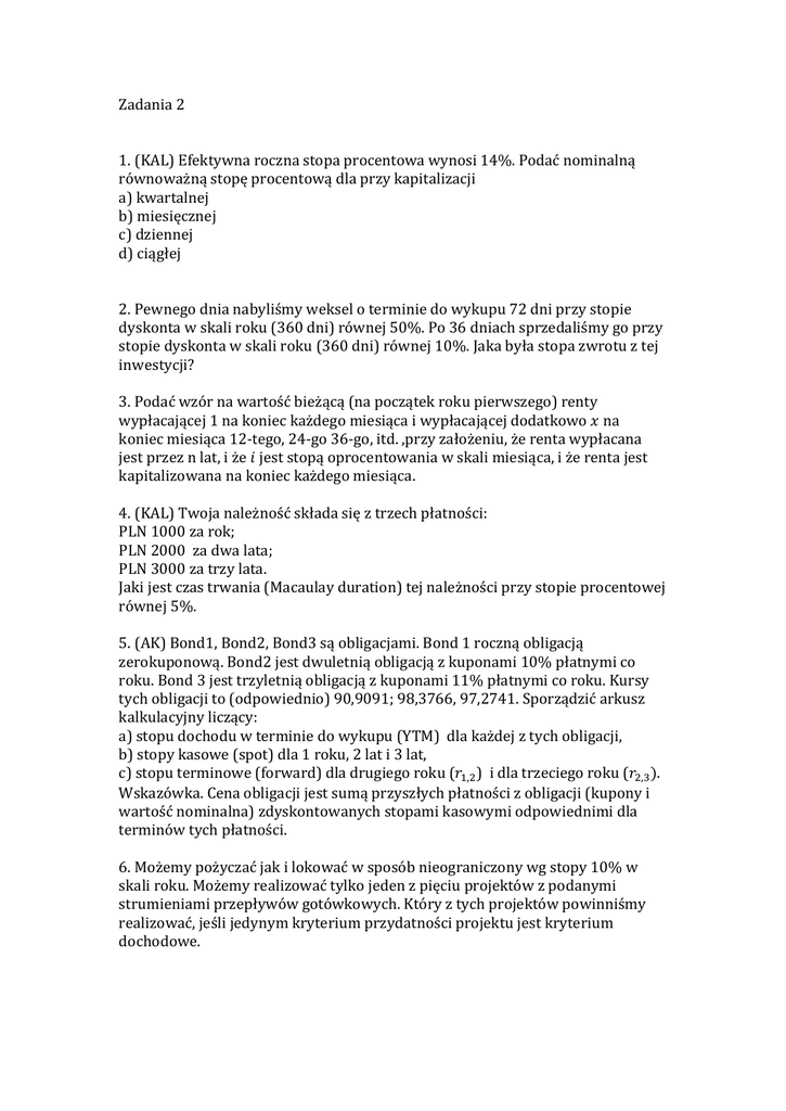 Zadania 2 1. (KAL) Efektywna roczna stopa procentowa wynosi 14%. Podać nominalną równoważną stopę procentową dla przy kapitalizacji a) kwartalnej b) miesięcznej c) dziennej d) ciągłej 2. Pewnego dnia nabyliśmy weksel o terminie do wykupu 72 dni przy stopie dyskonta w skali roku (360 dni) równej 50%. Po 36 dniach sprzedaliśmy go przy stopie dyskonta w skali roku (360 dni) równej 10%. Jaka była stopa zwrotu z tej inwestycji? 3. Podać wzór na wartość bieżącą (na początek roku pierwszego) renty wypłacającej 1 na koniec każdego miesiąca i wypłacającej dodatkowo 𝑥 na koniec miesiąca 12-‐tego, 24-‐go 36-‐go, itd. ,przy założeniu, że renta wypłacana jest przez n lat, i że 𝑖 jest stopą oprocentowania w skali miesiąca, i że renta jest kapitalizowana na koniec każdego miesiąca. 4. (KAL) Twoja należność składa się z trzech płatności: PLN 1000 za rok; PLN 2000 za dwa lata; PLN 3000 za trzy lata. Jaki jest czas trwania (Macaulay duration) tej należności przy stopie procentowej równej 5%. 5. (AK) Bond1, Bond2, Bond3 są obligacjami. Bond 1 roczną obligacją zerokuponową. Bond2 jest dwuletnią obligacją z kuponami 10% płatnymi co roku. Bond 3 jest trzyletnią obligacją z kuponami 11% płatnymi co roku. Kursy tych obligacji to (odpowiednio) 90,9091; 98,3766, 97,2741. Sporządzić arkusz kalkulacyjny liczący: a) stopu dochodu w terminie do wykupu (YTM) dla każdej z tych obligacji, b) stopy kasowe (spot) dla 1 roku, 2 lat i 3 lat, c) stopu terminowe (forward) dla drugiego roku (𝑟!,! ) i dla trzeciego roku (𝑟!,! ). Wskazówka. Cena obligacji jest sumą przyszłych płatności z obligacji (kupony i wartość nominalna) zdyskontowanych stopami kasowymi odpowiednimi dla terminów tych płatności. 6. Możemy pożyczać jak i lokować w sposób nieograniczony wg stopy 10% w skali roku. Możemy realizować tylko jeden z pięciu projektów z podanymi strumieniami przepływów gotówkowych. Który z tych projektów powinniśmy realizować, jeśli jedynym kryterium przydatności projektu jest kryterium dochodowe. r = rok Projekt 1 Projekt 2 Projekt 3 Projekt 4 Projekt 5 10% 0 1 2 3 4 -‐100 0 100 200 300 -‐200 0 100 300 500 -‐500 150 0 10 1000 -‐2000 0 600 1000 1000 -‐7000 1000 2000 3000 4000 NPV 307,10 408,68 297,17 -‐63,46 498,17 IRR 76% 57% 28% 9% 13% 7. (AK) Cztery diagramy ze strony 2 wykładu 3 przedstawiają strumienie przepływów gotówkowych dla kredytu pięcioletniego o wysokości USD 10 000 spłacanego na 4 różne sposoby. a) Dopasować diagramy do niżej wymienionych nazw sposobów spłaty: i) spłata jednorazowa ii) metoda stałej raty iii) metoda stałej raty kapitałowej iv) spłata odsetek na bieżąco, ze spłatą całości kapitału na koniec piątego roku. b) Sporządzić tabelę płatności w arkuszu kalkulacyjny i obliczyć dla każdego z kredytów: i) wewnętrzną stopę zwrotu ii) średni czas trwania iii) wartość bieżącą netto przy stopie r=10% iv) kwotę, którą należałoby płacić koniec roku 3, aby spłacić kredyt w całości. c) obliczyć wysokość każdej z czterech pierwszych rat spłaty kredytu, przy załażeniu, że stopa procentowa jest taka jak dla podanych przykładów, pierwsze cztery raty są równe, a ostatnia rata wynosi USD 5 000. 8. (AK) Posługując się odpowiednią funkcją finansową z Excela (jaką) obliczyć YTM dla obligacji PS0421 zakupionej po kursie 98,20 na GPW w dniu 13.10.2016 i opłaconej w dniu rozliczenia transakcji przez giełdę (T+2). Potrzebne dane dla tej obligacji pozyskać ze strony internetowej Ministerstwa Finansów.
