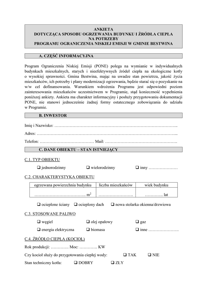 ANKIETA DOTYCZĄCA SPOSOBU OGRZEWANIA BUDYNKU I ŹRÓDŁA CIEPŁA NA POTRZEBY PROGRAMU OGRANICZENIA NISKIEJ EMISJI W GMINIE BESTWINA A. CZĘŚĆ INFORMACYJNA Program Ograniczenia Niskiej Emisji (PONE) polega na wymianie w indywidualnych budynkach mieszkalnych, starych i nieefektywnych źródeł ciepła na ekologiczne kotły o wysokiej sprawności. Gmina Bestwina, mając na uwadze stan powietrza, jakość życia mieszkańców, ich potrzeby i plany modernizacji ogrzewania, będzie starać się o pozyskanie na w/w cel dofinansowania. Warunkiem wdrożenia Programu jest odpowiedni poziom zainteresowania mieszkańców uczestnictwem w Programie, stąd konieczność wypełnienia poniższej ankiety. Ankieta ma charakter informacyjny i posłuży przygotowaniu dokumentacji PONE, nie stanowi jednocześnie żadnej formy ostatecznego zobowiązania do udziału w Programie. B. INWESTOR Imię i Nazwisko: …………………………………………………………………………….. Adres: ………………………………………………………………………………………... Telefon: ………………………………… Mail: ……………………………………………. C. DANE OBIEKTU – STAN ISTNIEJĄCY C.1. TYP OBIEKTU jednorodzinny wielorodzinny inny ………………… C.2. CHARAKTERYSTYKA OBIEKTU ogrzewana powierzchnia budynku liczba mieszkańców wiek budynku ………………………………. m2 ……………………. …………. lat ocieplone ściany ocieplony dach nowa stolarka okienna/drzwiowa C.3. STOSOWANE PALIWO węgiel olej opałowy gaz energia elektryczna biomasa inne …………………. C.4. ŹRÓDŁO CIEPŁA (KOCIOŁ) Rok produkcji: …………. Moc: …………. KW Czy kocioł służy do przygotowania ciepłej wody: Stan techniczny kotła: DOBRY TAK ZŁY NIE C.5. INNE UŻYTKOWANE ŹRÓDŁA CIEPŁA piec kuchenny kominek bojler elektryczny pompa ciepła kolektory słoneczne inne …………………… D. DEKLARACJA UDZIAŁU Czy planują Państwo przeprowadzenie modernizacji polegającej na zmianie systemu grzewczego (wymiana kotła/montaż kolektorów słonecznych itp.)? TAK NIE Czy w przypadku uruchomienia dotacji w ramach PONE będą Państwo zainteresowani dofinansowaniem do modernizacji systemu grzewczego? TAK NIE W przypadku odpowiedzi twierdzącej na poprzednie pytanie, proszę wskazać w jakim zakresie realizowana byłaby modernizacja systemu grzewczego: wymiana źródła ciepła (ze zmianą stosowanego paliwa) wymiana źródła ciepła (bez zmiany stosowanego paliwa) montaż kolektorów słonecznych inne …………………………… OŚWIADCZENIE I PODPIS Ja niżej podpisany, działając w trybie art. 23 ustawy z dnia 29 sierpnia 1997 r. o ochronie danych osobowych (Dz. U. z 2002 r. Nr 101, poz. 926 ze zm.) wyrażam zgodę na przetwarzanie moich danych osobowych przez Urząd Gminy w Bestwinie, na cele związane z opracowaniem Programu Ograniczenia Niskiej Emisji w Gminie Bestwina. Moja zgoda na przetwarzanie danych jest dobrowolna, zostałem poinformowany o przysługującym mi prawie dostępu do moich danych i ich poprawiania. ………………………………… ………………………………… (miejscowość i data) (podpis) Ankietę można złożyć osobiście w Urzędzie Gminy, pocztą na adres Urzędu lub pocztą elektroniczną na adres [email protected] w terminie do 30 grudnia 2014 r. DZIĘKUJEMY W razie pytań lub wątpliwości w kwestii wypełniania ankiety prosimy o kontakt z Referatem Służb Technicznych i Obsługi Techniczno-gospodarczej Urzędu Gminy Bestwina, ul. Krakowska 111, 43-512 Bestwina, pokój nr 7, tel. 32 215 77 07, [email protected]