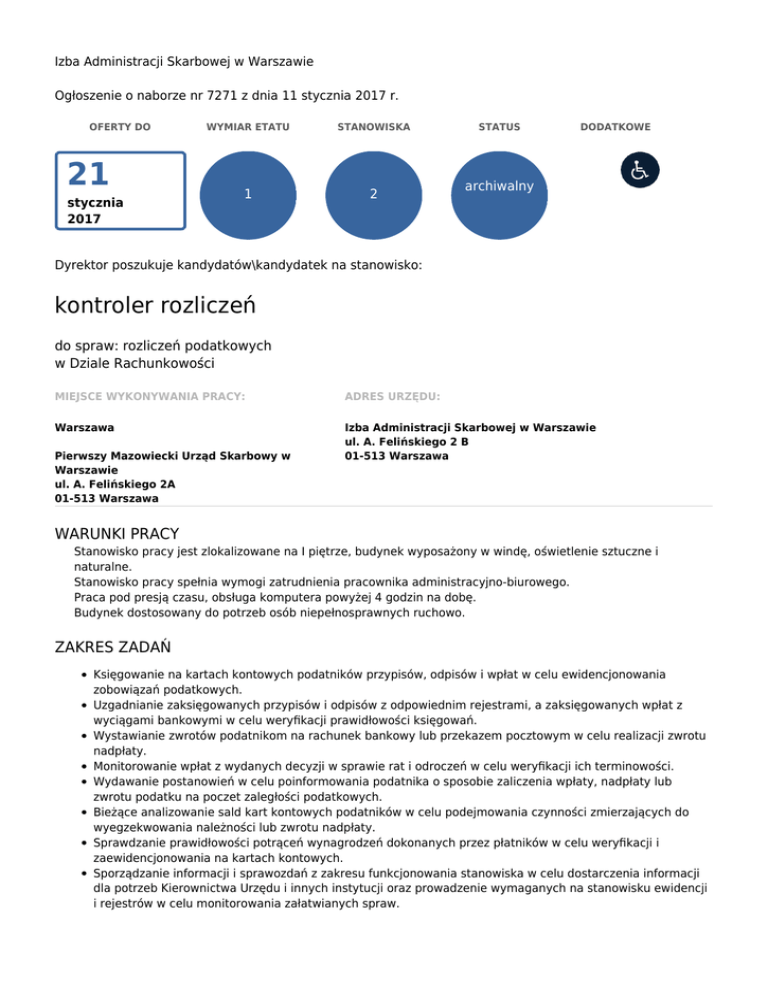 Izba Administracji Skarbowej w Warszawie Ogłoszenie o naborze nr 7271 z dnia 11 stycznia 2017 r. OFERTY DO 21 stycznia 2017 WYMIAR ETATU STANOWISKA 1 2 STATUS DODATKOWE archiwalny Dyrektor poszukuje kandydatów\kandydatek na stanowisko: kontroler rozliczeń do spraw: rozliczeń podatkowych w Dziale Rachunkowości MIEJSCE WYKONYWANIA PRACY: ADRES URZĘDU: Warszawa Izba Administracji Skarbowej w Warszawie ul. A. Felińskiego 2 B 01-513 Warszawa Pierwszy Mazowiecki Urząd Skarbowy w Warszawie ul. A. Felińskiego 2A 01-513 Warszawa WARUNKI PRACY Stanowisko pracy jest zlokalizowane na I piętrze, budynek wyposażony w windę, oświetlenie sztuczne i naturalne. Stanowisko pracy spełnia wymogi zatrudnienia pracownika administracyjno-biurowego. Praca pod presją czasu, obsługa komputera powyżej 4 godzin na dobę. Budynek dostosowany do potrzeb osób niepełnosprawnych ruchowo. ZAKRES ZADAŃ Księgowanie na kartach kontowych podatników przypisów, odpisów i wpłat w celu ewidencjonowania zobowiązań podatkowych. Uzgadnianie zaksięgowanych przypisów i odpisów z odpowiednim rejestrami, a zaksięgowanych wpłat z wyciągami bankowymi w celu weryfikacji prawidłowości księgowań. Wystawianie zwrotów podatnikom na rachunek bankowy lub przekazem pocztowym w celu realizacji zwrotu nadpłaty. Monitorowanie wpłat z wydanych decyzji w sprawie rat i odroczeń w celu weryfikacji ich terminowości. Wydawanie postanowień w celu poinformowania podatnika o sposobie zaliczenia wpłaty, nadpłaty lub zwrotu podatku na poczet zaległości podatkowych. Bieżące analizowanie sald kart kontowych podatników w celu podejmowania czynności zmierzających do wyegzekwowania należności lub zwrotu nadpłaty. Sprawdzanie prawidłowości potrąceń wynagrodzeń dokonanych przez płatników w celu weryfikacji i zaewidencjonowania na kartach kontowych. Sporządzanie informacji i sprawozdań z zakresu funkcjonowania stanowiska w celu dostarczenia informacji dla potrzeb Kierownictwa Urzędu i innych instytucji oraz prowadzenie wymaganych na stanowisku ewidencji i rejestrów w celu monitorowania załatwianych spraw. WYMAGANIA NIEZBĘDNE Wykształcenie: średnie doświadczenie zawodowe: 1 rok w administracji publicznej lub pracy biurowej Komunikatywność, umiejętność analitycznego myślenia Bardzo dobra znajomość obsługi komputera ( edytor tekstu, arkusz kalkulacyjny) Dobra znajomość przepisów prawa podatkowego, procesowego i materialnego oraz ustawy o służbie cywilnej Posiadanie obywatelstwa polskiego Korzystanie z pełni praw publicznych Nieskazanie prawomocnym wyrokiem za umyślne przestępstwo lub umyślne przestępstwo skarbowe WYMAGANIA DODATKOWE Wykształcenie: wyższe ekonomiczne, prawnicze, administracyjne Znajomość systemów informatycznych Poltax, Poltax 2B, BA, SSP DOKUMENTY I OŚWIADCZENIA NIEZBĘDNE Życiorys/CV i list motywacyjny Kopie dokumentów potwierdzających spełnienie wymagania niezbędnego w zakresie wykształcenia Kopie dokumentów potwierdzających spełnienie wymagania niezbędnego w zakresie doświadczenia zawodowego / stażu pracy Oświadczenie o posiadaniu obywatelstwa polskiego albo kopia dokumentu potwierdzającego posiadanie polskiego obywatelstwa Oświadczenie o wyrażeniu zgody na przetwarzanie danych osobowych do celów naboru Oświadczenie o korzystaniu z pełni praw publicznych Oświadczenie o nieskazaniu prawomocnym wyrokiem za umyślne przestępstwo lub umyślne przestępstwo skarbowe DOKUMENTY I OŚWIADCZENIA DODATKOWE kopia dokumentu potwierdzającego niepełnosprawność - w przypadku kandydatek/kandydatów, zamierzających skorzystać z pierwszeństwa w zatrudnieniu w przypadku, gdy znajdą się w gronie najlepszych kandydatek/kandydatów Kopie dokumentów potwierdzających spełnienie wymagania dodatkowego w zakresie wykształcenia TERMINY I MIEJSCE SKŁADANIA DOKUMENTÓW Dokumenty należy złożyć do: 21 stycznia 2017 r. Decyduje data: stempla pocztowego / osobistego dostarczenia oferty do urzędu Miejsce składania dokumentów: Izba Administracji Skarbowej w Warszawie ul. A.Felińskiego 2B 01-513 Warszawa z dopiskiem: I MUS ogłoszenie nr 7271 INNE INFORMACJE: W miesiącu poprzedzającym datę upublicznienia ogłoszenia wskaźnik zatrudnienia osób niepełnosprawnych w urzędzie, w rozumieniu przepisów o rehabilitacji zawodowej i społecznej oraz zatrudnianiu osób niepełnosprawnych, nie wynosi co najmniej 6%. Nasz urząd jest pracodawcą równych szans i wszystkie aplikacje są rozważane z równą uwagą bez względu na płeć, wiek, niepełnosprawność, rasę, narodowość, przekonania polityczne, przynależność związkową, pochodzenie etniczne, wyznanie, orientację seksualną czy też jakąkolwiek inną cechę prawnie chronioną. Zachęcamy osoby niepełnosprawne do składania ofert. Prosimy o zaznaczanie na przesyłanych dokumentach numeru ogłoszenia na jakie składana jest oferta. Ze złożonych dokumentów musi jednoznacznie wynikać długość doświadczenia zawodowego. Oferty niekompletne oraz nadane po terminie nie będą rozpatrywane /decyduje data stempla pocztowego/. ŻYCIORYS/CV, LIST MOTYWACYJNY POWINNY ZAWIERAĆ ORYGINALNY PODPIS KANDYDATA. WSZYSTKIE SKŁADANE OŚWIADCZENIA POWINNY BYĆ OPATRZONE BIEŻĄCĄ DATĄ ORAZ ZAWIERAĆ ORYGINALNY PODPIS KANDYDATA. W przypadku przedstawienia dokumentów w języku obcym należy dołączyć również ich tłumaczenie na język polski dokonane przez tłumacza przysięgłego. Oferty odrzucone zostaną komisyjnie zniszczone. Prosimy o skorzystanie ze wzorów oświadczeń obowiązujących przy naborach do pracy w Izbie Administracji Skarbowej, które są dostępne na stronie BIP pod adresem: http://www.warszawa.apodatkowa.gov.pl/izba-skarbowa-w-warszawie/ogloszenia/nabor/wzory-oswiadczen Dodatkowe informacje można uzyskać pod telefonem: 22 56 89 244, 22 56 89 323. Legenda Pierwszeństwo dla osób z niepełnosprawnościami Ogłoszenie z tym symbolem oznacza, że pierwszeństwo w zatrudnieniu 