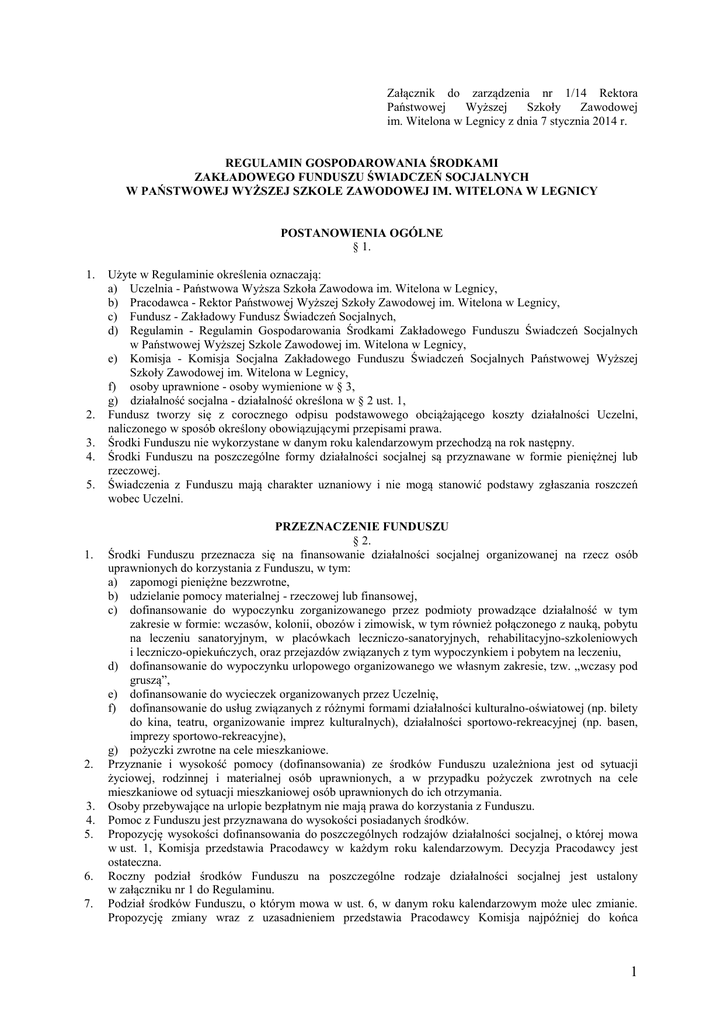 Załącznik do zarządzenia nr 1/14 Rektora Państwowej Wyższej Szkoły Zawodowej im. Witelona w Legnicy z dnia 7 stycznia 2014 r. REGULAMIN GOSPODAROWANIA ŚRODKAMI ZAKŁADOWEGO FUNDUSZU ŚWIADCZEŃ SOCJALNYCH W PAŃSTWOWEJ WYŻSZEJ SZKOLE ZAWODOWEJ IM. WITELONA W LEGNICY POSTANOWIENIA OGÓLNE § 1. 1. 2. 3. 4. 5. 1. 2. 3. 4. 5. 6. 7. Użyte w Regulaminie określenia oznaczają: a) Uczelnia - Państwowa Wyższa Szkoła Zawodowa im. Witelona w Legnicy, b) Pracodawca - Rektor Państwowej Wyższej Szkoły Zawodowej im. Witelona w Legnicy, c) Fundusz - Zakładowy Fundusz Świadczeń Socjalnych, d) Regulamin - Regulamin Gospodarowania Środkami Zakładowego Funduszu Świadczeń Socjalnych w Państwowej Wyższej Szkole Zawodowej im. Witelona w Legnicy, e) Komisja - Komisja Socjalna Zakładowego Funduszu Świadczeń Socjalnych Państwowej Wyższej Szkoły Zawodowej im. Witelona w Legnicy, f) osoby uprawnione - osoby wymienione w § 3, g) działalność socjalna - działalność określona w § 2 ust. 1, Fundusz tworzy się z corocznego odpisu podstawowego obciążającego koszty działalności Uczelni, naliczonego w sposób określony obowiązującymi przepisami prawa. Środki Funduszu nie wykorzystane w danym roku kalendarzowym przechodzą na rok następny. Środki Funduszu na poszczególne formy działalności socjalnej są przyznawane w formie pieniężnej lub rzeczowej. Świadczenia z Funduszu mają charakter uznaniowy i nie mogą stanowić podstawy zgłaszania roszczeń wobec Uczelni. PRZEZNACZENIE FUNDUSZU § 2. Środki Funduszu przeznacza się na finansowanie działalności socjalnej organizowanej na rzecz osób uprawnionych do korzystania z Funduszu, w tym: a) zapomogi pieniężne bezzwrotne, b) udzielanie pomocy materialnej - rzeczowej lub finansowej, c) dofinansowanie do wypoczynku zorganizowanego przez podmioty prowadzące działalność w tym zakresie w formie: wczasów, kolonii, obozów i zimowisk, w tym również połączonego z nauką, pobytu na leczeniu sanatoryjnym, w placówkach leczniczo-sanatoryjnych, rehabilitacyjno-szkoleniowych i leczniczo-opiekuńczych, oraz przejazdów związanych z tym wypoczynkiem i pobytem na leczeniu, d) dofinansowanie do wypoczynku urlopowego organizowanego we własnym zakresie, tzw. „wczasy pod gruszą”, e) dofinansowanie do wycieczek organizowanych przez Uczelnię, f) dofinansowanie do usług związanych z różnymi formami działalności kulturalno-oświatowej (np. bilety do kina, teatru, organizowanie imprez kulturalnych), działalności sportowo-rekreacyjnej (np. basen, imprezy sportowo-rekreacyjne), g) pożyczki zwrotne na cele mieszkaniowe. Przyznanie i wysokość pomocy (dofinansowania) ze środków Funduszu uzależniona jest od sytuacji życiowej, rodzinnej i materialnej osób uprawnionych, a w przypadku pożyczek zwrotnych na cele mieszkaniowe od sytuacji mieszkaniowej osób uprawnionych do ich otrzymania. Osoby przebywające na urlopie bezpłatnym nie mają prawa do korzystania z Funduszu. Pomoc z Funduszu jest przyznawana do wysokości posiadanych środków. Propozycję wysokości dofinansowania do poszczególnych rodzajów działalności socjalnej, o której mowa w ust. 1, Komisja przedstawia Pracodawcy w każdym roku kalendarzowym. Decyzja Pracodawcy jest ostateczna. Roczny podział środków Funduszu na poszczególne rodzaje działalności socjalnej jest ustalony w załączniku nr 1 do Regulaminu. Podział środków Funduszu, o którym mowa w ust. 6, w danym roku kalendarzowym może ulec zmianie. Propozycję zmiany wraz z uzasadnieniem przedstawia Pracodawcy Komisja najpóźniej do końca 1 8. 9. października każdego roku. Powodem zmiany planu wydatków może być jedynie optymalne wykorzystanie środków przeznaczonych na poszczególne formy pomocy w danym roku. Środki pieniężne pochodzące ze spłaty pożyczek zwrotnych na cele mieszkaniowe, zwiększają pulę pieniędzy przeznaczoną na udzielanie pożyczek. Środki pieniężne pochodzące z wpłat i potrąceń osób korzystających z wycieczek, działalności kulturalnooświatowej oraz działalności sportowo-rekreacyjnej zwiększają odpowiednio pulę pieniędzy przeznaczoną na dofinansowanie tych form działalności socjalnej. OSOBY UPRAWNIONE § 3. 1. Ze świadczeń Funduszu, z zastrzeżeniem ust. 4, mają prawo korzystać: a) pracownicy zatrudnieni na podstawie umowy o pracę w Uczelni, niezależnie od rodzaju umowy o pracę oraz od wymiaru czasu pracy, b) emeryci i renciści – byli pracownicy Uczelni, którzy bezpośrednio przed uzyskaniem świadczenia rozwiązali stosunek pracy z Uczelnią w związku z przejściem na emeryturę lub rentę i obecnie pobierają świadczenie z tego tytułu. c) członkowie rodzin osób wymienionych w lit. a)-b), d) dzieci po zmarłych pracownikach – jeżeli były na utrzymaniu zmarłych pracowników i otrzymują po nich rentę rodzinną. 2. Członkami rodzin, o których mowa w ust. 1 lit. c) są: a) współmałżonkowie, b) dzieci własne, dzieci przysposobione oraz przyjęte na wychowanie w ramach rodziny zastępczej, dzieci współmałżonka (jeżeli pozostają z uprawnionym we wspólnym gospodarstwie domowym) pozostające na utrzymaniu osoby uprawnionej do dnia 18-tych urodzin, a jeżeli kształcą się w szkole/uczelni - do ukończenia nauki, nie dłużej jednak niż do dnia 25-tych urodzin, o ile nie zawarły związku małżeńskiego; dzieciom powyżej 18-tego roku życia przysługuje prawo do korzystania z Funduszu po złożeniu przez pracownika, emeryta lub rencisty zaświadczenia ze szkoły lub uczelni, potwierdzającego kontynuowanie nauki lub ksero aktualnej legitymacji studenckiej, szkolnej, c) dzieci własne, dzieci przysposobione oraz przyjęte na wychowanie w ramach rodziny zastępczej, dzieci współmałżonka (jeżeli pozostają z uprawnionym we wspólnym gospodarstwie domowym) – bez względu na wiek, jeżeli orzeczono wobec nich znaczny stopień niepełnosprawności, pozostające na utrzymaniu osoby uprawnione