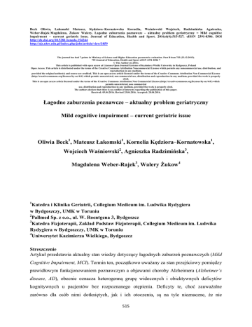 Beck Oliwia, Łakomski Mateusz, Kędziora–Kornatowska Kornelia, Waśniowski Wojciech, Radzimińska Agnieszka, Weber-Rajek Magdalena, Żukow Walery. Łagodne zaburzenia poznawcze – aktualny problem geriatryczny = Mild cognitive impairment – current geriatric issue. Journal of Education, Health and Sport. 2016;6(4):515-527. eISSN 2391-8306. DOI http://dx.doi.org/10.5281/zenodo.154244 http://ojs.ukw.edu.pl/index.php/johs/article/view/3859 The journal has had 7 points in Ministry of Science and Higher Education parametric evaluation. Part B item 755 (23.12.2015). 755 Journal of Education, Health and Sport eISSN 2391-8306 7 © The Author (s) 2016; This article is published with open access at Licensee Open Journal Systems of Kazimierz Wielki University in Bydgoszcz, Poland Open Access. This article is distributed under the terms of the Creative Commons Attribution Noncommercial License which permits any noncommercial use, distribution, and reproduction in any medium, provided the original author(s) and source are credited. This is an open access article licensed under the terms of the Creative Commons Attribution Non Commercial License (http://creativecommons.org/licenses/by-nc/4.0/) which permits unrestricted, non commercial use, distribution and reproduction in any medium, provided the work is properly cited. This is an open access article licensed under the terms of the Creative Commons Attribution Non Commercial License (http://creativecommons.org/licenses/by-nc/4.0/) which permits unrestricted, non commercial use, distribution and reproduction in any medium, provided the work is properly cited. The authors declare that there is no conflict of interests regarding the publication of this paper. Received: 05.04.2016. Revised 25.04.2016. Accepted: 28.04.2016. Łagodne zaburzenia poznawcze – aktualny problem geriatryczny Mild cognitive impairment – current geriatric issue Oliwia Beck1, Mateusz Łakomski1, Kornelia Kędziora–Kornatowska1, Wojciech Waśniowski2, Agnieszka Radzimińska3, Magdalena Weber-Rajek3, Walery Żukow4 1 Katedra i Klinika Geriatrii, Collegium Medicum im. Ludwika Rydygiera w Bydgoszczy, UMK w Toruniu 2 Pallmed Sp. z o.o., ul. W. Roentgena 3, Bydgoszcz 3 Katedra Fizjoterapii, Zakład Podstaw Fizjoterapii, Collegium Medicum im. Ludwika Rydygiera w Bydgoszczy, UMK w Toruniu 4 Uniwersytet Kazimierza Wielkiego, Bydgoszcz Streszczenie Artykuł przedstawia aktualny stan wiedzy dotyczący łagodnych zaburzeń poznawczych (Mild Cognitive Impairment, MCI). Termin ten, początkowo uważany za stan przejściowy pomiędzy prawidłowym funkcjonowaniem poznawczym a objawami choroby Alzheimera (Alzheimer’s disease, AD), obecnie oznacza heterogenną grupę widocznych i obiektywnych deficytów kognitywnych u pacjentów bez rozpoznanego otępienia. Deficyty te, choć zauważalne zarówno dla osób nimi dotkniętych, jak i ich otoczenia, są na tyle nieznaczne, że nie 515 wpływają na podstawowe czynności życia codziennego i zdolność do samodzielnej egzystencji. Rozpowszechnienie MCI szacuje się na 15 – 30% wśród osób powyżej 60 roku życia; rośnie ono wraz z wiekiem. Łagodnym zaburzeniom poznawczym – zwłaszcza ich postaci amnestycznej - przypisuje się podwyższone ryzyko rozwinięcia się otępienia, wynoszące 10 – 15% rocznie (przy 1 – 2% dla populacji ogólnej). Z tego powodu identyfikacja osób z MCI jest obecnie najważniejszą strategią opóźniania postępu otępień i zapobiegania im. Słowa kluczowe: łagodne zaburzenia poznawcze, funkcjonowanie poznawcze, wiek podeszły, otępienie Summary The article describes current state of knowledge on Mild Cognitive Impairment (MCI). The term, initially considered a transitional state between normal cognitive aging and mild Alzheimer’s disease (AD), currently covers heterogenous group of noticeable and objective cognitive deficits in patients without the diagnosis of dementia. These deficits, although apparent for both afflicted persons and their environment, do not interfere substantially with basic activities of daily living nor result in inability to live independently. The prevalence of MCI is estimated between 15 and 30% in individuals over 60 years old. Subjects with MCI constitute a high risk group because they develop dementia at a rate of 10% to 15% per year compared with 1% to 2% per year in the general population. Therefore, it is critical to identify patients with MCI in order to prevent dementia and delay its progress. Keywords: Mild Cognitive Impairment, cognitive functioning, old age, dementia Wprowadzenie Głównym zadaniem funkcji poznawczych jest umożliwienie człowiekowi adaptacji do otoczenia. Zadanie to wykonywane jest za pomocą procesów przetwarzania informacji, 516 uwagi, pamięci, uczenia się, myślenia, rozwiązywania problemów, funkcji przestrzennych i języka. Problemy w funkcjonowaniu poznawczym, o charakterze nabytym, globalnym i tak nasilonym, że w sposób istotny wpływają na funkcjonowanie człowieka, określa się ogólnie (bez wskazywania na możliwą etiologię) mianem otępienia [1]. Ze względu na zakres generowanych przez nie problemów klinicznych i społecznych, od lat stanowi ono przedmiot zainteresowania naukowców. Obecnie jednak coraz większą wagę przywiązuje się do oceny funkcjonowania poznawczego w jak najwcześniejszych stadiach zaburzeń. Wynika to z faktu, że objawy kliniczne najczęściej stwierdzanej choroby otępiennej – choroby Alzheimera ujawniają się po wielu (nierzadko 15 – 20) latach trwania choroby, gdy ubytek neuronów przekracza już krytyczny próg wynoszący ponad 50% komórek [2]. Identyfikacja osób z grup ryzyka rozwinięcia się otępienia, jak najwcześniejsza diagnoza procesu otępiennego i podjęcie adekwatnej interwencji terapeutycznej jest więc kluczowe w opóźnieniu postępu choroby i zapobieganiu otępieniom. Pogorszenie funkcjonowania kognitywnego u pacjentów nie spełniających kryteriów zaburzeń otępienn