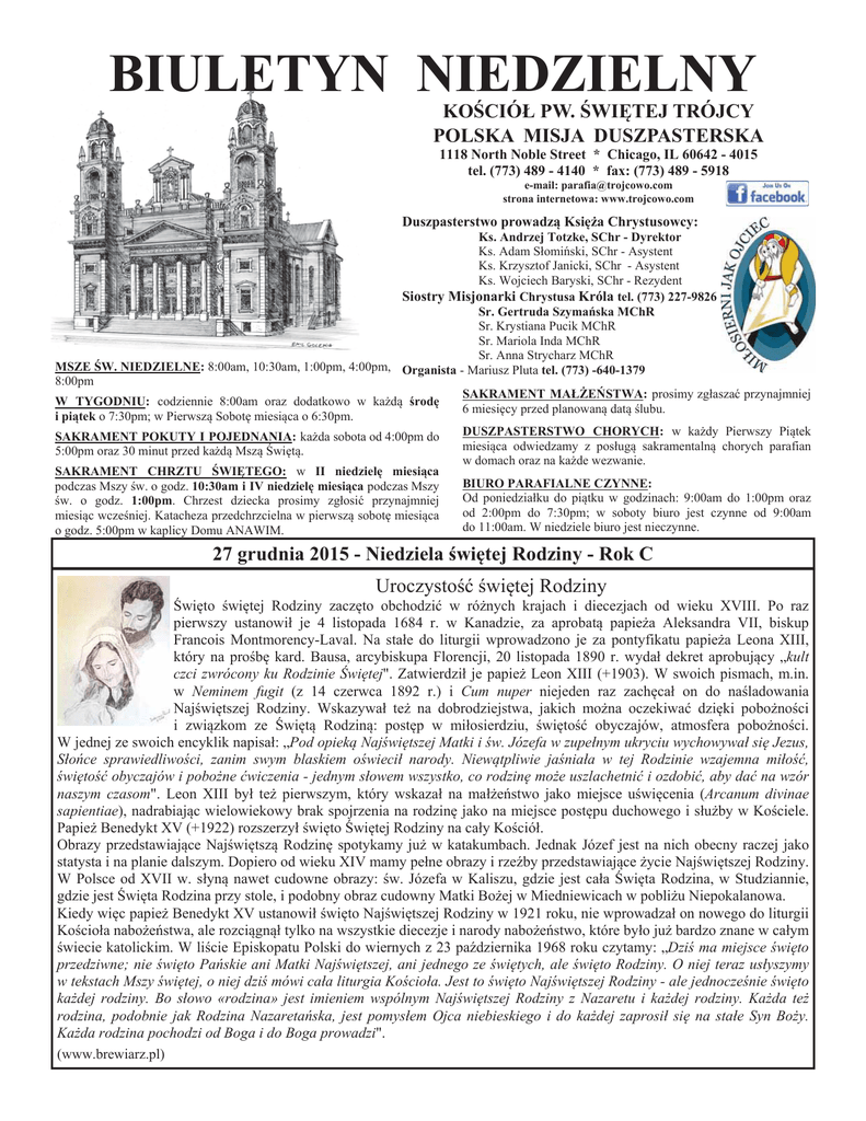 BIULETYN NIEDZIELNY KOĝCIÓà PW. ĝWIĉTEJ TRÓJCY POLSKA MISJA DUSZPASTERSKA 1118 North Noble Street * Chicago, IL 60642 - 4015 tel. (773) 489 - 4140 * fax: (773) 489 - 5918 e-mail: [email protected] strona internetowa: www.trojcowo.com Duszpasterstwo prowadzą KsiĊĪa Chrystusowcy: Ks. Andrzej Totzke, SChr - Dyrektor Ks. Adam SáomiĔski, SChr - Asystent Ks. Krzysztof Janicki, SChr - Asystent Ks. Wojciech Baryski, SChr - Rezydent Siostry Misjonarki Chrystusa Króla tel. (773) 227-9826 Sr. Gertruda SzymaĔska MChR Sr. Krystiana Pucik MChR Sr. Mariola Inda MChR Sr. Anna Strycharz MChR MSZE ĝW. NIEDZIELNE: 8:00am, 10:30am, 1:00pm, 4:00pm, Organista - Mariusz Pluta tel. (773) -640-1379 8:00pm SAKRAMENT MAàĩEēSTWA: prosimy zgáaszaü przynajmniej W TYGODNIU: codziennie 8:00am oraz dodatkowo w kaĪdą ĞrodĊ 6 miesiĊcy przed planowaną datą Ğlubu. i piątek o 7:30pm; w Pierwszą SobotĊ miesiąca o 6:30pm. DUSZPASTERSTWO CHORYCH: w kaĪdy Pierwszy Piątek SAKRAMENT POKUTY I POJEDNANIA: kaĪda sobota od 4:00pm do miesiąca odwiedzamy z posáugą sakramentalną chorych parafian 5:00pm oraz 30 minut przed kaĪdą Mszą ĝwiĊtą. w domach oraz na kaĪde wezwanie. SAKRAMENT CHRZTU ĝWIĉTEGO: w II niedzielĊ miesiąca BIURO PARAFIALNE CZYNNE: podczas Mszy Ğw. o godz. 10:30am i IV niedzielĊ miesiąca podczas Mszy Od poniedziaáku do piątku w godzinach: 9:00am do 1:00pm oraz Ğw. o godz. 1:00pm. Chrzest dziecka prosimy zgáosiü przynajmniej od 2:00pm do 7:30pm; w soboty biuro jest czynne od 9:00am miesiąc wczeĞniej. Katacheza przedchrzcielna w pierwszą sobotĊ miesiąca do 11:00am. W niedziele biuro jest nieczynne. o godz. 5:00pm w kaplicy Domu ANAWIM. 27 grudnia 2015 - Niedziela ĞwiĊtej Rodziny - Rok C UroczystoĞü ĞwiĊtej Rodziny ĝwiĊto ĞwiĊtej Rodziny zaczĊto obchodziü w róĪnych krajach i diecezjach od wieku XVIII. Po raz pierwszy ustanowiá je 4 listopada 1684 r. w Kanadzie, za aprobatą papieĪa Aleksandra VII, biskup Francois Montmorency-Laval. Na staáe do liturgii wprowadzono je za pontyfikatu papieĪa Leona XIII, który na proĞbĊ kard. Bausa, arcybiskupa Florencji, 20 listopada 1890 r. wydaá dekret aprobujący „kult czci zwrócony ku Rodzinie ĝwiĊtej". Zatwierdziá je papieĪ Leon XIII (+1903). W swoich pismach, m.in. w Neminem fugit (z 14 czerwca 1892 r.) i Cum nuper niejeden raz zachĊcaá on do naĞladowania NajĞwiĊtszej Rodziny. Wskazywaá teĪ na dobrodziejstwa, jakich moĪna oczekiwaü dziĊki poboĪnoĞci i związkom ze ĝwiĊtą Rodziną: postĊp w miáosierdziu, ĞwiĊtoĞü obyczajów, atmosfera poboĪnoĞci. W jednej ze swoich encyklik napisaá: „Pod opieką NajĞwiĊtszej Matki i Ğw. Józefa w zupeánym ukryciu wychowywaá siĊ Jezus, SáoĔce sprawiedliwoĞci, zanim swym blaskiem oĞwieciá narody. Niewątpliwie jaĞniaáa w tej Rodzinie wzajemna miáoĞü, ĞwiĊtoĞü obyczajów i poboĪne üwiczenia - jednym sáowem wszystko, co rodzinĊ moĪe uszlachetniü i ozdobiü, aby daü na wzór naszym czasom". Leon XIII byá teĪ pierwszym, który wskazaá na maáĪeĔstwo jako miejsce uĞwiĊcenia (Arcanum divinae sapientiae), nadrabiając wielowiekowy brak spojrzenia na rodzinĊ jako na miejsce postĊpu duchowego i sáuĪby w KoĞciele. PapieĪ Benedykt XV (+1922) rozszerzyá ĞwiĊto ĝwiĊtej Rodziny na caáy KoĞcióá. Obrazy przedstawiające NajĞwiĊtszą RodzinĊ spotykamy juĪ w katakumbach. Jednak Józef jest na nich obecny raczej jako statysta i na planie dalszym. Dopiero od wieku XIV mamy peáne obrazy i rzeĨby przedstawiające Īycie NajĞwiĊtszej Rodziny. W Polsce od XVII w. sáyną nawet cudowne obrazy: Ğw. Józefa w Kaliszu, gdzie jest caáa ĝwiĊta Rodzina, w Studziannie, gdzie jest ĝwiĊta Rodzina przy stole, i podobny obraz cudowny Matki BoĪej w Miedniewicach w pobliĪu Niepokalanowa. Kiedy wiĊc papieĪ Benedykt XV ustanowiá ĞwiĊto NajĞwiĊtszej Rodziny w 1921 roku, nie wprowadzaá on nowego do liturgii KoĞcioáa naboĪeĔstwa, ale rozciągnąá tylko na wszystkie diecezje i narody naboĪeĔstwo, które byáo juĪ bardzo znane w caáym Ğwiecie katolickim. W liĞcie Episkopatu Polski do wiernych z 23 paĨdziernika 1968 roku czytamy: „DziĞ ma miejsce ĞwiĊto przedziwne; nie ĞwiĊto PaĔskie ani Matki NajĞwiĊtszej, ani jednego ze ĞwiĊtych, ale ĞwiĊto Rodziny. O niej teraz usáyszymy w tekstach Mszy ĞwiĊtej, o niej dziĞ mówi caáa liturgia KoĞcioáa. Jest to ĞwiĊto NajĞwiĊtszej Rodziny - ale jednoczeĞnie ĞwiĊto kaĪdej rodziny. Bo sáowo «rodzina» jest imieniem wspólnym NajĞwiĊtszej Rodziny z Nazaretu i kaĪdej rodziny. KaĪda teĪ rodzina, podobnie jak Rodzina NazaretaĔska, jest pomysáem Ojca niebieskiego i do kaĪdej zaprosiá siĊ na staáe Syn BoĪy. KaĪda rodzina pochodzi od Boga i do Boga prowadzi". (www.brewiarz.pl) INTENCJE MSZALNE 27 grudnia 2015 - Niedziela, UroczystoĞü Ğw. Rodziny 8:00 +Józef Michalczuk w 35 rocz. Ğm. intencja od syna John 8:00 +Tadeusz i zmarli z rodziny Sztukowskich 10:30 Za zmaráych z rodziny Konieckich 10:30 +Tadeusz Kaganek intencja od Īony Marysi 1:00 W intencji máodzieĪy z Trójcowa, która w tym roku przyjĊáa sakrament bierzmowania 3:30 NIESZPORY ĝWIĄTECZNE 4:00 O miáosierdzie i potrzebne áaski dla Rycerzy Miáosierdzia BoĪego oraz kapáana-opiekuna i ich rodzin przez wstawiennictwo Matki BoĪej Miáosierdzia, a takĪe za zmaráych czáonków Wspólnoty 8:00 DziĊkczynna za otrzymane áaski dla Wioletty i Krystiana w 1 rocznicĊ Ğlubu 28 grudnia 2015 - Poniedziaáek, Ğw. Máodzianków MĊcz. 8:00 Za Īywych i zmaráych parafian 8:00 W Bogu znanej intencji 8:00 W pewnej intencji 29 grudnia 2015 - Wtorek 8:00 W Bogu znanej intencji 8:00 +Wáadysáawa Skinderowicz i zmarli z rodziny 30 grudnia 2015 - ĝroda 8:00 W Bogu znanej intencji 8:00 ++Jechna, Nykiel 7:30 INTENCJE ZBIOROWE 31 grudnia 2015 - Czwartek 8:00 W Bogu znanej intencji 6:30 NaboĪeĔstwo na zakoĔczenie roku 2015 7:00 O BoĪe báogosáawieĔstwo dla Anny i Rafaáa z