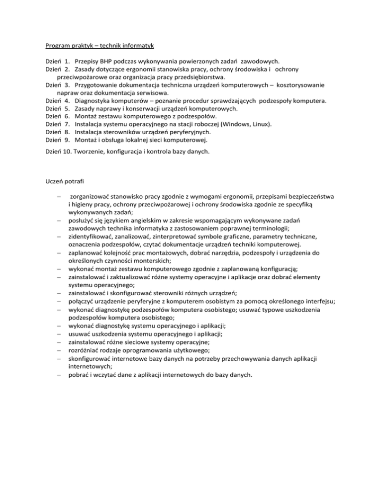 Program praktyk – technik informatyk Dzień 1. Przepisy BHP podczas wykonywania powierzonych zadań zawodowych. Dzień 2. Zasady dotyczące ergonomii stanowiska pracy, ochrony środowiska i ochrony przeciwpożarowe oraz organizacja pracy przedsiębiorstwa. Dzień 3. Przygotowanie dokumentacja techniczna urządzeń komputerowych – kosztorysowanie napraw oraz dokumentacja serwisowa. Dzień 4. Diagnostyka komputerów – poznanie procedur sprawdzających podzespoły komputera. Dzień 5. Zasady naprawy i konserwacji urządzeń komputerowych. Dzień 6. Montaż zestawu komputerowego z podzespołów. Dzień 7. Instalacja systemu operacyjnego na stacji roboczej (Windows, Linux). Dzień 8. Instalacja sterowników urządzeń peryferyjnych. Dzień 9. Montaż i obsługa lokalnej sieci komputerowej. Dzień 10. Tworzenie, konfiguracja i kontrola bazy danych. Uczeń potrafi zorganizować stanowisko pracy zgodnie z wymogami ergonomii, przepisami bezpieczeństwa i higieny pracy, ochrony przeciwpożarowej i ochrony środowiska zgodnie ze specyfiką wykonywanych zadań; posłużyć się językiem angielskim w zakresie wspomagającym wykonywane zadań zawodowych technika informatyka z zastosowaniem poprawnej terminologii; zidentyfikować, zanalizować, zinterpretować symbole graficzne, parametry techniczne, oznaczenia podzespołów, czytać dokumentacje urządzeń techniki komputerowej. zaplanować kolejność prac montażowych, dobrać narzędzia, podzespoły i urządzenia do określonych czynności monterskich; wykonać montaż zestawu komputerowego zgodnie z zaplanowaną konfiguracją; zainstalować i zaktualizować różne systemy operacyjne i aplikacje oraz dobrać elementy systemu operacyjnego; zainstalować i skonfigurować sterowniki różnych urządzeń; połączyć urządzenie peryferyjne z komputerem osobistym za pomocą określonego interfejsu; wykonać diagnostykę podzespołów komputera osobistego; usuwać typowe uszkodzenia podzespołów komputera osobistego; wykonać diagnostykę systemu operacyjnego i aplikacji; usuwać uszkodzenia systemu operacyjnego i aplikacji; zainstalować różne sieciowe systemy operacyjne; rozróżniać rodzaje oprogramowania użytkowego; skonfigurować internetowe bazy danych na potrzeby przechowywania danych aplikacji internetowych; pobrać i wczytać dane z aplikacji internetowych do bazy danych.