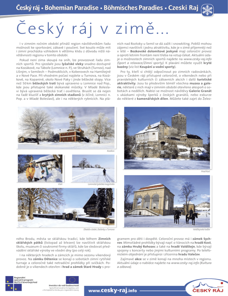 Česk ý ráj v zimě... I v zimním ročním období přináší region návštěvníkům řadu možností ke sportování, zábavě i poučení. Své kouzlo může mít i zimní procházka vzhledem k většímu klidu z důvodu nižší návštěvnosti regionu v tomto období. Pokud není zima skoupá na sníh, lze provozovat řadu zimních sportů. Pro sjezdaře jsou lyžařské vleky snadno dostupné na Kozákově, na Táboře (Lomnice n. P.), ve Struhách (Turnov), nad Líšným, v Semilech – Podmoklicích, v Koberovech na Hamštejně a v Nové Pace. Při vhodném počasí najdete u Turnova, na Kozákově, na Kopanině, okolo Nové Paky i jinde běžecké stopy. Více než 50 km běžeckých tratí bývá upraveno u Lomnice nad Pop., kde jsou přístupné také skokanské můstky. V Mladé Boleslavi bývá upravená běžecká trať i osvětlena. Bruslit se dá nejen na řadě kluzišť a krytých zimních stadionů (v Jičíně, Lomnici n. Pop. a v Mladé Boleslavi), ale i na některých rybnících. Na plá- ních nad Roztoky u Semil se dá zažít i snowkiting. Poblíž mohou zájemci navštívit i jednu atraktivitu, kde je v zimě příjemněji než v létě – Bozkovské dolomitové jeskyně mají celoroční provoz a oproti letním frontám není třeba na vstup čekat. Aktuální údaje o možnostech zimních sportů najdete na www.cesky-raj.info (Sport a relaxace/Zimní sporty). K plavání můžete využít kryté bazény (viz list Koupání a vodní sporty). Pro ty, kteří si chtějí odpočinout po zimních radovánkách, jsou v Českém ráji přístupné celoročně, o víkendech nebo při pravidelných kulturních či zábavních akcích i další turistické aktraktivity. Jsou to především téměř všechna muzea a galerie, některé z nich mají v zimním období otevřeno alespoň o sobotách a nedělích. Nabízí se možnost návštěvy Galerie Granát s ukázkami výroby šperků z českých granátů, nebo exkurze do některé z kamenářských dílen. Můžete také zajet do Želez- Kozákov Hrad Kost Všeň Lomnická lyžařská magistrála Dlaskův statek, Dolánky u Turnova ného Brodu, města se sklářskou tradicí, kde během Zimních sklářských pátků (listopad až březen) lze navštívit sklářskou školu, muzeum či soukromé firmy sklářů, kde lze sledovat předvádění sklářské výroby ve všední dny (po celý rok). I na některých hradech a zámcích je mimo sezonu víkendový provoz. Na zámku Dětenice se konají o sobotách zimní rytířské turnaje a celoročně také netradiční prohlídky při svíčkách. Podobně je o víkendech otevřen i hrad a zámek Staré Hrady s pro- Valdštejnská lodžie gramem pro děti i dospělé. Celoroční provoz má i zámek Sychrov. Mimořádné prohlídky bývají např. o Vánocích na hradě Kost, na zámku Hrubý Rohozec a také na hradě Valdštejn, kde bývají spojeny s koncerty nebo jinými kulturními programy. Po telefonickém objednání je přístupná i zřícenina hradu Valečov. Zajímavé akce se v zimě konají na mnoha místech v regionu. Aktuální údaje o nabídce najdete na www.cesky-raj.info (Kultura a zábava). www.cesky-raj.info Bohemian Paradise in Winter ... The region offers many sporting, entertainment and education opportunities, even in winter. A winter walk can be charming. If the winter is generous with snow, you can engage in winter sports. Ski lifts are available on Kozákov and Tábor hills (Lomnice n. P.), in Struhy (Turnov), above Líšný, in Semily – Podmoklice, Koberovy on Hamštejn and in Nová Paka. Cross-country skiing trails can be found near Turnov, Kozákov, Kopanina, Nová Paka, Mladá Boleslav and other places. More than 50 km of cross-country skiing trails are maintained near Lomnice nad Pop. Skating can be can enjoyed at many skating rinks and indoor ice arenas (Jičín, Lomnice n. Pop. and Mladá Boleslav) and on some ponds. Current information on winter sporting opportunities is available at www.cesky-raj.info (Sports and Relaxation/Winter sports). You can also use indoor swimming pools (see the Swimming and Water Sports Sheets). Those who want to relax can choose from many year-round, weekend and regular cultural and entertainment events and tourist attractions. These include numerous museums and galleries, some of which are open at least on weekends during the winter season. You can also visit the Granát Gallery with demonstrations of jewellery making from Bohemian garnets and take a tour of one of the stone-cutting workshops. Or take a trip to Železný Brod where you can visit a glassmaking school, a museum and private glassmakers’ shops and see glass-making with your own eyes on Winter Glass-Making Fridays. A lot of chateaux and castles are open on weekends during the winter season. The Dětenice Chateau holds jousting tournaments and unusual candle-lit tours on Saturdays. Similarly, the Staré Hrady Castle and Chateau is opened on weekends and offers programmes for both children and adults. Sychrov Chateau is also open all year round. Extraordinary tours that are often associated with cultural programmes are held in Kost Castle, Hrubý Rohozec Chateau and Valdštejn Castle at Christmas. Upon previous arrangements, the Valečov castle ruins can be accessed. Bozkovské dolomitové jeskyně (dolomite caves) are actually more pleasant in winter than in summer. Ledopády, Kozákov Das Böhmische Paradies im Winter ... Auch in der winterlichen Jahreszeit bietet die Region Gelegenheiten zu Sport, Unterhaltung und Bildung. Zimní pátky v Železném Brodě Seinen Zauber kann auch ein Winterspaziergang haben. Sofern der Winter nicht mit Schnee geizt, kann man Wintersportarten betreiben. Schlepplifte stehen zur Verfügung an den Orten Berg Kozákov, Berg Tábor (Lomnice n. P.), Struhy (Turnov), der Ortschaft nad Líšným, in Semily – Podmoklice, in Koberovy am Hügel Hamštejn und in Nová Paka. Langlaufloipen finden Sie bei Turnov