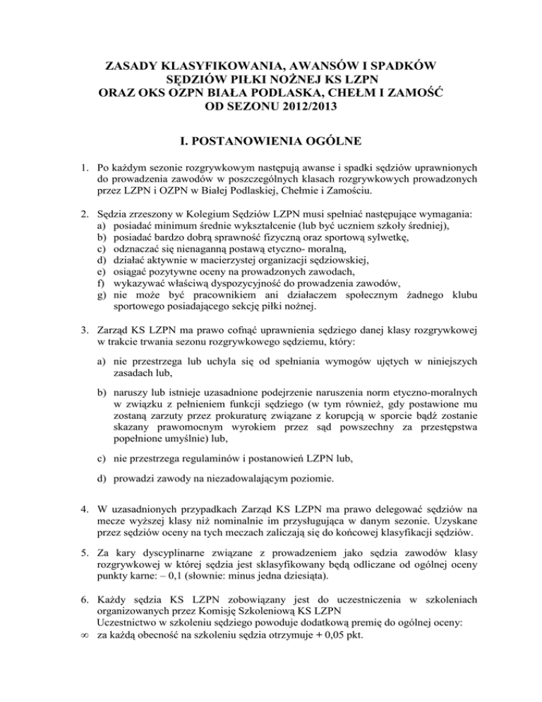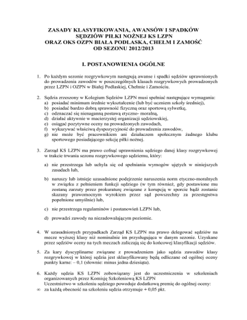 ZASADY KLASYFIKOWANIA, AWANSÓW I SPADKÓW SĘDZIÓW PIŁKI NOŻNEJ KS LZPN ORAZ OKS OZPN BIAŁA PODLASKA, CHEŁM I ZAMOŚĆ OD SEZONU 2012/2013 I. POSTANOWIENIA OGÓLNE 1. Po każdym sezonie rozgrywkowym następują awanse i spadki sędziów uprawnionych do prowadzenia zawodów w poszczególnych klasach rozgrywkowych prowadzonych przez LZPN i OZPN w Białej Podlaskiej, Chełmie i Zamościu. 2. Sędzia zrzeszony w Kolegium Sędziów LZPN musi spełniać następujące wymagania: a) posiadać minimum średnie wykształcenie (lub być uczniem szkoły średniej), b) posiadać bardzo dobrą sprawność fizyczną oraz sportową sylwetkę, c) odznaczać się nienaganną postawą etyczno- moralną, d) działać aktywnie w macierzystej organizacji sędziowskiej, e) osiągać pozytywne oceny na prowadzonych zawodach, f) wykazywać właściwą dyspozycyjność do prowadzenia zawodów, g) nie może być pracownikiem ani działaczem społecznym żadnego klubu sportowego posiadającego sekcję piłki nożnej. 3. Zarząd KS LZPN ma prawo cofnąć uprawnienia sędziego danej klasy rozgrywkowej w trakcie trwania sezonu rozgrywkowego sędziemu, który: a) nie przestrzega lub uchyla się od spełniania wymogów ujętych w niniejszych zasadach lub, b) naruszy lub istnieje uzasadnione podejrzenie naruszenia norm etyczno-moralnych w związku z pełnieniem funkcji sędziego (w tym również, gdy postawione mu zostaną zarzuty przez prokuraturę związane z korupcją w sporcie bądź zostanie skazany prawomocnym wyrokiem przez sąd powszechny za przestępstwa popełnione umyślnie) lub, c) nie przestrzega regulaminów i postanowień LZPN lub, d) prowadzi zawody na niezadowalającym poziomie. 4. W uzasadnionych przypadkach Zarząd KS LZPN ma prawo delegować sędziów na mecze wyższej klasy niż nominalnie im przysługująca w danym sezonie. Uzyskane przez sędziów oceny na tych meczach zaliczają się do końcowej klasyfikacji sędziów. 5. Za kary dyscyplinarne związane z prowadzeniem jako sędzia zawodów klasy rozgrywkowej w której sędzia jest sklasyfikowany będą odliczane od ogólnej oceny punkty karne: – 0,1 (słownie: minus jedna dziesiąta). 6. Każdy sędzia KS LZPN zobowiązany jest do uczestniczenia w szkoleniach organizowanych przez Komisję Szkoleniową KS LZPN Uczestnictwo w szkoleniu sędziego powoduje dodatkową premię do ogólnej oceny: • za każdą obecność na szkoleniu sędzia otrzymuje + 0,05 pkt. II. PODZIAŁ SĘDZIÓW W zależności od osiągniętego poziomu umiejętności w KS LZPN ustala się następujący zakres kompetencji sędziowskich tworząc podział na: 1. Sędziów uprawnionych do prowadzenia zawodów w klasie „okręgowej” o liczebności określonej corocznie przez Zarząd KS LZPN i Zarządy OKS OZPN w Białej Podlaskiej, Chełmie i Zamościu składających się z sędziów, którzy spełnili wszystkie warunki kwalifikujące ich do prowadzenia zawodów w tej klasie rozgrywkowej i nie przekroczyli 45 lat. 2. Sędziów uprawnionych do prowadzenia zawodów w klasie „A” o liczebności określonej corocznie przez Zarząd KS LZPN i Zarządy OKS OZPN w Białej Podlaskiej, Chełmie i Zamościu składających się z sędziów, którzy spełnili wszystkie warunki kwalifikujące ich do prowadzenia zawodów w tej klasie rozgrywkowej i nie przekroczyli 48 lat. 3. Sędziów uprawnionych do prowadzenia zawodów w klasie „B” o liczebności określonej corocznie przez Zarząd KS LZPN i Zarządy OKS OZPN w Białej Podlaskiej, Chełmie i Zamościu składających się z sędziów, którzy spełnili wszystkie warunki kwalifikujące ich do prowadzenia zawodów w tej klasie rozgrywkowej i nie przekroczyli 50 lat. 4. Pozostali sędziowie – niesklasyfikowani – będą wyznaczani do prowadzenia zawodów w rozgrywkach jako sędziowie asystenci w niższych klasach rozgrywkowych oraz jako główni w rozgrywkach młodzieżowych. 5. Sędziowie, którzy ukończyli 40 rok życia, a nie przekroczyli 65 lat zostaną zaliczeni do grupy sędziów seniorów jeżeli: − złożą aktualną kartę zdrowia, − aktywnie uczestniczą w szkoleniu sędziów, − zaliczą pozytywnie test teoretyczny ze znajomości przepisów gry w piłkę nożną, − zaliczą 6 pełnych okrążeń w biegu interwałowym – czasy jak dla kobiet w okręgu, będą wyznaczani do prowadzenia zawodów w rozgrywkach jako sędziowie asystenci oraz główni rozgrywek młodzieżowych 6. Jako miarodajny przyjmuje się wiek osiągnięty przez sędziego w danym roku kalendarzowym. III. OBSERWACJE 1. Na zawodach mistrzowskich, pucharowych i barażowych, których obsady dokonuje Zarząd KS LZPN, sędziowie są poddawani egzaminom praktycznym przeprowadzanym przez obserwatorów wyznaczonych przez Zarząd KS LZPN Zarządy OKS OZPN wg wytycznych KS PZPN. Skala ocen od 5 do 10 pkt. 2. Sędziowie prezentujący wysoki poziom prowadzenia zawodów będą częściej uwzględniani w obsadzie zawodów. Decyzja o liczbie prowadzonych przez sędziego zawodów nie może być przedmiotem odwołania i nie podlega uzasadnianiu ze strony KS LZPN. 3. Niezwłocznie po zakończeniu każdego sezonu rozgrywkowego wylicza się średnie arytmetyczne z ocen, których minimalną ilość dla poszczególnych grup sędziów określa się następująco: ◦ sędziowie klasy okręgowej - 4 egzaminy, gdy sędzia jest w wieku dającym możliwość awansu do IV ligi, a dla pozostałych nie mniej niż 2 egzaminy, ◦ sędziowie klasy „A” – co najmniej 3 egzaminy, ◦ sędziowie klasy B” – co najmniej 1 egzamin. IV. EGZAMINY TEORETYCZNE I KONDYCYJNE 1. W czasie trwania sezonu, sędziowie KS LZPN zostaną poddani w dwóch terminach egzaminom konkursowym: • teoretycznemu ze znajomości przepisów gry w piłkę nożną zawierającego 30 pytań, • egzaminowi kondycyjnemu – testowi interwałowemu. Uczestnictwo sędziego w egzaminach jest obowiązkowe. 2. Sędziowie poddający się egzaminom teoretycznym bądź kondycyjnym w drugim terminie lub zdający