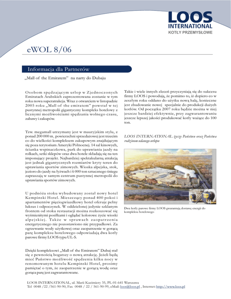 KOT£Y PRZEMYS£OWE eWOL 8/06 Informacja dla Partnerów „Mall of the Emiratem” na narty do Dubaju O s o b o m s p ê d z a j ¹ c y m u r l o p w Z j ed n o c z o n y ch Emiratach Arabskich zaprezentowana zostanie w tym roku nowa superatrakcja. Wraz z otwarciem w listopadzie 2005 roku „Mall of the emiratem” powsta³ w tej pustynnej metropolii gigantyczny kompleks hotelowy z licznymi mo¿liwoœciami spêdzania wolnego czasu, zabawy i zakupów. Tzw. megamall utrzymany jest w mauryjskim stylu, z ponad 200 000 m² powierzchni sprzeda¿owej jest trzecim co do wielkoœci kompleksem zakupowym znajduj¹cym siê poza terytorium Ameryki Pó³nocnej. 14 sal kinowych, œcianka wspinaczkowa, park do uprawiania jazdy na rolkach, setki sklepów oraz dwa hotele sk³adaj¹ siê na ten imponuj¹cy projekt. Najbardziej spektakularn¹ atrakcj¹ jest jednak gigantycznych rozmiarów kryty teren do uprawiania sportów zimowych. Wioska alpejska, stok, jezioro do jazdy na ³y¿wach i 6 000 ton sztucznego œniegu zapraszaj¹ w samym centrum pustynnej metropolii do uprawiania sportów zimowych. U podnó¿a stoku wybudowany zosta³ nowy hotel Kempinski Hotel. Mieszcz¹cy ponad 400 pokoi i apartamentów piêciogwiazdkowy hotel oferuje pe³ny luksus i odpoczynek. W oddzielonej jedynie szklanym frontem od stoku restauracji mo¿na rozkoszowaæ siê wyœmienitymi posi³kami i ogl¹daæ kolorowe ¿ycie wioski a l p e j s k i e j . Ta k ¿ e w s p r a w a c h z a o p a t r z e n i a energetycznego nie pozostawiono nic przypadkowi. Za ogrzewanie wody u¿ytkowej oraz zaopatrzenie w gor¹c¹ parê kompleksu hotelowego odpowiadaj¹ dwa kot³y parowe firmy LOOS typu UL-S. Takie i wiele innych zleceñ przyczyniaj¹ siê do sukcesu firmy LOOS i powoduj¹, ¿e pomimo to, i¿ dopiero co w zesz³ym roku oddano do u¿ytku now¹ halê, konieczne jest zbudowanie nowej specjalnie do produkcji du¿ych kot³ów. Od pocz¹tku 2007 roku bêdzie mo¿na w niej jeszcze bardziej efektywnie, przy zagwarantowaniu jeszcze lepszej jakoœci produkowaæ kot³y wa¿¹ce do 100 ton. LOOS INTERNATIONAL ¿yczy Pañstwu oraz Pañstwa rodzinom udanego urlopu Dwa kot³y parowe firmy LOOS gwarantuj¹ dostawê energii do kompleksu hotelowego Dziêki kompleksowi „Mall of the Emiratem” Dubaj sta³ siê z pewnoœci¹ bogatszy o now¹ atrakcjê. Je¿eli bêd¹ mieæ Pañstwo mo¿liwoœæ spêdzenia kilku nocy w renomowanym hotelu Kempinski Hotel, prosimy pamiêtaæ o tym, ¿e zaopatrzenie w gor¹c¹ wodê oraz gor¹ca parê jest zagwarantowane. LOOS INTERNATIONAL, ul. Marii Kazimiery 35, PL-01-641 Warszawa Tel 0048 /22 /561-90-90, Fax 0048 / 22 / 561-90-99, eMail: [email protected] , Internet: http://www.loos.pl
