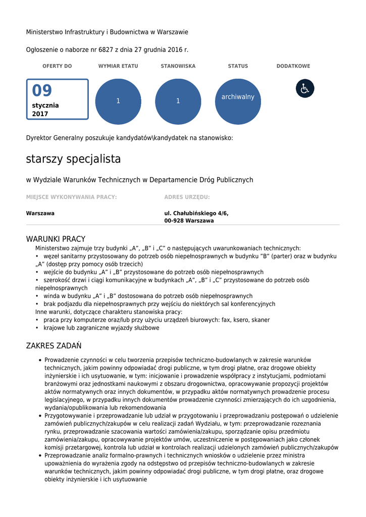 Ministerstwo Infrastruktury i Budownictwa w Warszawie Ogłoszenie o naborze nr 6827 z dnia 27 grudnia 2016 r. OFERTY DO 09 stycznia 2017 WYMIAR ETATU STANOWISKA 1 1 STATUS DODATKOWE archiwalny Dyrektor Generalny poszukuje kandydatów\kandydatek na stanowisko: starszy specjalista w Wydziale Warunków Technicznych w Departamencie Dróg Publicznych MIEJSCE WYKONYWANIA PRACY: ADRES URZĘDU: Warszawa ul. Chałubińskiego 4/6, 00-928 Warszawa WARUNKI PRACY Ministerstwo zajmuje trzy budynki „A”, „B” i „C” o następujących uwarunkowaniach technicznych: • węzeł sanitarny przystosowany do potrzeb osób niepełnosprawnych w budynku ”B” (parter) oraz w budynku „A” (dostęp przy pomocy osób trzecich) • wejście do budynku „A” i „B” przystosowane do potrzeb osób niepełnosprawnych • szerokość drzwi i ciągi komunikacyjne w budynkach „A”, „B” i „C” przystosowane do potrzeb osób niepełnosprawnych • winda w budynku „A” i „B” dostosowana do potrzeb osób niepełnosprawnych • brak podjazdu dla niepełnosprawnych przy wejściu do niektórych sal konferencyjnych Inne warunki, dotyczące charakteru stanowiska pracy: • praca przy komputerze oraz/lub przy użyciu urządzeń biurowych: fax, ksero, skaner • krajowe lub zagraniczne wyjazdy służbowe ZAKRES ZADAŃ Prowadzenie czynności w celu tworzenia przepisów techniczno-budowlanych w zakresie warunków technicznych, jakim powinny odpowiadać drogi publiczne, w tym drogi płatne, oraz drogowe obiekty inżynierskie i ich usytuowanie, w tym: inicjowanie i prowadzenie współpracy z instytucjami, podmiotami branżowymi oraz jednostkami naukowymi z obszaru drogownictwa, opracowywanie propozycji projektów aktów normatywnych oraz innych dokumentów, w przypadku aktów normatywnych prowadzenie procesu legislacyjnego, w przypadku innych dokumentów prowadzenie czynności zmierzających do ich uzgodnienia, wydania/opublikowania lub rekomendowania Przygotowywanie i przeprowadzanie lub udział w przygotowaniu i przeprowadzaniu postępowań o udzielenie zamówień publicznych/zakupów w celu realizacji zadań Wydziału, w tym: przeprowadzanie rozeznania rynku, przeprowadzanie szacowania wartości zamówienia/zakupu, sporządzanie opisu przedmiotu zamówienia/zakupu, opracowywanie projektów umów, uczestniczenie w postępowaniach jako członek komisji przetargowej, kontrola lub udział w kontrolach realizacji udzielonych zamówień publicznych/zakupów Przeprowadzanie analiz formalno-prawnych i technicznych wniosków o udzielenie przez ministra upoważnienia do wyrażenia zgody na odstępstwo od przepisów techniczno-budowlanych w zakresie warunków technicznych, jakim powinny odpowiadać drogi publiczne, w tym drogi płatne, oraz drogowe obiekty inżynierskie i ich usytuowanie Współpraca z Wydziałem Sieci Drogowej w celu uwzględniania wymagań techniczno-budowlanych przy finansowaniu z budżetu państwa inwestycji na drogach samorządowych Prowadzenie, w imieniu ministra, spraw nadzoru nad Generalnym Dyrektorem Dróg Krajowych i Autostrad, w tym: udział w posiedzeniach Komisji Oceny Przedsięwzięć Inwestycyjnych, analiza i opiniowanie projektów i planów drogowych z zakresu dróg krajowych Przygotowywanie projektów odpowiedzi na wnioski, skargi, petycje i pytania obywateli oraz instytucji dotyczące techniczno-budowlanych aspektów realizacji inwestycji w zakresie dróg publicznych WYMAGANIA NIEZBĘDNE Wykształcenie: wyższe techniczne Doświadczenie zawodowe: co najmniej 2 lata pracy w obszarze drogownictwa w następujących jednostkach: w administracji publicznej, jednostkach projektowych, wykonawczych lub konsultingowych Znajomość języka angielskiego na poziomie B2 Znajomość procesu przygotowania i realizacji inwestycji drogowych oraz eksploatacji i utrzymania dróg publicznych, a w szczególności: ustawy Prawo budowlane, w tym wydanych na jej podstawie przepisów techniczno-budowlanych w obszarze drogownictwa, ustawy o szczególnych zasadach przygotowania i realizacji inwestycji w zakresie dróg publicznych, ustawy o drogach publicznych Znajomość ustawy prawo Zamówień publicznych Znajomość funkcjonowania administracji publicznej, w tym w szczególności administracji architektonicznobudowlanej Umiejętność organizacji pracy i zorientowanie na osiąganie celów Skuteczna komunikacja Posiadanie obywatelstwa polskiego Korzystanie z pełni praw publicznych Nieskazanie prawomocnym wyrokiem za umyślne przestępstwo lub umyślne przestępstwo skarbowe DOKUMENTY I OŚWIADCZENIA NIEZBĘDNE Życiorys/CV i list motywacyjny Kopie dokumentów potwierdzających spełnienie wymagania niezbędnego w zakresie wykształcenia Kopie dokumentów potwierdzających spełnienie wymagania niezbędnego w zakresie doświadczenia zawodowego – np. kopie świadectw pracy, zaświadczeń o zatrudnieniu, opisów stanowisk, zakresów czynności lub kopie innych zaświadczeń (należy potwierdzić zamknięty okres i obszar tematyczny doświadczenia zawodowego) Oświadczenie o posiadaniu obywatelstwa polskiego albo kopia dokumentu potwierdzającego posiadanie polskiego obywatelstwa Oświadczenie o wyrażeniu zgody na przetwarzanie danych osobowych do celów naboru Oświadczenie o korzystaniu z pełni praw publicznych Oświadczenie o nieskazaniu prawomocnym wyrokiem za umyślne przestępstwo lub umyślne przestępstwo skarbowe DOKUMENTY I OŚWIADCZENIA DODATKOWE kopia dokumentu potwierdzającego niepełnosprawność - w przypadku kandydatek/kandydatów, zamierzających skorzystać z pierwszeństwa w zatrudnieniu w przypadku, gdy znajdą się w gronie najlepszych kandydatek/kandydatów TERMINY I MIEJSCE SKŁADANIA DOKUMENTÓW Dokumenty należy złożyć do: 09 stycznia 2017 r. Decyduje data: stempla pocztowego / osobistego dostarczenia oferty do urzędu Miejsce składania dokumentów: Ministerstwo Infrastruktury i Budownictwa Biuro Dyrektora Generalnego ul. Chałubińskiego 4/6; 00-928 Warszawa Dokumenty, 