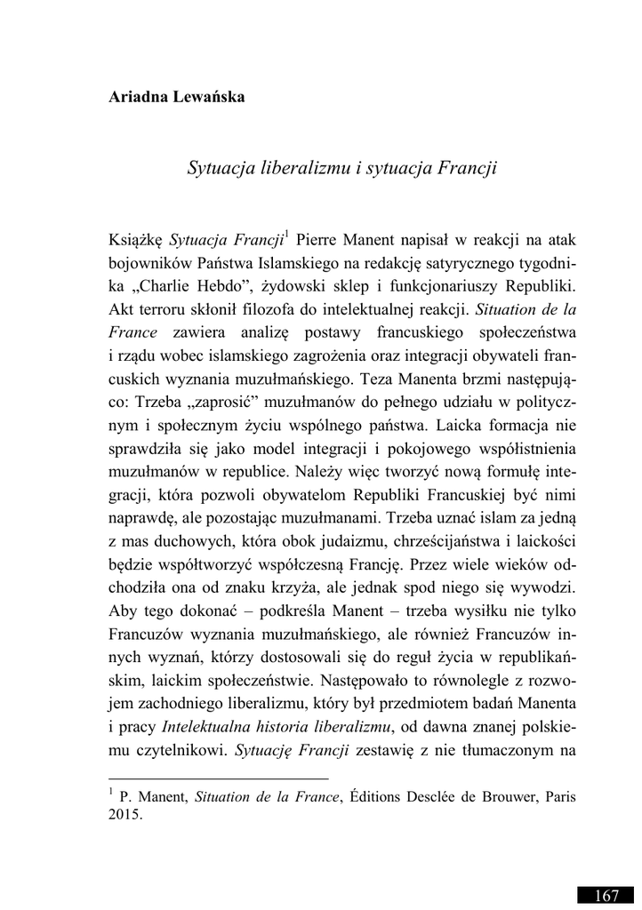 Ariadna Lewańska Sytuacja liberalizmu i sytuacja Francji Książkę Sytuacja Francji1 Pierre Manent napisał w reakcji na atak bojowników Państwa Islamskiego na redakcję satyrycznego tygodnika „Charlie Hebdo”, żydowski sklep i funkcjonariuszy Republiki. Akt terroru skłonił filozofa do intelektualnej reakcji. Situation de la France zawiera analizę postawy francuskiego społeczeństwa i rządu wobec islamskiego zagrożenia oraz integracji obywateli francuskich wyznania muzułmańskiego. Teza Manenta brzmi następująco: Trzeba „zaprosić” muzułmanów do pełnego udziału w politycznym i społecznym życiu wspólnego państwa. Laicka formacja nie sprawdziła się jako model integracji i pokojowego współistnienia muzułmanów w republice. Należy więc tworzyć nową formułę integracji, która pozwoli obywatelom Republiki Francuskiej być nimi naprawdę, ale pozostając muzułmanami. Trzeba uznać islam za jedną z mas duchowych, która obok judaizmu, chrześcijaństwa i laickości będzie współtworzyć współczesną Francję. Przez wiele wieków odchodziła ona od znaku krzyża, ale jednak spod niego się wywodzi. Aby tego dokonać – podkreśla Manent – trzeba wysiłku nie tylko Francuzów wyznania muzułmańskiego, ale również Francuzów innych wyznań, którzy dostosowali się do reguł życia w republikańskim, laickim społeczeństwie. Następowało to równolegle z rozwojem zachodniego liberalizmu, który był przedmiotem badań Manenta i pracy Intelektualna historia liberalizmu, od dawna znanej polskiemu czytelnikowi. Sytuację Francji zestawię z nie tłumaczonym na 1 P. Manent, Situation de la France, Éditions Desclée de Brouwer, Paris 2015. 167 Ariadna Lewańska język polski esejem Manenta, który podobnie jak Intelektualna historia liberalizmu ukazał się w roku 1986. Sytuację Francji porównam z Sytuacją liberalizmu. Tekst ten stanowi wstęp do antologii Les libéraux w jego opracowaniu2. Ukażę, na ile tytułowa „sytuacja Francji” wynika z „sytuacji liberalizmu”. Co warto podkreślić, do analizy bieżących politycznych zdarzeń Manent wraca po 30 latach, które poświęcił badaniu dynamiki i źródeł zachodniej cywilizacji i kultury politycznej. Ostatnio wydaną książkę La vie sans loi3 (Życie bez prawa) poświęcił badaniu esejów Montaigne’a i zagadnieniom reformacji. Obie sytuacje jednak – Sytuację Francji i Sytuację liberalizmu – łączy bezpośrednie odniesienie do politycznych zdarzeń, pasja interpretacji bulwersujących zjawisk z perspektywy filozofa. 1. Sytuacja liberalizmu (1986) „To liberalizm dostarcza terminów, w których Europejczycy i Amerykanie formułują problemy społecznego życia” pisze Manent w roku 1986 na pierwszej stronie Sytuacji liberalizmu. Uważa, że liberalizm ma kluczowe znaczenie dla rozumienia współczesnej rzeczywistości oraz że „zasady liberalne”4 stosowane są coraz powszechniej i z bardziej wyrazistym zaangażowaniem. Zasady liberalne definiują orientację naszych społeczeństw. Jest to zjawisko nowe, gdyż przez ponad 200 lat liberalizm torował sobie drogę, zakleszczony między ancien régime, czyli systemem starego porządku, a radykalizmem socjalistycznym lub rewolucyjnym. Ma on zresztą wobec obu charakter krytyczny. 2 Tenże, Les liberaux, Hachette, Paris 1986. Tenże, Montaigne. La vie sans loi, Flammarion, Paris 2014. 4 P. Manent, Les libéraux, dz. cyt., s. 10. 3 168 Sytuacja liberalizmu i sytuacja Francji Myśl liberalna jest krytyką zarówno państwa opiekuńczego, jak i państwa omnipotentnego. Jest krytyką państwa totalnego i państwa bezradnego wobec liberum veto. Wynika to z obserwacji. Zdaniem liberałów, zarówno robotnik, jak i przedsiębiorca „blakną” w zderzeniu z człowiekiem administrowanym, obywatelem zarządzanym. Substancję liberalizmu z punktu widzenia Manenta tworzy surowa krytyka zarządzania. Pytanie, które należy postawić, chcąc lepiej zrozumieć sytuację i fenomen liberalizmu, jest następujące: jak to możliwe, że mimo tak silnej krytyki, wszechwładne państwo umocniło się równolegle z jej rozwojem? Jak był możliwy i jak przebiegał na przestrzeni wieków równoczesny rozwój państwa i administracji, a z drugiej strony krytyka tego państwa z punktu widzenia jednostki? Liberalizm w opisie Pierre’a Manenta to krytyka ancien régime’u, na który składają się prócz stosunków feudalnych przede wszystkim królewski absolutyzm i quasi-polityczna władza Kościoła. Liberalizm reinterpretuje sens politycznego istnienia ludzi. Historia liberalizmu, wytyczona wektorem teologiczno-politycznym, to odchodzenie od organizacji politycznej, w której ludzie byliby powiązani zasadami najwyższego rzędu. Liberalizm radykalnie obniża status prawa. Z nieba sprowadza go na ziemię. Manent ujmuje to w ten sposób: „prawo ciała politycznego było złamaniem prawa ostatecznego; prawo ludzkie – złamaniem prawa boskiego”. Okazało się to konieczne, gdyż odwołania do najwyższej zasady skutkowały w Europie wojnami religijnymi, a ludzie muszą jakoś razem żyć. Zanim człowiek sformułuje swoją opinię o Wszechświecie czy sprawach ostatecznych, chce przeżyć. Przetrwać. To jest jego prawo naturalne. Manet opisuje, jak na tej niskiej, zwierzęcej podstawie liberalizm konstruuje swój program. To naturalne prawo człowieka ma trzy nierozdzielne aspekty: 169 Ariadna Lewańska 1. bezpieczeństwo (czyli prawo zachowania cielesnej integralności); 2. własność (prawo do zdobywania i gromadzenia środków do życia); 3. wolność (każdy sam najlepiej osądza, jakim sposobem utrzyma się przy życiu). Instytucje polityczne, tworzone wraz z rozwojem liberalnej myśli, mają zagwarantować jednostkom te trzy podstawowe prawa. Aby było to uczciwie egzekwowane i gwarantowane, jednostki, którym przysługują prawa, wybierają swoich przedstawicieli. Liberalizm nowożytny, podkreśla Manent, jest więc z istoty demok