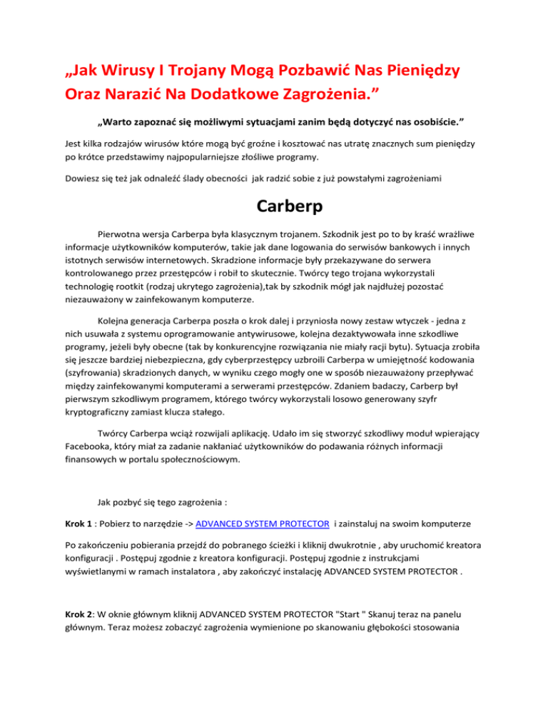 „Jak Wirusy I Trojany Mogą Pozbawid Nas Pieniędzy Oraz Narazid Na Dodatkowe Zagrożenia.” „Warto zapoznad się możliwymi sytuacjami zanim będą dotyczyd nas osobiście.” Jest kilka rodzajów wirusów które mogą byd groźne i kosztowad nas utratę znacznych sum pieniędzy po krótce przedstawimy najpopularniejsze złośliwe programy. Dowiesz się też jak odnaleźd ślady obecności jak radzid sobie z już powstałymi zagrożeniami Carberp Pierwotna wersja Carberpa była klasycznym trojanem. Szkodnik jest po to by kraśd wrażliwe informacje użytkowników komputerów, takie jak dane logowania do serwisów bankowych i innych istotnych serwisów internetowych. Skradzione informacje były przekazywane do serwera kontrolowanego przez przestępców i robił to skutecznie. Twórcy tego trojana wykorzystali technologię rootkit (rodzaj ukrytego zagrożenia),tak by szkodnik mógł jak najdłużej pozostad niezauważony w zainfekowanym komputerze. Kolejna generacja Carberpa poszła o krok dalej i przyniosła nowy zestaw wtyczek - jedna z nich usuwała z systemu oprogramowanie antywirusowe, kolejna dezaktywowała inne szkodliwe programy, jeżeli były obecne (tak by konkurencyjne rozwiązania nie miały racji bytu). Sytuacja zrobiła się jeszcze bardziej niebezpieczna, gdy cyberprzestępcy uzbroili Carberpa w umiejętnośd kodowania (szyfrowania) skradzionych danych, w wyniku czego mogły one w sposób niezauważony przepływad między zainfekowanymi komputerami a serwerami przestępców. Zdaniem badaczy, Carberp był pierwszym szkodliwym programem, którego twórcy wykorzystali losowo generowany szyfr kryptograficzny zamiast klucza stałego. Twórcy Carberpa wciąż rozwijali aplikację. Udało im się stworzyd szkodliwy moduł wpierający Facebooka, który miał za zadanie nakłaniad użytkowników do podawania różnych informacji finansowych w portalu społecznościowym. Jak pozbyd się tego zagrożenia : Krok 1 : Pobierz to narzędzie -> ADVANCED SYSTEM PROTECTOR i zainstaluj na swoim komputerze Po zakooczeniu pobierania przejdź do pobranego ścieżki i kliknij dwukrotnie , aby uruchomid kreatora konfiguracji . Postępuj zgodnie z kreatora konfiguracji. Postępuj zgodnie z instrukcjami wyświetlanymi w ramach instalatora , aby zakooczyd instalację ADVANCED SYSTEM PROTECTOR . Krok 2: W oknie głównym kliknij ADVANCED SYSTEM PROTECTOR "Start " Skanuj teraz na panelu głównym. Teraz możesz zobaczyd zagrożenia wymienione po skanowaniu głębokości stosowania Krok 3: Po krok Skanuj do " czyszczenia wszystko ", aby zakooczyd kasowanie tej groźniej aplikacji ZeuS Nazywany często królem złośliwych aplikacji atakujących systemy bankowe. Należy wejśd na stronę http://www.drweb.com/ i wybrad zakładkę „Download” i program Dr.Web CureIt Po wybraniu tego programu następuje przejście na stronę http://www.freedrweb.com/cureit/ i pobrad program na nasz komputer. Program nie wymaga tradycyjnej instalacji. Wystarczy dwukrotnie nacisnąd lewy przycisk myszki na ikonie pobranego programu i rozpocząd skanowanie komputera. Żeby skorzystad z wersji darmowej należy zgodzid się na udział w poprawie jakości oprogramowania Nazwa Trojana może byd różna. Dr. Web Trojana Zbot nazywał Trojan.PWS.Panda.xxx gdzie xxx może przyjmowad różne wartości w zależności od wersji Trojana np.: 31,102,106 itp. Kolejny krok po wyryciu to kasowanie zagrożenia : Citadel Citadel to kolejna wariacja na temat ''niekoronowanego króla'' szkodników finansowych - ZeuSa. Pojawił się w 2011 r. wraz z szeregiem innych szkodliwych programów, tuż po tym, jak kod źródłowy ZeuSa został opublikowany w internecie. Grupa (lub grupy co do kooca nie jest wiadome) cyberprzestępców stojących za Citadelem stworzyły społecznośd klientów i współpracowników na całym świecie, tak by byli zainteresowani korzystaniem z tego narzędzia i jego nieustannym rozwijaniem. Najbardziej interesującą z opcji dodanych do Citadela było dodanie szyfrowania własnych plików konfiguracyjnych i całej komunikacji z serwerem kontrolowanym przez przestępców, umiejętnośd unikania wykrywania, zdolnośd do blokowania dostępu do stron związanych z bezpieczeostwem internetowym oraz co ciekawe nagrywanie użytkowników przy użyciu kamer podłączonych do zainfekowanych komputerów. Jak widad narzędzie było bardzo sprytne. W celu usunięcia wirusa Citadel, zalecanym jest użycie oprogramowania anti-spyware które posiada wszystkie poprawki oraz aktualizacje na wirusy. Polecamy użycie -> SpyHunter oraz -> STOPzilla. Jak to zrobid pokażemy na podstawie narzędzia SpyHunter jest to aplikacja płatna, ale skuteczna w bardzo wielu przypadkach. Program jest relatywnie mały, proces instalacji programowania nie powinien zajac dłużej niż kilka minut. Proces instalacji oprogramowania jest wyjątkowo prosty. Po prostu trzeba dwa razy kliknąd na ikonkę oprogramowania i ukaże się widok instalacji tego oprogramowania Na początek trzeba zaaktualizowad oprogramowanie SpyHunter do najnowszej wersji. Ten krok jest wyjątkowo ważny ponieważ oprogramowanie SpyHunter może nie byd w stanie wykryd i usunąd najnowszych zagrożeo bez jak najnowszej bazy wirusów. W tym celu kliknij ikonę na pulpicie i znajdż skrót oprogramowania SpyHunter w menu start i kliknij na nią. Jeżeli oprogramowanie będzie zainstalowane na komputerze to proces rozpocznie się automatycznie. Teraz po prostu przejdź do przycisku Aktualizuj i z pewnoscia pobierzesz na swoj komputer wszystkie niezbedne aktualizacje. Aby rozpocząd skan systemu trzeba przejśd do przycisku Rozpocznij nowy skan. Rozpocznie to pełny skan systemu i sprawdzi dokładnie cały system. SpyHunter sprawdzi też pamięd twojego komputera, rejestr systemu Windows, a także zainstalowane sterowniki wraz z procesami i nawet pliki cookies przeglądarek internetowych Kolejne kroki to Jak tylko klikniesz przycisk Fix Threats to SpyHunter stara się naprawid twój kom