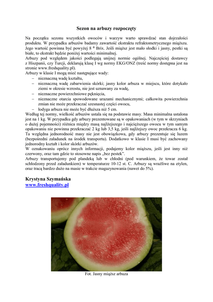 Sezon na arbuzy rozpoczęty Na początku sezonu wszystkich owoców i warzyw warto sprawdzać stan dojrzałości produktu. W przypadku arbuzów badamy zawartość ekstraktu refraktometrycznego miąŜszu. Jego wartość powinna być powyŜej 8 ⁰ Brix. Jeśli miąŜsz jest mało słodki i jasny, pestki są białe, to ekstrakt będzie poniŜej wartości minimalnej. Arbuzy pod względem jakości podlegają unijnej normie ogólnej. Najczęściej dostawcy z Hiszpanii, czy Turcji, deklarują klasę I wg normy EKG/ONZ (treść normy dostępna jest na stronie www.freshquality.pl). Arbuzy w klasie I mogą mieć następujące wady: − nieznaczną wadę kształtu, − nieznaczną wadę zabarwienia skórki; jasny kolor arbuza w miejscu, które dotykało ziemi w okresie wzrostu, nie jest uznawany za wadę, − nieznaczne powierzchniowe pęknięcia, − nieznaczne otarcia spowodowane urazami mechanicznymi; całkowita powierzchnia zmian nie moŜe przekraczać szesnastej części owocu, − łodyga arbuza nie moŜe być dłuŜsza niŜ 5 cm. Według tej normy, wielkość arbuzów ustala się na podstawie masy. Masa minimalna ustalona jest na 1 kg. W przypadku gdy arbuzy prezentowane są w opakowaniach (w tym w skrzyniach o duŜej pojemności) róŜnica między masą najlŜejszego i najcięŜszego owocu w tym samym opakowaniu nie powinna przekraczać 2 kg lub 3,5 kg, jeśli najlŜejszy owoc przekracza 6 kg. Ta względna jednorodność masy nie jest obowiązkowa, gdy arbuzy prezentuje się luzem (bezpośredni załadunek na środek transportu). Dodatkowo w klasie I musi być zachowany jednorodny kształt i kolor skórki arbuzów. W oznakowaniu oprócz innych informacji, podajemy kolor miąŜszu, jeśli jest inny niŜ czerwony, oraz tam gdzie to stosowne napis „bez pestek”. Arbuzy transportujemy pod plandeką lub w chłodni (pod warunkiem, Ŝe towar został schłodzony przed załadunkiem) w temperaturze 10-12 st. C. Arbuzy są wraŜliwe na etylen, oraz tracą bardzo duŜo na masie w trakcie magazynowania (nawet do 5%). Krystyna Szymańska www.freshquality.pl Fot. Jasny miąŜsz arbuza Fot. Pleśń na łodydze Fot. Pomiar temperatury miąŜszu