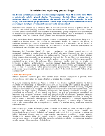 Młodzieniec w ybrany przez Boga Ks. Bosko uważał go za wzór młodzieńczej świętości. Pius XI mówił o nim: Mały, a właściwie wielki gigant ducha. Tymczasem dzisiaj, kiedy patrzy się na pobożne obrazki z jego podobizną, nie sposób oprzeć się wrażeniu, że miał rację, ten kto nazwał go gołębiarzem. Gdzie więc leży prawda o Dominiku Savio, pierwszym świętym wychowanku założyciela salezjanów? Dominik Savio urodził się 2 kwietnia 1842 r. w San Giovanni di Riva w pobliżu Chieri. W wieku 12 lat został przyjęty przez ks. Bosko do oratorium na Valdocco. W 1856 r. wraz z kilkoma przyjaciółmi założył Towarzystwo Niepokalanej, grupę chłopców zaangażowanych w młodzieńczy apostolat dobrego przykładu. Umarł 9 marca 1857 w Mondonio, w wieku niespełna 15 lat. 12 czerwca 1954 r. papież Pius XII ogłosił go świętym. Kiedy wertujemy kartki kalendarza przed oczami przesuwają się nam imiona świętych. O niektórych wiemy sporo, jak choćby o nawróceniu Pawła, o zaparciu się Piotra, o ubóstwie Franciszka z Asyżu, o radości Filipa Nereusza i o wierności, aż po śmierć o. Maksymiliana. Do świętych modlimy się i wzywamy ich pomocy. Rzadziej pamiętamy, że Pan Bóg dał nam ich jako wzory do naśladowania. Dlaczego dał Dominika Savio? On sam - zważywszy na słowa: raczej umrzeć niż zgrzeszyć napisane w wieku siedmiu lat, w dzień pierwszej Komunii św. jawi się nam nienaturalny i raczej nie zachęca do naśladowania. Trudno też pójść śladami ekstaz, które czasem towarzyszyły mu po przyjęciu Komunii św. On po Mszy św. pozostawał w kościele, zanurzony w modlitwę przez wiele godzin, nam znacznie bliżej do pogawędki z przyjaciółmi, do pracy, do zabawy. Choć otaczamy troską chorych, to chyba nie bylibyśmy w stanie - a Dominik był - nastroić naszych dusz na odbiór "Bożych fal", które prowadzą do zagubionego na łóżka, zapomnianej przez wszystkich, umierającej kobiety. Któż z nas, w oparciu o takie ponadnaturalne przekonanie, śmiałby obudzić swego proboszcza i poprowadziłby go pod objawiony adres? A Dominik to potrafił. Tylko jak go naśladować? Łatwo być świętym Wbrew pozorom Dominik jest nam bardzo bliski. Przede wszystkim z powodu kilku doświadczeń, które stały się jego udziałem w drodze do świętości. W pewną niedzielę Wielkiego Postu w 1855 r. ks. Bosko wygłosił kazanie na temat świętości młodzieńczej i z naciskiem zaznaczył, że naprawdę łatwo jest ją osiągnąć. Ta idea trafiła na podatny grunt. Dominik był przecież chłopcem dobrym z natury, otrzymał nienaganne wychowanie religijne i od dzieciństwa wyrastał w klimacie bojaźni Bożej. Jeśli dołożymy do tego ogólną atmosferę entuzjazmu dla sprawy Królestwa Bożego, jaka panowała na Valdocco, to nie należy się dziwić, że już po pierwszych zachętach do stawania się świętymi, Dominik oddał się gorączkowym marzeniom i planom zdobycia nagrody w niebie. Z tego też powodu nie usłyszał ostatniej części kazania, w której ks. Bosko mówił o środkach niezbędnych do osiągnięcia świętości: o dobrym wypełnianiu codziennych obowiązków, o radości, pobożności, czystości, o miłości Boga i bliźniego, czyli - jak spuentował swe wystąpienie ks. Bosko - o służbie Bożej właściwej wiekowi młodzieńczemu. Podczas gdy ks. Bosko kończył kazanie, Dominik opracował już plan zażyłej przyjaźni z Bogiem. Być świętym - myślał - to tyle co być blisko Boga, cieszyć się błogosławieństwem ludzi i doświadczać boskich natchnień. Był przekonany, że droga do takiej świętości biegnie poprzez umartwienia, samotność, modlitwy i srogą pokutę. Wystarczyło jednak kilka dni takich praktyk, żeby popadł w melancholię, chodził rozmarzony, senny, przestał jeść. Nie cieszyły go lekcje w szkole i nie odczuwał zupełnie smaku zabawy i towarzystwa rówieśników. 1 I wtedy wkroczył ks. Bosko. Myślałem, że łatwo zostać świętym - tłumaczył się speszony Dominik. - Ja muszę być świętym. Wychowawca pochwalił jego zapał, a potem powoli sprowadził go na właściwą drogę. Trzeba byś był wesoły - mówił - byś dobrze wypełniał swoje obowiązki szkolne i przeżywał właściwie sakramenty i praktyki pobożności. I nigdy nie zapominaj o zabawie z rówieśnikami. Tyle wystarczyło. Ks. Bosko zaproponował środki proste, ale właściwe dla wieku i możliwości Dominika. Przekonał go, że trzeba starać się być wiernym tym zwyczajnym, zdawać by się mogło, trywialnym "sposobom na świętość". Dobre chęci i zapał Dominika dopełniły dzieła. Chłopiec czynił szybkie postępy na drodze młodzieńczej świętości. Wciąż radosny, pracowity, był zawsze gotów otoczyć opieką nowych wychowanków oratorium, upominał gorszycieli, doprowadzał do pojednania zwaśnionych przyjaciół. Aby zdobywać dla swej sprawy wciąż nowych chłopców, założył z przyjaciółmi Towarzystwo Niepokalanej. Stał się prawdziwym apostołem. Dobrze wykorzystał krótki czas, jaki Bóg dał mu do dyspozycji. Zmęczony szukaniem upragnionego ideału i przygnieciony chorobą musiał opuścić Valdocco dla podratowania zdrowia. On jednak, po raz kolejny uprzedzony jakimś boskim natchnieniem, pożegnał się z ks. Bosko i kolegami na zawsze. A jednak nam bliski Trudno zachęcać do naśladowania ekstaz Dominika i do otwierania się na ten typ natchnień, jakimi Bóg go doświadczał. Jest jednak w Dominiku coś, co mnie urzeka, przez co stał się bliski współczesnej młodzieży. Jego życie rządziło się prawami młodości. Jak wszyscy w jego wieku, był wrażliwy na dobro i szukał szczęścia. Jednocześnie, tak jak jego rówieśnicy, był niepoprawnym idealistą i po trochę marzycielem. To przecież popędliwe marzenia zajęły jego uwagę, podczas gdy ks. Bosko tłumaczył, jak zostać świętym. Idealista Dominik trwał przy swoim zamierzeniu, mimo złego samopoczucia, samo