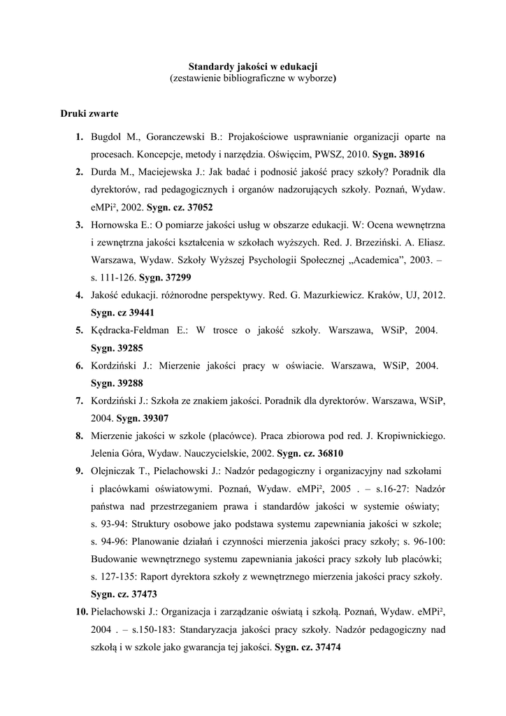 Standardy jakości w edukacji (zestawienie bibliograficzne w wyborze) Druki zwarte 1. Bugdol M., Goranczewski B.: Projakościowe usprawnianie organizacji oparte na procesach. Koncepcje, metody i narzędzia. Oświęcim, PWSZ, 2010. Sygn. 38916 2. Durda M., Maciejewska J.: Jak badać i podnosić jakość pracy szkoły? Poradnik dla dyrektorów, rad pedagogicznych i organów nadzorujących szkoły. Poznań, Wydaw. eMPi², 2002. Sygn. cz. 37052 3. Hornowska E.: O pomiarze jakości usług w obszarze edukacji. W: Ocena wewnętrzna i zewnętrzna jakości kształcenia w szkołach wyższych. Red. J. Brzeziński. A. Eliasz. Warszawa, Wydaw. Szkoły Wyższej Psychologii Społecznej „Academica”, 2003. – s. 111-126. Sygn. 37299 4. Jakość edukacji. różnorodne perspektywy. Red. G. Mazurkiewicz. Kraków, UJ, 2012. Sygn. cz 39441 5. Kędracka-Feldman E.: W trosce o jakość szkoły. Warszawa, WSiP, 2004. Sygn. 39285 6. Kordziński J.: Mierzenie jakości pracy w oświacie. Warszawa, WSiP, 2004. Sygn. 39288 7. Kordziński J.: Szkoła ze znakiem jakości. Poradnik dla dyrektorów. Warszawa, WSiP, 2004. Sygn. 39307 8. Mierzenie jakości w szkole (placówce). Praca zbiorowa pod red. J. Kropiwnickiego. Jelenia Góra, Wydaw. Nauczycielskie, 2002. Sygn. cz. 36810 9. Olejniczak T., Pielachowski J.: Nadzór pedagogiczny i organizacyjny nad szkołami i placówkami oświatowymi. Poznań, Wydaw. eMPi², 2005 . – s.16-27: Nadzór państwa nad przestrzeganiem prawa i standardów jakości w systemie oświaty; s. 93-94: Struktury osobowe jako podstawa systemu zapewniania jakości w szkole; s. 94-96: Planowanie działań i czynności mierzenia jakości pracy szkoły; s. 96-100: Budowanie wewnętrznego systemu zapewniania jakości pracy szkoły lub placówki; s. 127-135: Raport dyrektora szkoły z wewnętrznego mierzenia jakości pracy szkoły. Sygn. cz. 37473 10. Pielachowski J.: Organizacja i zarządzanie oświatą i szkołą. Poznań, Wydaw. eMPi², 2004 . – s.150-183: Standaryzacja jakości pracy szkoły. Nadzór pedagogiczny nad szkołą i w szkole jako gwarancja tej jakości. Sygn. cz. 37474 11. Stróżyński K.: Jakość pracy szkoły. W: Encyklopedia Pedagogiczna XXI w. T.2 pod red. T. Pilcha. Warszawa, Wydaw. Akademickie „Żak”, 2003 . – s. 438-441. Sygn. P 36804/2 12. Suckiel I.: Badanie jakości pracy szkoły/placówki. W: Menedżer i kreator edukacji pod red. Cz. Plewki i H. Bednarczyka. Radom, Wydaw. Instytutu Technologii Eksploatacji, 2008. – s. 274-280. Sygn. cz. 38058 13. Suckiel I.: Ewaluacja skuteczności działań. W: Menedżer i kreator edukacji pod red. Cz. Plewki i H. Bednarczyka. Radom, Wydaw. Instytutu Technologii Eksploatacji, 2008. – s. 285-288. Sygn. cz. 38058 14. Suckiel I.: Planowanie rozwoju szkoły. Standardy oceny jakości pracy szkół i placówek. W: Menedżer i kreator edukacji pod red. Cz. Plewki i H. Bednarczyka. Radom, Wydaw. Instytutu Technologii Eksploatacji, 2008. – s. 239-241. Sygn. cz. 38058 15. Suckiel I.: Procedura monitorowania jakości oświaty w województwie. W: Menedżer i kreator edukacji pod red. Cz. Plewki i H. Bednarczyka. Radom, Wydaw. Instytutu Technologii Eksploatacji, 2008. – s. 283-284. Sygn. cz. 38058 16. Suckiel I.: Wspomaganie szkół w osiąganiu najwyższej jakości. W: Menedżer i kreator edukacji pod red. Cz. Plewki i H. Bednarczyka. Radom, Wydaw. Instytutu Technologii Eksploatacji, 2008. – s. 281-282. Sygn. cz. 38058 17. Wlazło S.: System zapewniania jakości pracy szkoły i placówki oświatowej. W: Menedżer i kreator edukacji pod red. Cz. Plewki i H. Bednarczyka. Radom, Wydaw. Instytutu Technologii Eksploatacji, 2008. – s. 289-301. Sygn. cz. 38058 Artykuły z czasopism 1. Co to jest jakość szkoły? / K. Stróżyński // EDUKACJA I DIALOG . – 2000, nr 6, s.2-5 2. Elementy systemu zapewniania jakości w kształceniu zawodowym / R. Szubański // NOWA EDUKACJA ZAWODOWA . – 2000, nr 2, s.4-11 3. Ewaluacja – narzędzie wprowadzania i oceny standardów jakości / M. Majewski // EDUKACJA I DIALOG . – 2000. nr 6, s.30-36 4. Jakie standardy jakości szkół społecznych? / M. Lachtara, J. Bedner // EDUKACJA I DIALOG . – 2000, nr 9, s.26-36 5. Jakość – oświata – wartości / W. Kołodziejczyk // EDUKACJA I DIALOG . – 2000, nr 6, s.6-14 6. Jakość pracy liceum w programie POST / E. Tokarzewski // EDUKACJA I DIALOG . – 2000, nr 9, s.36-42 7. Koncepcja organizacji i planowania mierzenia jakości pracy szkoły lub placówki oświatowej. Cz. 1 / J. Pielachowski // EDUKACJA MEDIALNA . – 2000, nr 3, s. 812 8. Koncepcja organizacji i planowania mierzenia jakości pracy szkoły lub placówki oświatowej. Cz. 2 / J. Pielachowski // EDUKACJA MEDIALNA . – 2000, nr 4, s. 4-8 9. Nowa szkoła zawodowa – jaka? Zapewnianie jakości w kształceniu zawodowym – spojrzenie ogólne / E. Kędracka // NOWA EDUKACJA ZAWODOWA . – 2000, nr 2, s.17-18 10. Systemy zarządzania jakością w edukacji / H. Bednarczyk, T. Sułkowski, M. Żurek // EDUKACJA USTAWICZNA DOROSŁYCH . – 2004, nr 4, s.26-34