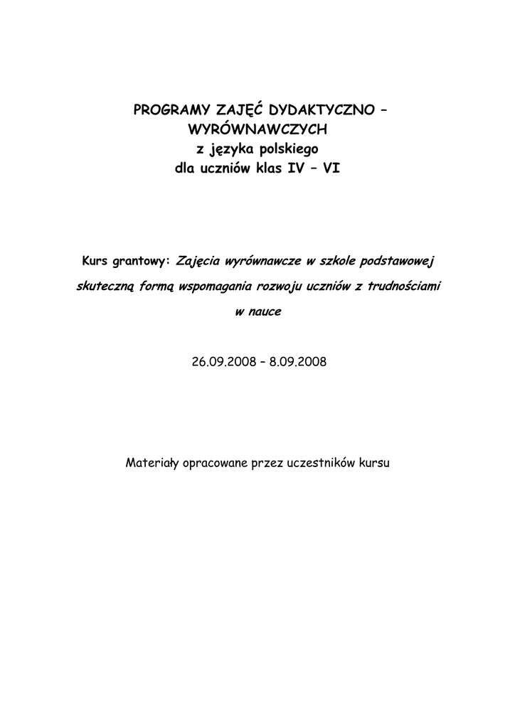PROGRAMY ZAJĘĆ DYDAKTYCZNO – WYRÓWNAWCZYCH z języka polskiego dla uczniów klas IV – VI Kurs grantowy: Zajęcia wyrównawcze w szkole podstawowej skuteczną formą wspomagania rozwoju uczniów z trudnościami w nauce 26.09.2008 – 8.09.2008 Materiały opracowane przez uczestników kursu Program zajęć wyrównawczych Wstęp Program przeznaczony jest dla uczniów klas szóstych szkoły podstawowej z trudnościami w nauce języka polskiego Cele edukacyjne ogólne: - uzupełnienie wiadomości z zakresu kształcenia literackiego literackiego językowego, - rozbudzanie wiary w moŜliwość pokonywania trudności szczegółowe: - doskonalenie czytania ze zrozumieniem, - bogacenie słownictwa i doskonalenie umiejętności wykorzystania go w róŜnych formach wypowiedzi, - kształtowanie umiejętności stosowania zasad składni w budowie wypowiedzi, - wdraŜanie do świadomego korzystania z róŜnych źródeł informacji, - ćwiczenie umiejętności stosowania zasad ortograficznych i interpunkcyjnych w praktyce, - stymulowanie rozwoju uczniów poprzez wykorzystanie ćwiczeń kinezjologii edukacyjnej. ZałoŜenia programu W zajęciach uczestniczą uczniowie chętni i wyznaczeni przez nauczycieli języka polskiego. Zdobyte umiejętności wykorzystują na zajęciach podczas wykonywania zadań samodzielnych i w czasie pracy w grupach. Umiejętności zdobywane przez uczniów powodują coraz bardziej świadome posługiwanie się przez nich językiem. Realizacja załoŜeń programowych Organizacja zajęć Zajęcia odbywają się raz w tygodniu i trwają 45 minut. Uczestnicy spotykają się w ustalonym terminie. Praca na zajęciach jest systematyczna i planowa. Pomoce naukowe - ćwiczenia Ortograffitti - róŜnego rodzaju słowniki - wybrane przez nauczyciela teksty kultury - przygotowane przez nauczyciela teksty kultury Procedury osiągania celów - praca ze słownikami -praca z ćwiczeniami Ortograffitti - ćwiczenia ortograficzne, językowe, redakcyjne - zabawy dydaktyczne - analiza tekstów kultury Treści kształcenia Standard Treści kształcenia Zakres tematyczny C 1. Praca z wybranymi tekstami kultury Z - odpowiedzi na pytania do tekstu Y - zadawanie pytań do tekstu T - dzielenie tekstu na części i nadawanie tytułów A - przygotowywanie prostych quizów i krzyŜówek Liczba godzin ok.10 godzin, wg potrzeb zespołu N I E P I S A N I E K O R Z Y S T A N I E Z I N F O R M A C J I na podstawie przeczytanego tekstu - przekład intersemiotyczny - ustalanie informacji o podmiocie lirycznym - wyszukiwanie i nazywanie środków stylistycznych - zachęcanie uczniów do czytania - tłumaczenie związków frazeologicznych 2. Praca z podręcznikami i ćwiczeniami - czytanie i analizowanie róŜnego rodzaju poleceń 1. Redagowanie planów wydarzeń (róŜne rodzaje wypowiedzeń) 2. Redagowanie pism uŜytkowych i wskazywanie ich funkcji (zaproszenie, ogłoszenie) 3. Wypełnianie druków urzędowych (przekaz pocztowy, przelew bankowy) 4. Ćwiczenia w osiąganiu spójności wypowiedzi 5. Redagowanie podstawowych form wypowiedzi (opowiadanie, opis, list, charakterystyka, sprawozdanie) 6. Ćwiczenia ortograficzne i interpunkcyjne 7. Ćwiczenia językowe z zakresu fleksji 1. Praca ze słownikami - ćwiczenie wykorzystania alfabetu w praktyce, - wyszukiwanie informacji w słownikach i encyklopedii ok. 20 godzin, wg potrzeb zespołu ok. 3 godzin, wg potrzeb zespołu Ewaluacja Wyniki nauczania uczniów. Wyniki testów diagnostycznych i sprawdzianu szóstoklasisty Bibliografia Zeszyty ćwiczeń Ortograffitti dla uczniów szkoły podstawowej M. Iwanowicz, RóŜne formy wypowiedzi (zeszyty ćwiczeń) RóŜnego rodzaju ksiąŜki do nauki ortografii G. Kasdebke, Co to znaczy... Oprac. Adriana Borek, Magdalena Kolasińska, Edyta Kozłowska, Beata Nowald, Magdalena Ogaza, Małgorzata Owczynnik PROGRAM ZAJĘĆ WYRÓWNAWCZYCH Opracowany przez grupę: Justyna Jaworska-Głazik, Wiesława Grządko Joanna Białek Radosław Sochacki Zajęcia są prowadzone w klasie IV i przeznaczone dla uczniów z deficytami Cele; -rozwijanie umiejętności czytania ze zrozumieniem, - kształcenie sprawności mówienia zgodnie z intencją, -doskonalenie umiejętności pisania zgodnie z poleceniem, -wykorzystanie umiejętności czytania, mówienia i pisania w praktyce Metody i formy pracy: -praca z tekstem, -praca w grupach, -praca z innymi źródłami wiedzy (słowniki, Internet) -metody aktywizujące(dyskusja, burza mózgów, scenki dramowe) PLAN CZYTANIE: 1. Czytanie ciche ze zrozumieniem (udzielanie odpowiedzi na wskazane pytania ,układanie pytań do tekstu, nadawanie tytułów akapitom, cytowanie odpowiednich fragmentów , wskazywanie elementów świata przedstawionego, układanie planu wydarzeń) 2. Czytanie głośne ( z podziałem na role, z odpowiednią intonacją, wyraŜanie emocji za pomocą modulacji głosu, ze zwróceniem uwagi na znaki przestankowe PISANIE: - umiejętność redagowania krótkich form wypowiedzi zgodnie z tematem, -przepisywanie bezbłędne z tablicy, podręcznika, - ćwiczenia kaligraficzne( estetyka zapisu) -przestrzeganie podstawowych zasad ortograficznych,interpunkcyjnych, MÓWIENIE: -formułowanie wypowiedzi na konkretny temat(odpowiedź jedno- i wielozdaniowa) -przestrzeganie norm językowych, -mówienie ze świadomością celu i formułowanie wypowiedzi do konkretnego odbiorcy PRZEWIDYWANE OSIĄGNIĘCIA 1. Uczeń rozumie przeczytany tekst 2. Wypowiada się na zadany temat 3. Pisze na temat EWALUACJA - raz w miesiącu sprawdzenie poziomu zdobytych umiejętności (praca z tekstem) -raz na semestr pisemny raport dla rodzica opisujący osiągnięcia ucznia PROGRAM ZAJĘĆ WYRÓWNAWCZYCH W KL. VI Cel ogólny - kształtowanie sprawności komunikacyjnych, wypowiadania się, czytania i pisania w języku ojczystym, - umacnianie wiary dziecka we własne siły i zdolności. Cele szczegółowe - przypomnienie, utrwalenie zasad ortografii i interpunkcji, - uzupełnienie wiadomości i umiejętności z nauki o jęz