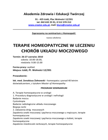 Akademia Zdrowia i Edukacji Twórczej 91 ‐ 425 Łódź, Plac Wolności 12/201 tel. 042 632 25 91, 0 512 370 212 www.creator.edu.pl, mail: [email protected] Zapraszamy na seminarium z Homeopatii nazwa szkolenia: TERAPIE HOMEOPATYCZNE W LECZENIU CHORÓB UKŁADU MOCZOWEGO Termin: 26‐27 czerwiec 2010 sobota: 10.00‐18.00, niedziela: 9.00‐15.00 Forma pracy: wykład. Miejsce: Łódź, Pl. Wolności 12/201 Prowadzenie: lek. med. Zenobiusz Żołnowski ‐ homeopata z ponad 40 letnim doświadczeniem, z tytułem Master of Homeopathy PROGRAM SEMINARIUM A. Terapie homeopatyczne w urologii 1. Procedury diagnostyczne w urologii i nefrologii Badanie moczu Cystoskopia Badanie radiologiczne układu moczowego Biopsja nerki 2. Zakażenia dróg moczowych Zapalenia cewki moczowej i pęcherza moczowego u mężczyzn, terapie homeopatyczne Zapalenie cewki moczowej i pęcherza moczowego u kobiet, terapie homeopatyczne Zapalenie miedniczek nerkowych, terapie homeopatyczne Kamica układu moczowego i kolka nerkowa, terapie homeopatyczne 3. Prostatizm Zapalenie prostaty, terapie homeopatyczne Przerost gruczołu krokowego, terapie homeopatyczne 4. Nowotwory dróg moczowych B. Terapie homeopatyczne w nefrologii Odmiedniczkowe zapalenie nerek, terapie homeopatyczne Zapalenie kłębuszków nerkowych, terapie homeopatyczne Nerczyca, terapie homeopatyczne Torbielowatość nerek, trapie homeopatyczne Nefropatie Ostra i przewlekła niewydolność nerek C. Leki homeopatyczne stosowane w leczeniu chorób układu moczowego Materia Medica Homeopathica Leki kompleksowe i leki antyhomotoksyczne Cena: 220 zł Zapisy i informacje: 042 632 25 91, lub 512 370 212, [email protected]