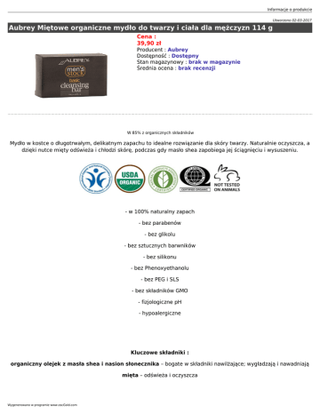Informacje o produkcie Utworzono 02-03-2017 Aubrey Miętowe organiczne mydło do twarzy i ciała dla mężczyzn 114 g Cena : 39,90 zł Producent : Aubrey Dostępność : Dostępny Stan magazynowy : brak w magazynie Średnia ocena : brak recenzji W 85% z organicznych składników Mydło w kostce o długotrwałym, delikatnym zapachu to idealne rozwiązanie dla skóry twarzy. Naturalnie oczyszcza, a dzięki nutce mięty odświeża i chłodzi skórę, podczas gdy masło shea zapobiega jej ściągnięciu i wysuszeniu. - w 100% naturalny zapach - bez parabenów - bez glikolu - bez sztucznych barwników - bez silikonu - bez Phenoxyethanolu - bez PEG i SLS - bez składników GMO - fizjologiczne pH - hypoalergiczne Kluczowe składniki : organiczny olejek z masła shea i nasion słonecznika – bogate w składniki nawilżające; wygładzają i nawadniają mięta – odświeża i oczyszcza Wygenerowano w programie www.oscGold.com Składniki: Sodium palmate*, sodium cocoate*, water, glycerin*, butyrospermum parkii (shea butter)*, helianthus annuus (sunflower) seed oil*, olea europaea (olive) fruit oil*, sodium citrate, menthol. *Składniki organiczne